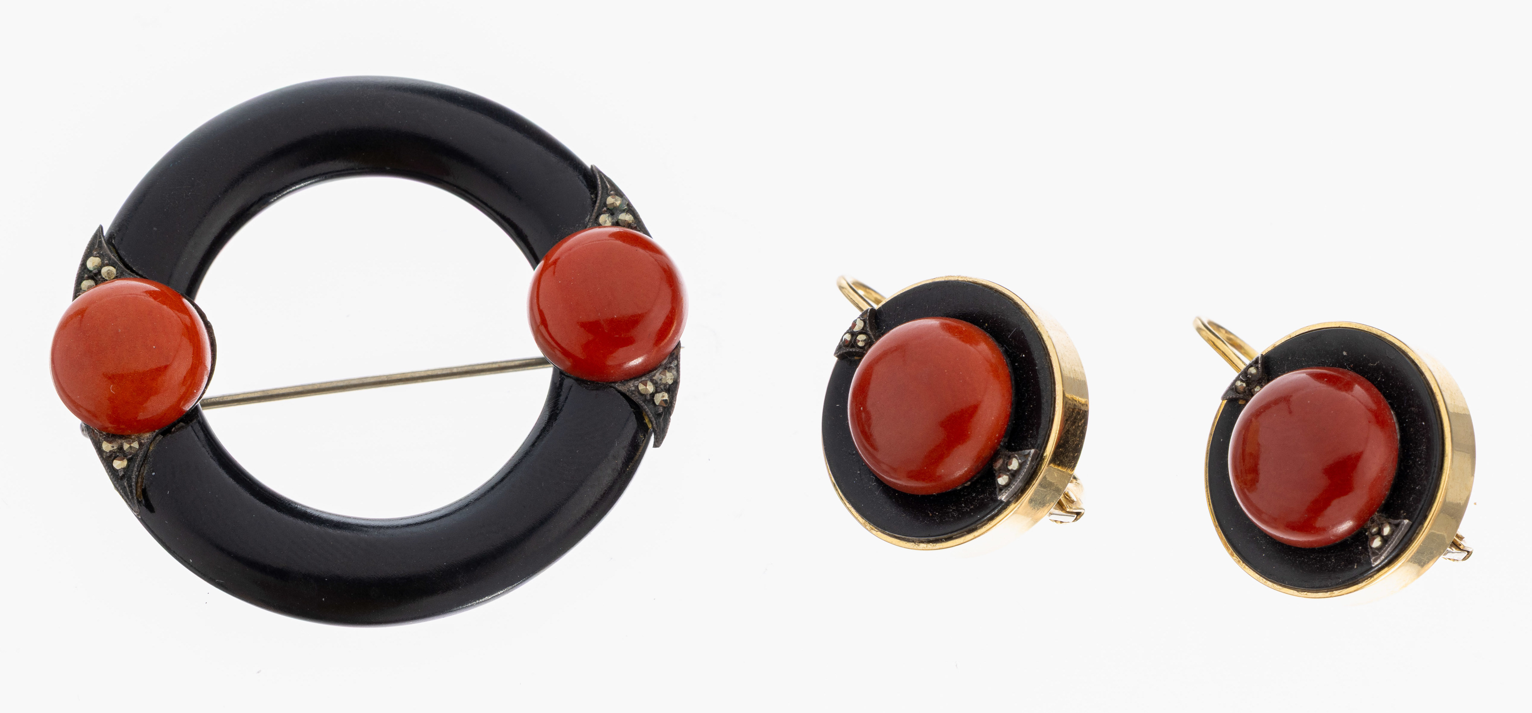 Kreis aus schwarzem Bakelit, 2 runde Korallen-Cabochons, kl. Markasiten, ca. 4.4