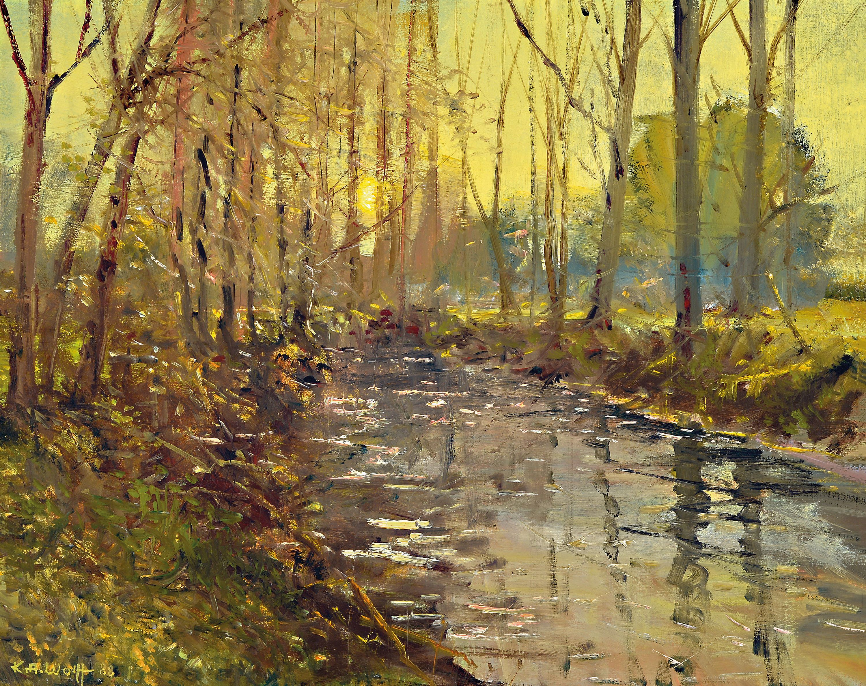 Karl August Wolff, 1938-2023, "Die Queich im Abendlicht", signiert und datiert 1988,