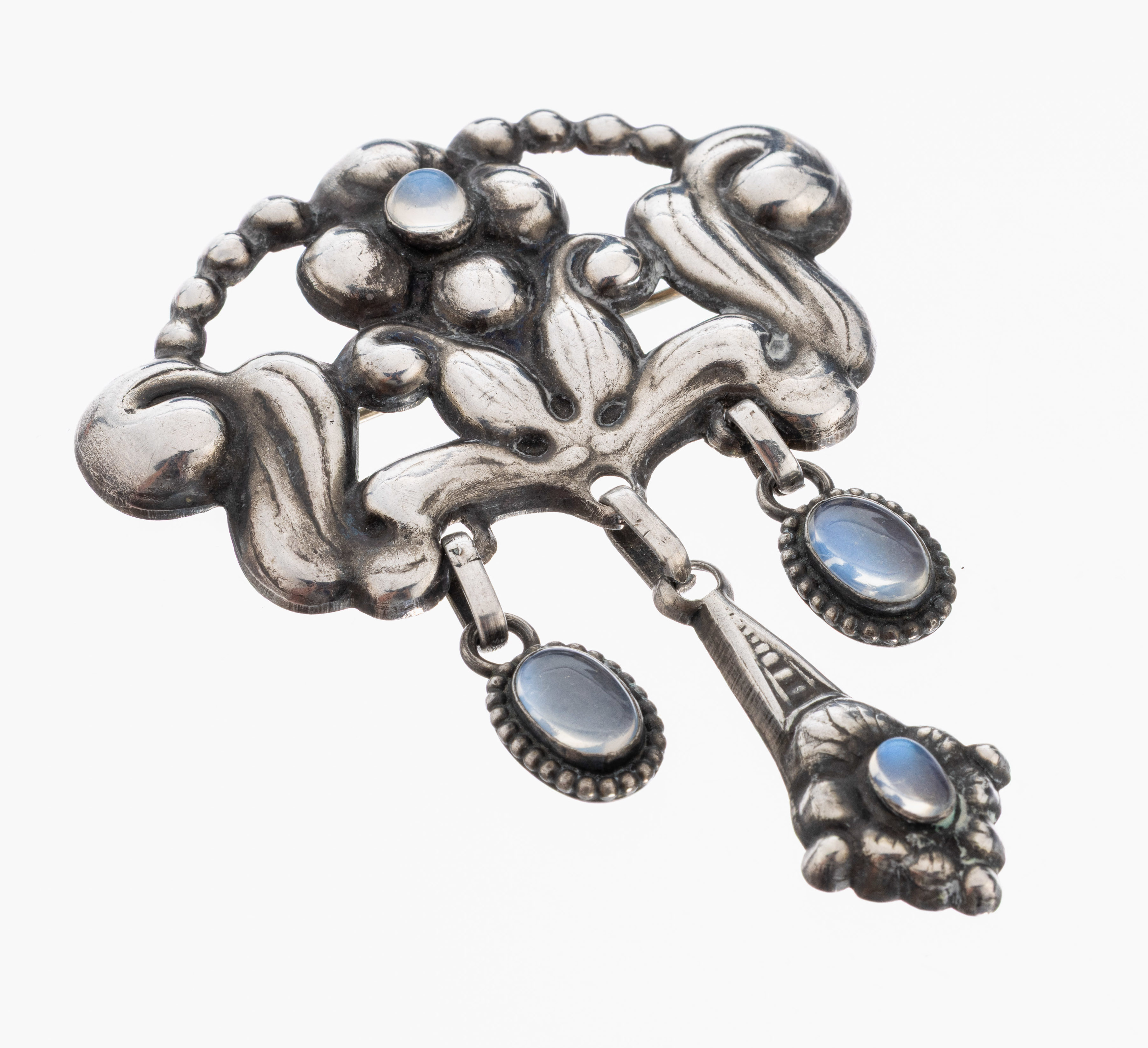 Mondstein-Brosche, 1930er Jahre, 830er Silber, floral mit 3 bewegl. Abhängungen,