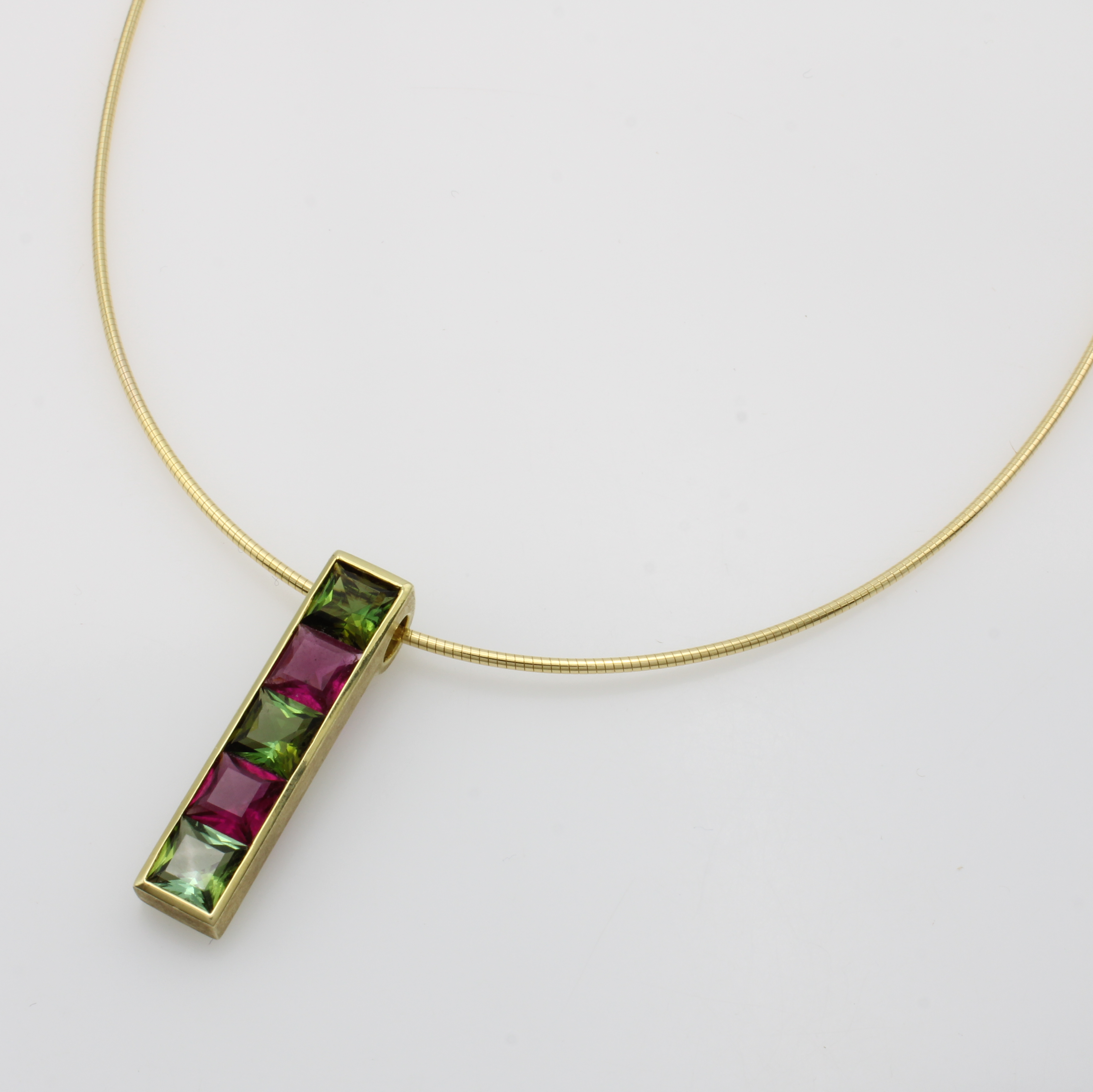 Anhänger mit Turmalinen an Omegareif, GG 585/000, rote u. grüne Turmalincarrées zus. ca. 6.03 ct, L. ca. 50.5 cm Schätzpreis: 6500, - EUR