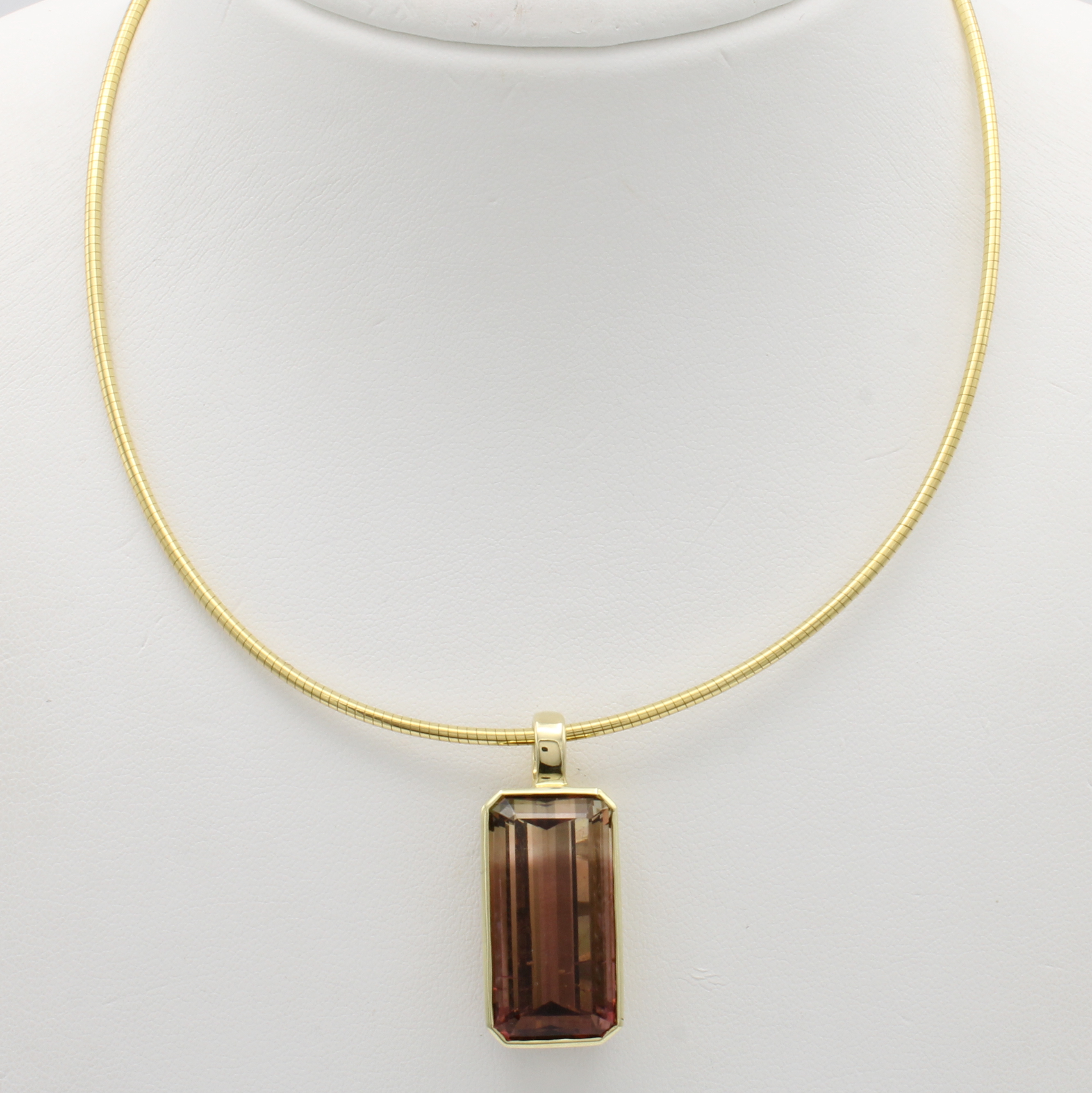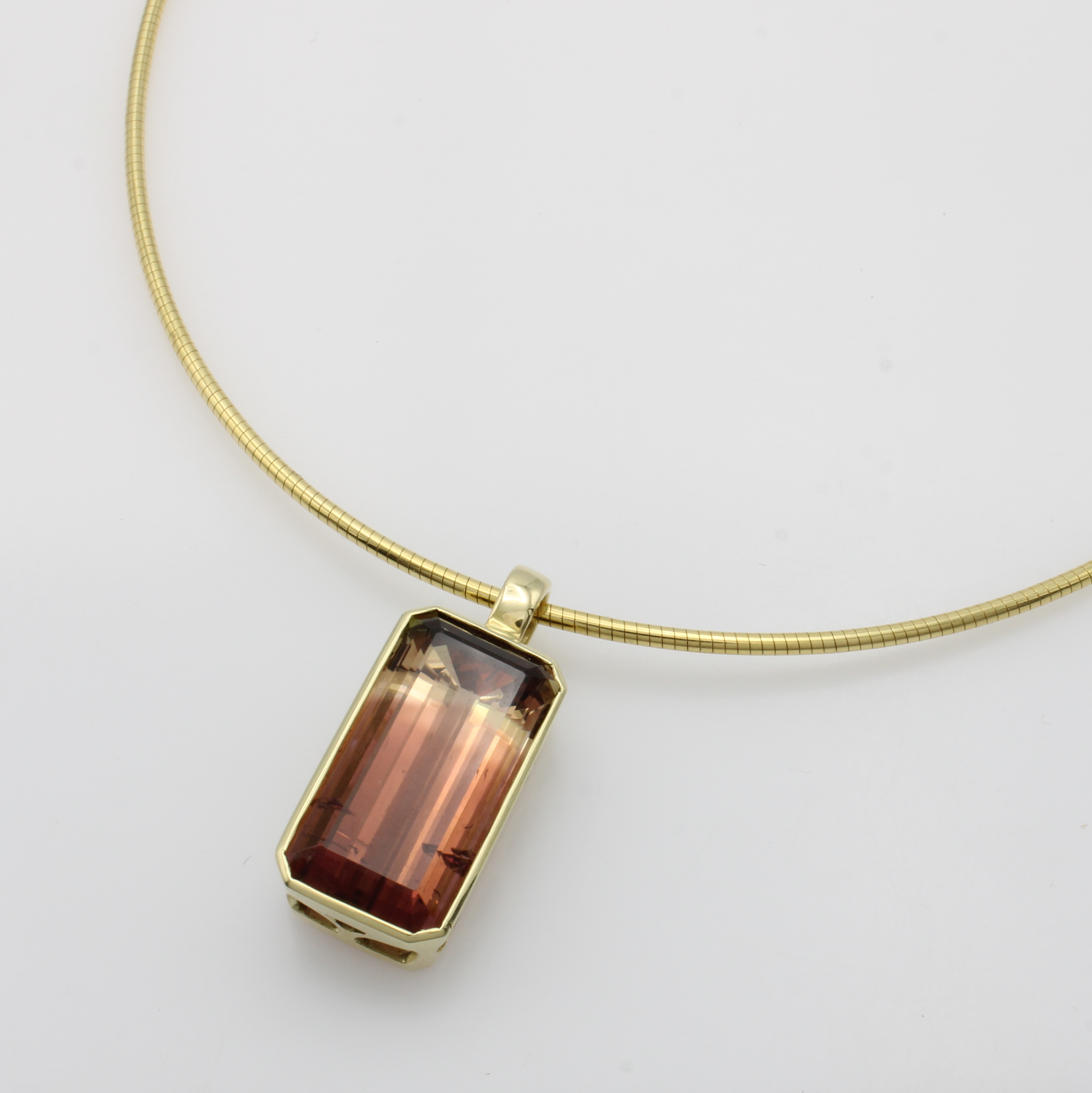 Anhänger mit Turmalin an Omegareif, GG 585/ 000, brauner Turmalin im l. Farbverlauf ca. 26.6 ct, L. ca. 42 cm Schätzpreis: 12500, - EUR