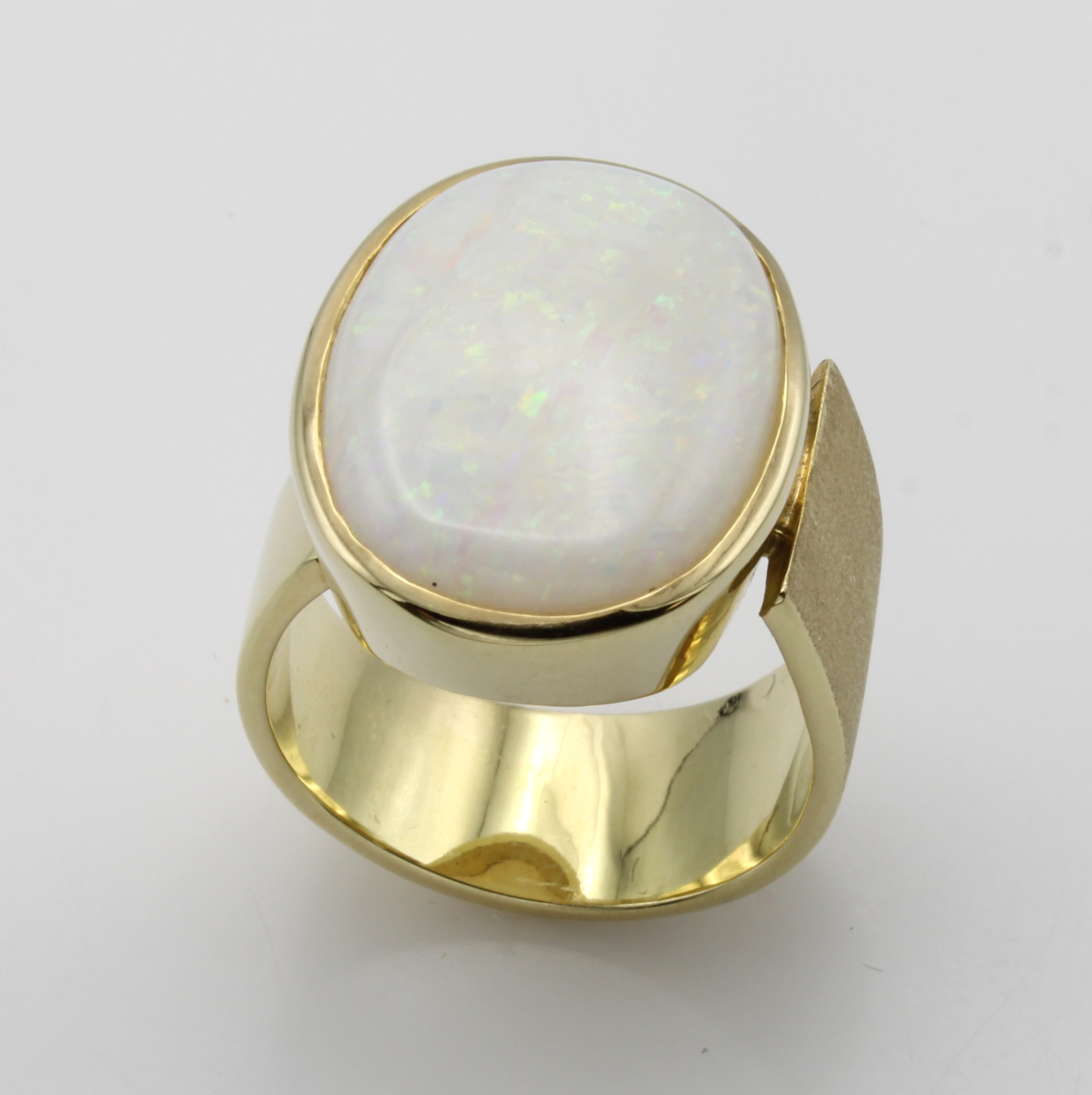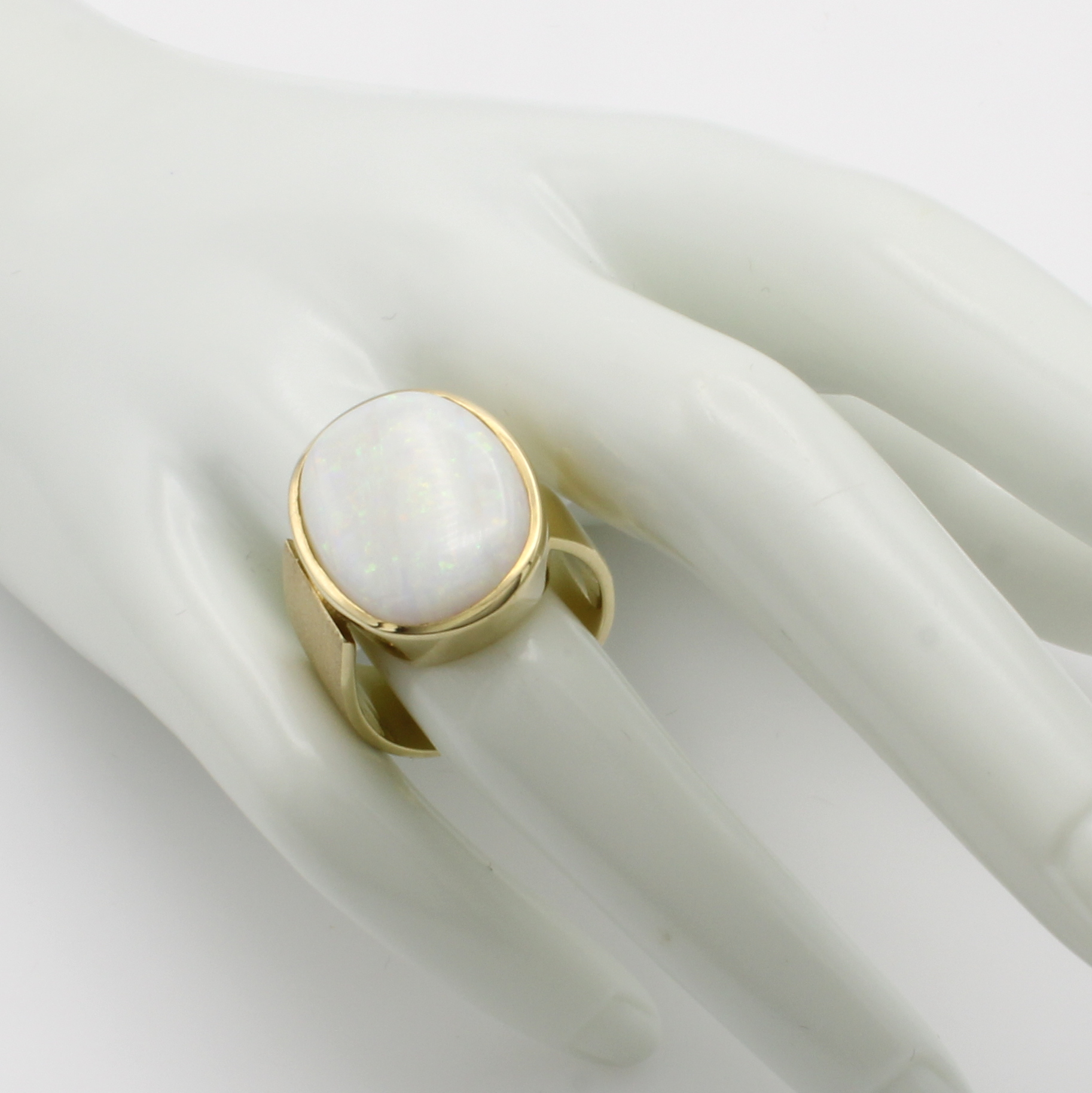 Ring mit Opal, GG 585/000, Schiene z.T. matt. u. asymmetrisch anges., ovaler Opal ca. 9.5 ct, RW ca. 58 Schätzpreis: 5300, - EUR