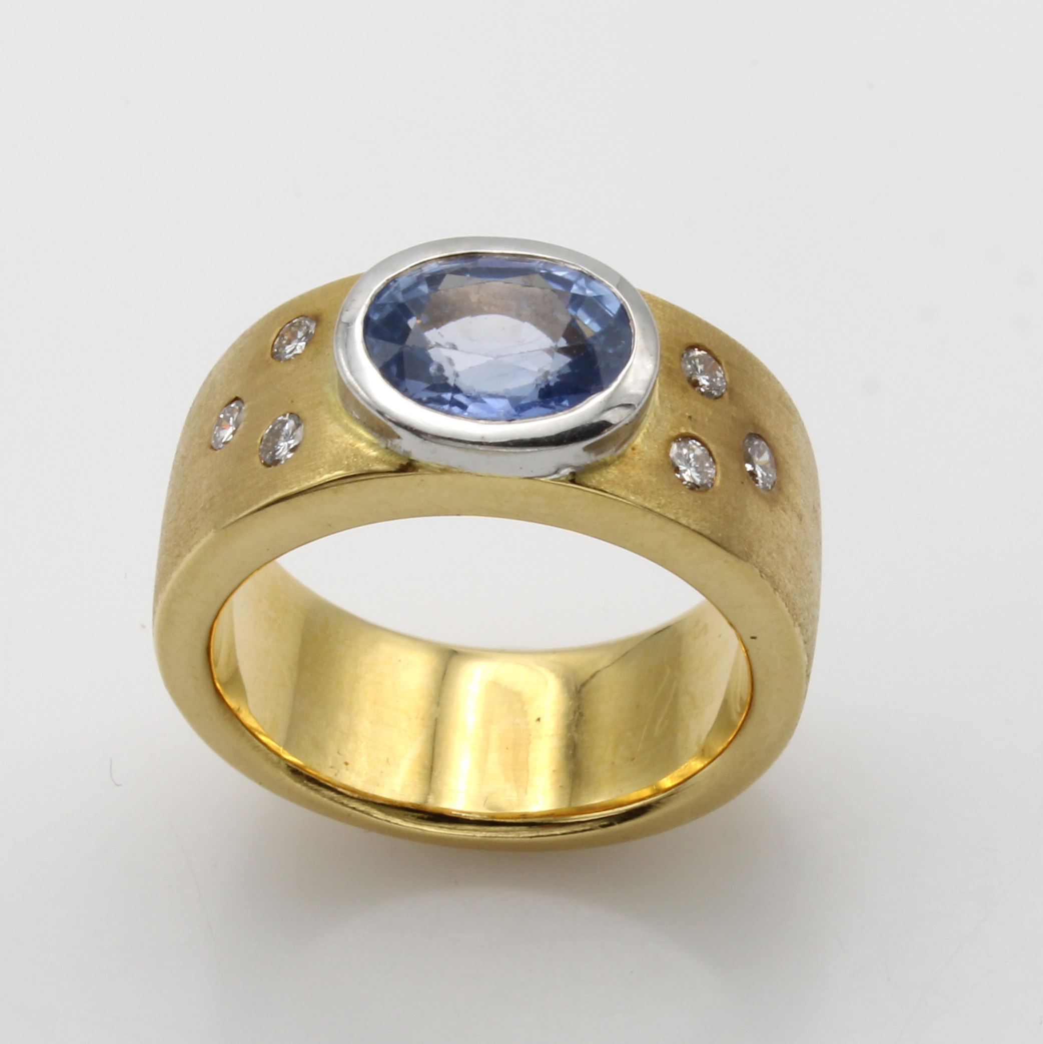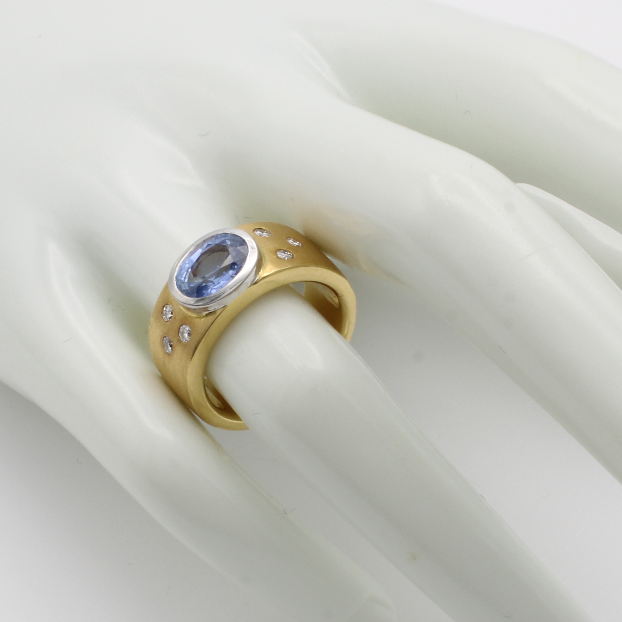 Ring mit Saphir und Brillanten, GG 750/000, z.T. matt., ovaler Saphir ca. 2.72 ct, 6 Brill. zus. ca. 0.23 ct feines Weiß/si, RW ca. 55 Schätzpreis: 8700, - EUR