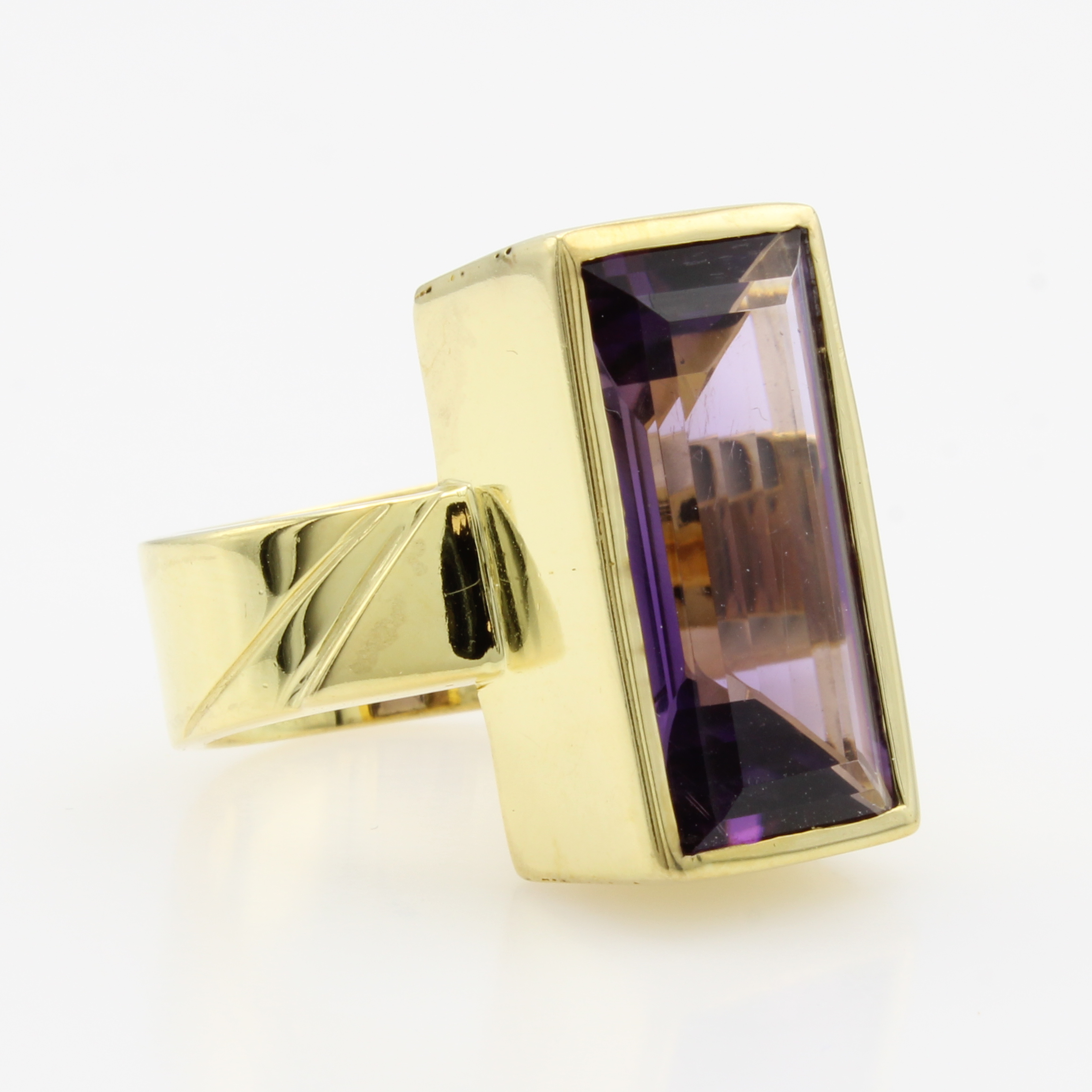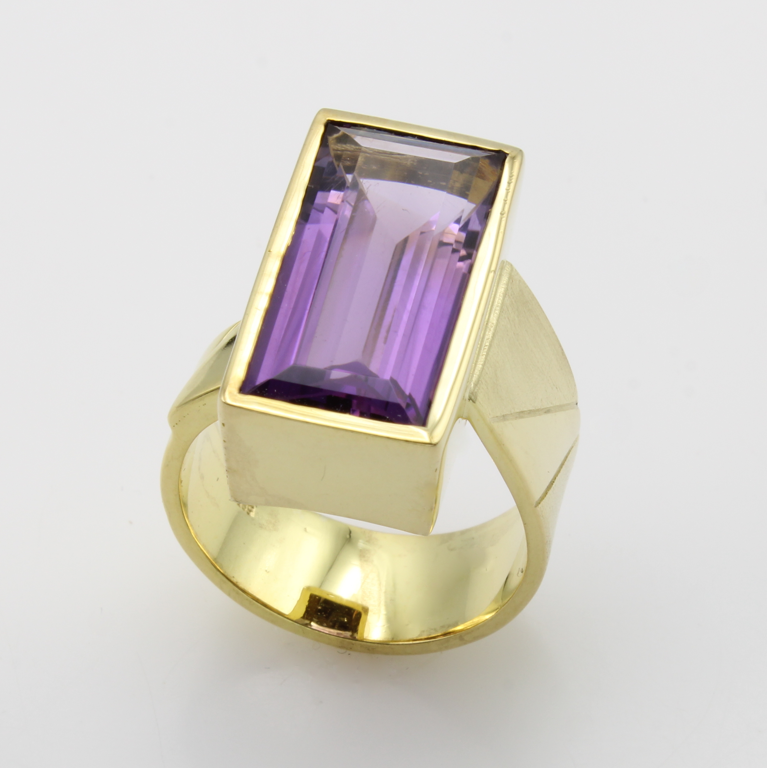 Ring mit Amethyst, GG 585/000, Schiene z.T. matt. u. asymmetrisch anges., rechteckiger Amethyst ca. 8.24 ct, RW ca. 53 Schätzpreis: 4200, - EUR
