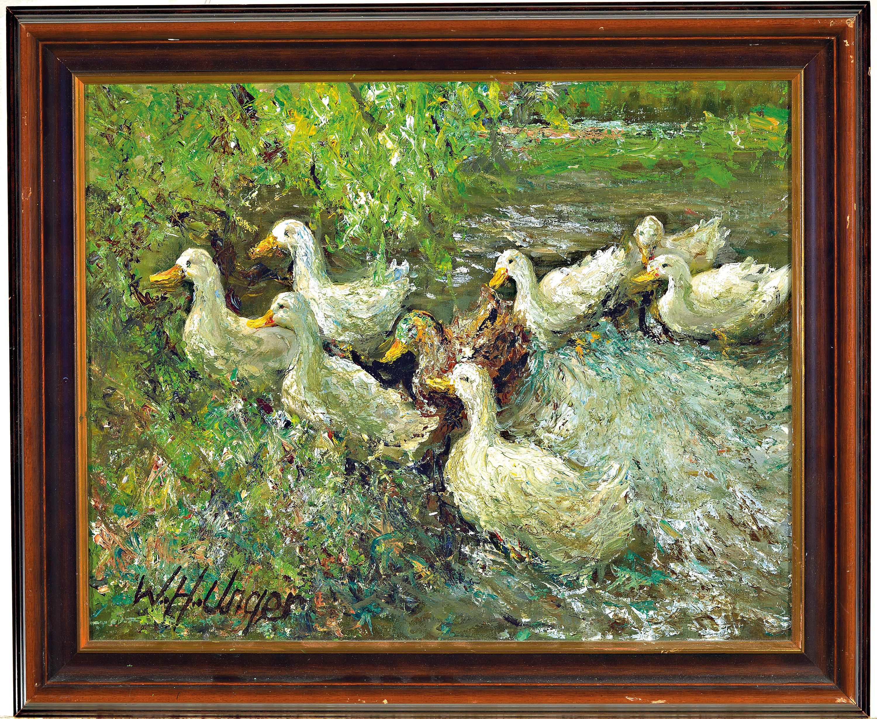 Wolfgang Heinz Unger, 1929-2019, "Enten am Ufer", Öl/Masonit, signiert, 40x50 cm,