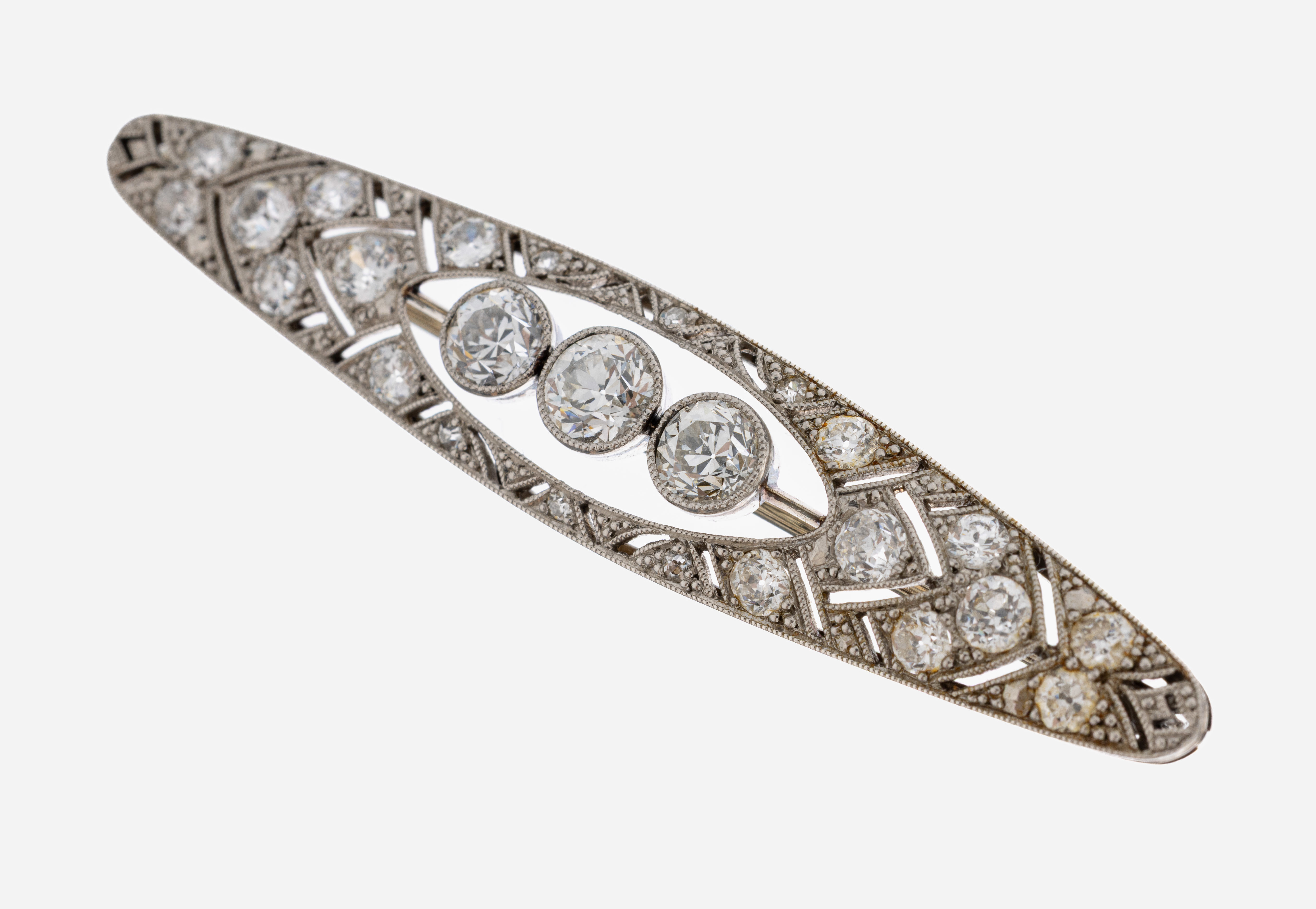 14 kt Gold Art Deco Diamant-Brosche, um 1930, WG 585/000, länglich oval, durchbrochen