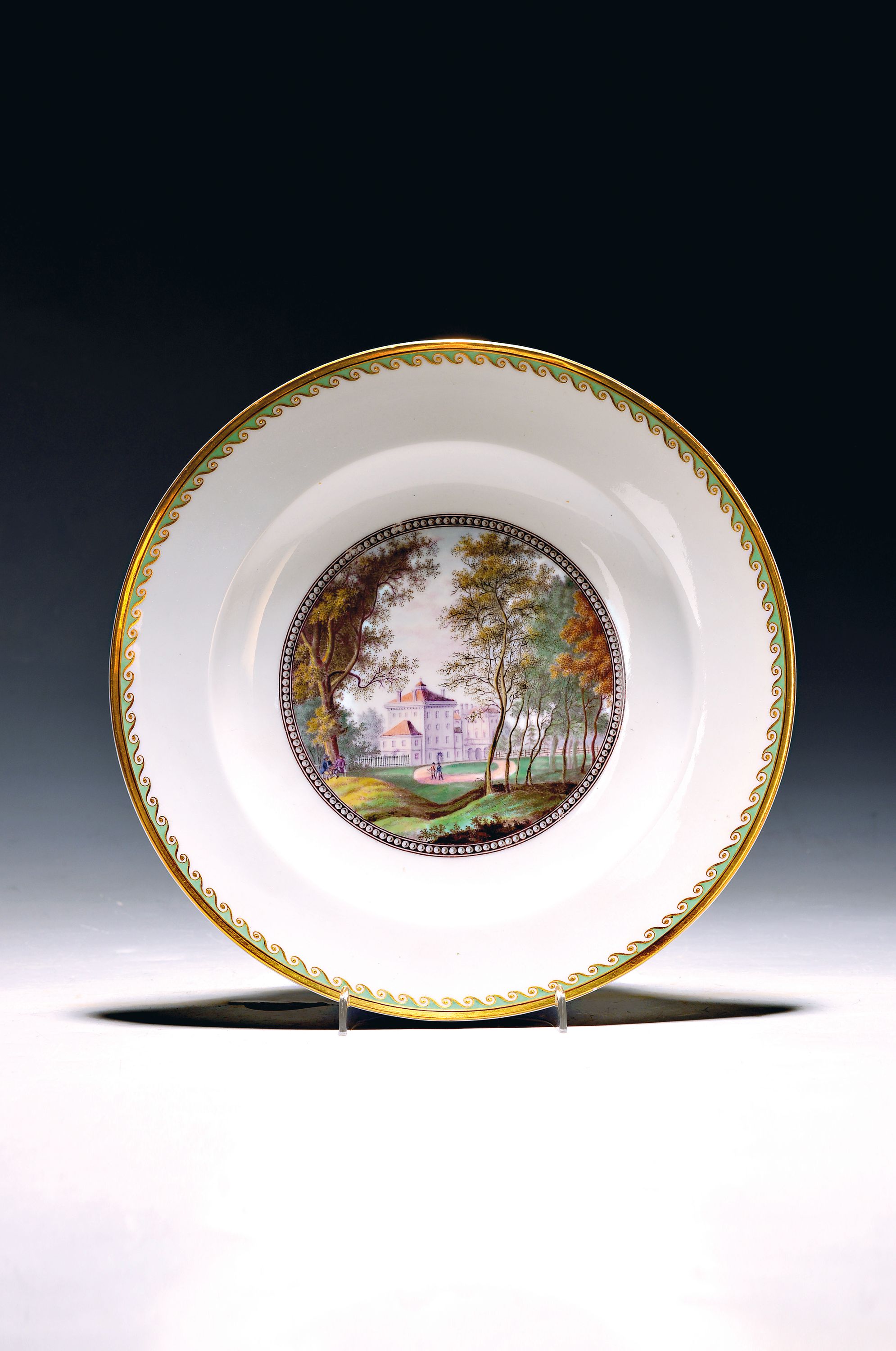 Ansichtsteller, KPM Berlin, um 1780, Schloß mit Parklandschaft und Spaziergängern,