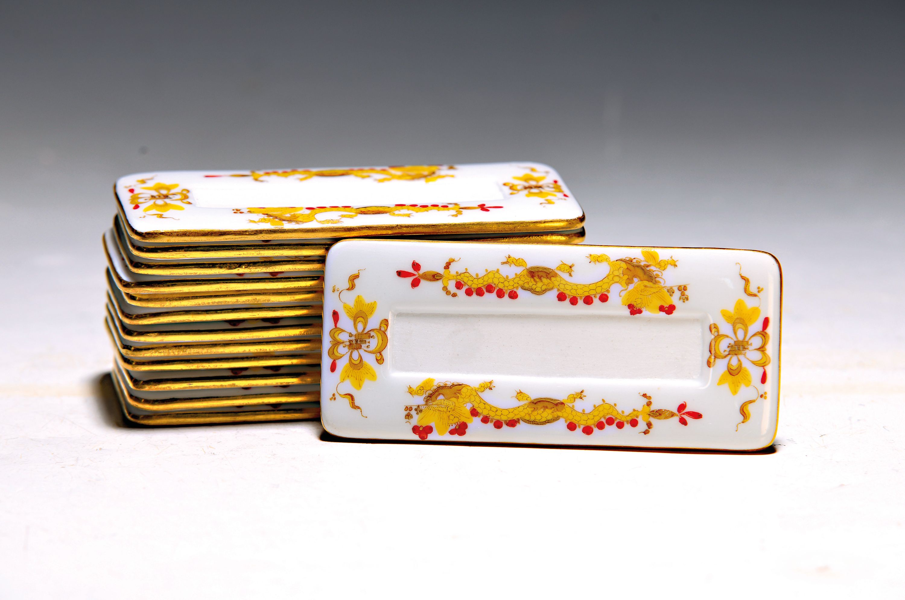 13 Seltene Tischschilder/Tischkarten aus Porzellan, Meissen, 30er Jahre, gelber Drache,