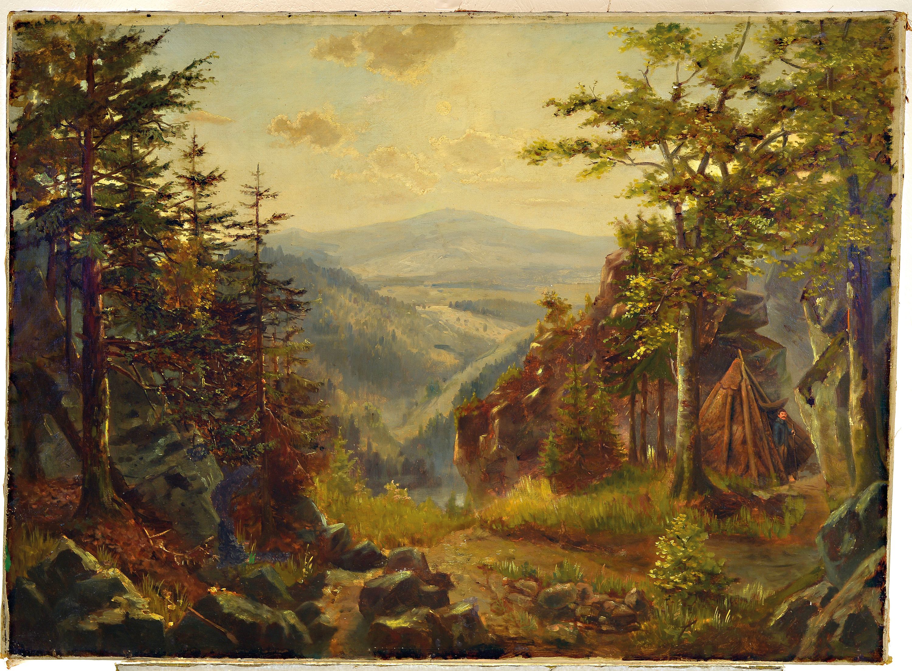 ins Tal, rechts ein Jäger vor seinem Zelt, Öl/Lwd, rest., ca. 75x102cm