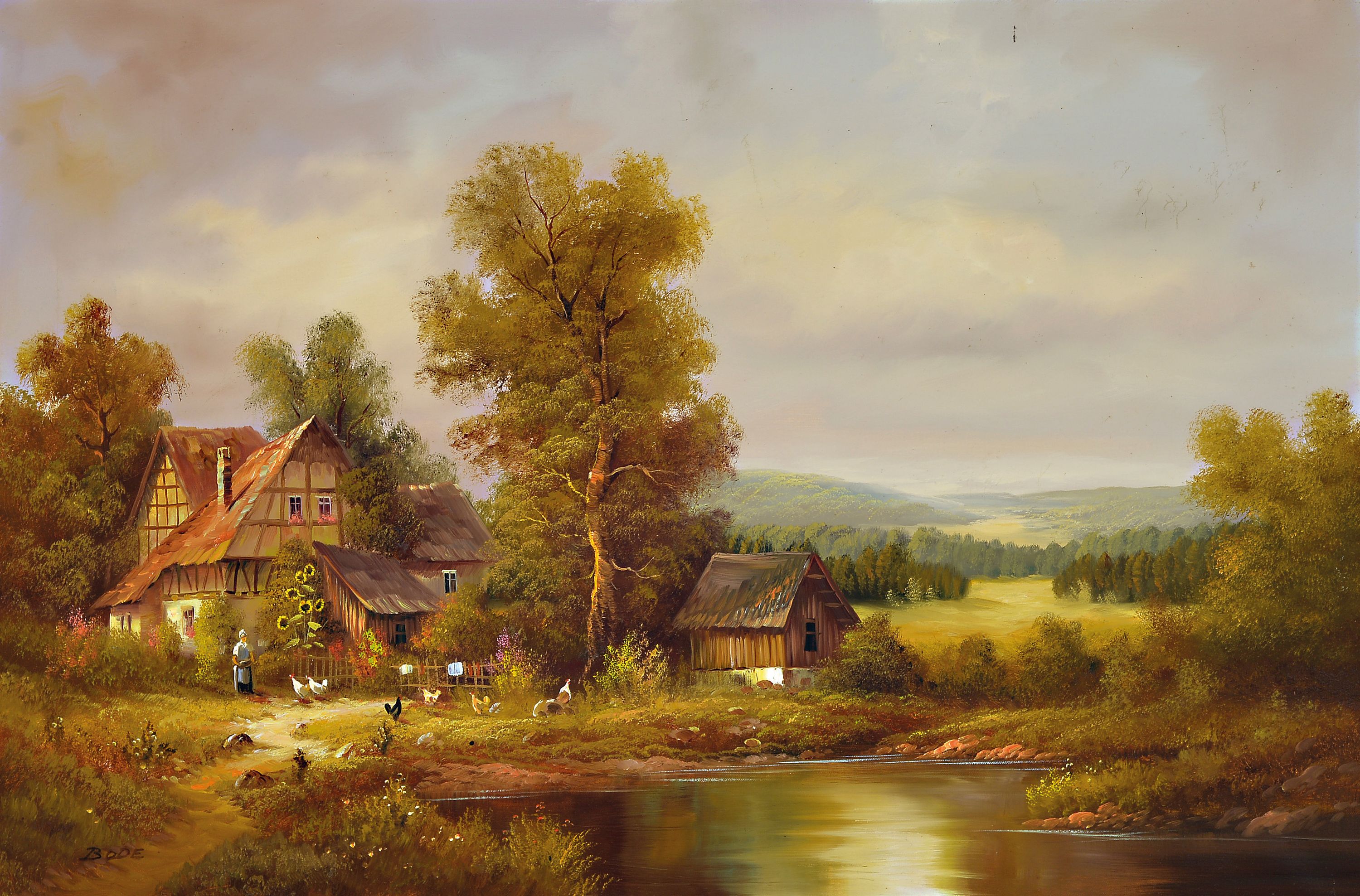 Johann Daniel Bode, Künstler des 20.Jh., süddeutsche Landschaft mit Gehöft an