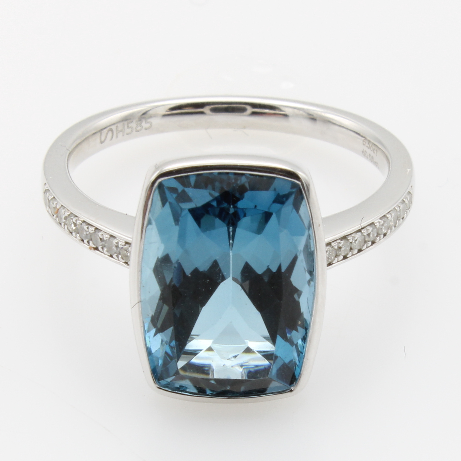 Ring mit Blautopas und Brillanten, WG 585/ 000, Topas (beh.) ca. 6.56 ct, 16 Brill. zus. ca. 0.08 ct feines Weiß/si-p, RW ca. 55 Schätzpreis: 1300, - EUR