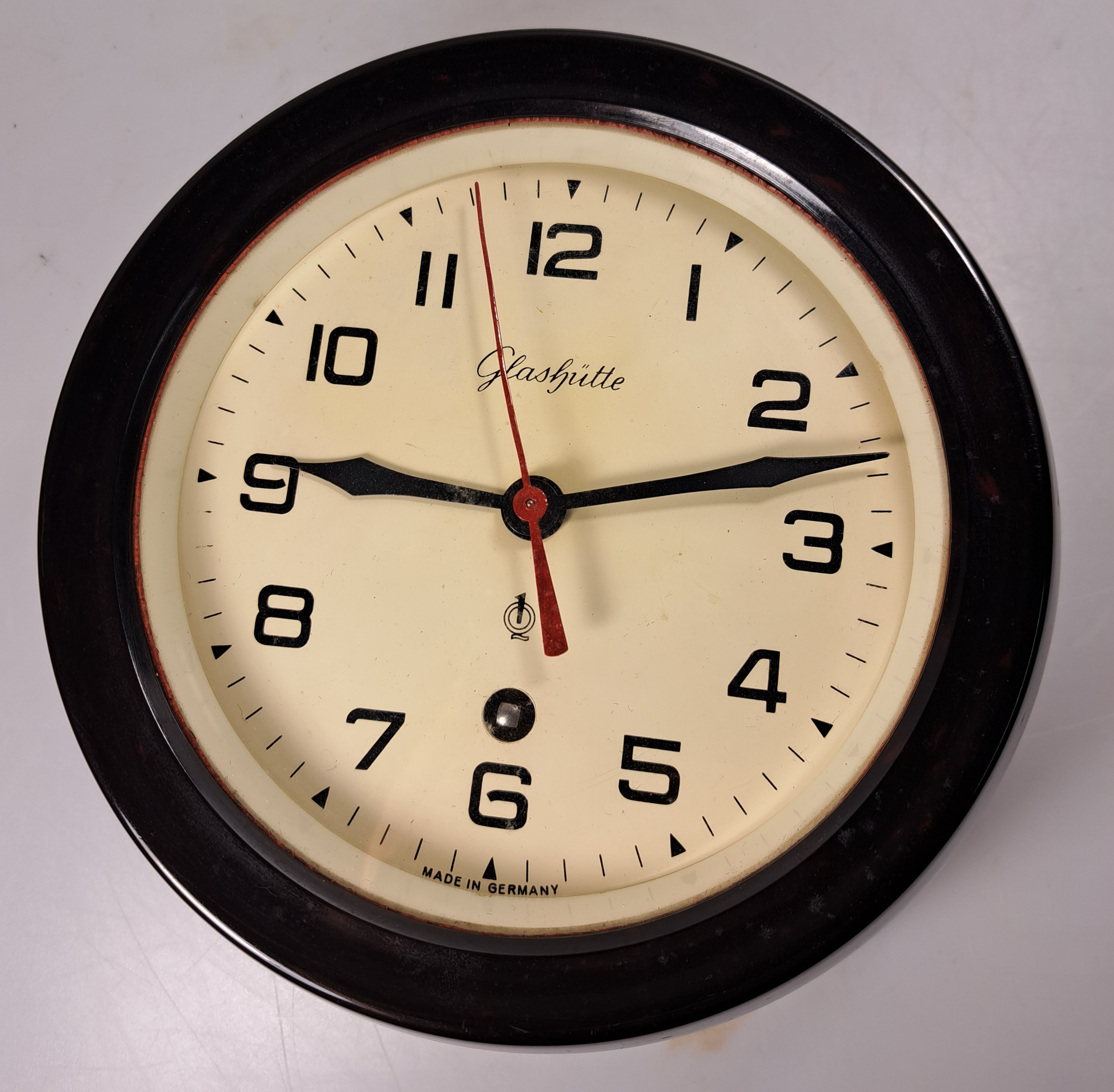 Schiffsuhr, Marke Glashütte, Bakelitgehäuse, Glasdeckel (zu öffnen mit Uhrschlüssel,
