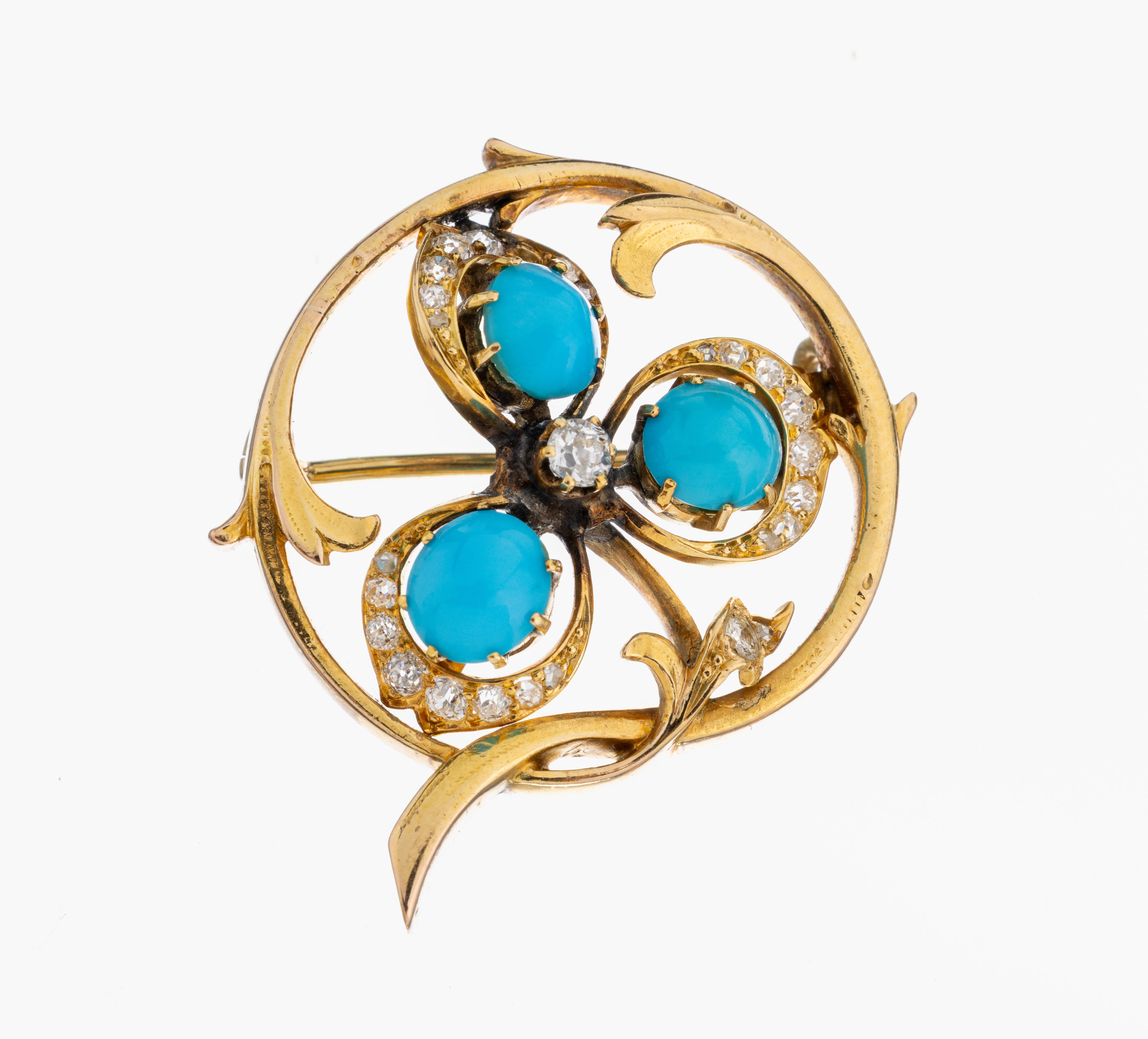 14 kt Gold Türkis-Diamant-Brosche, GG 585/000, um 1900, 3 Türkiscabochons, Altschliff-