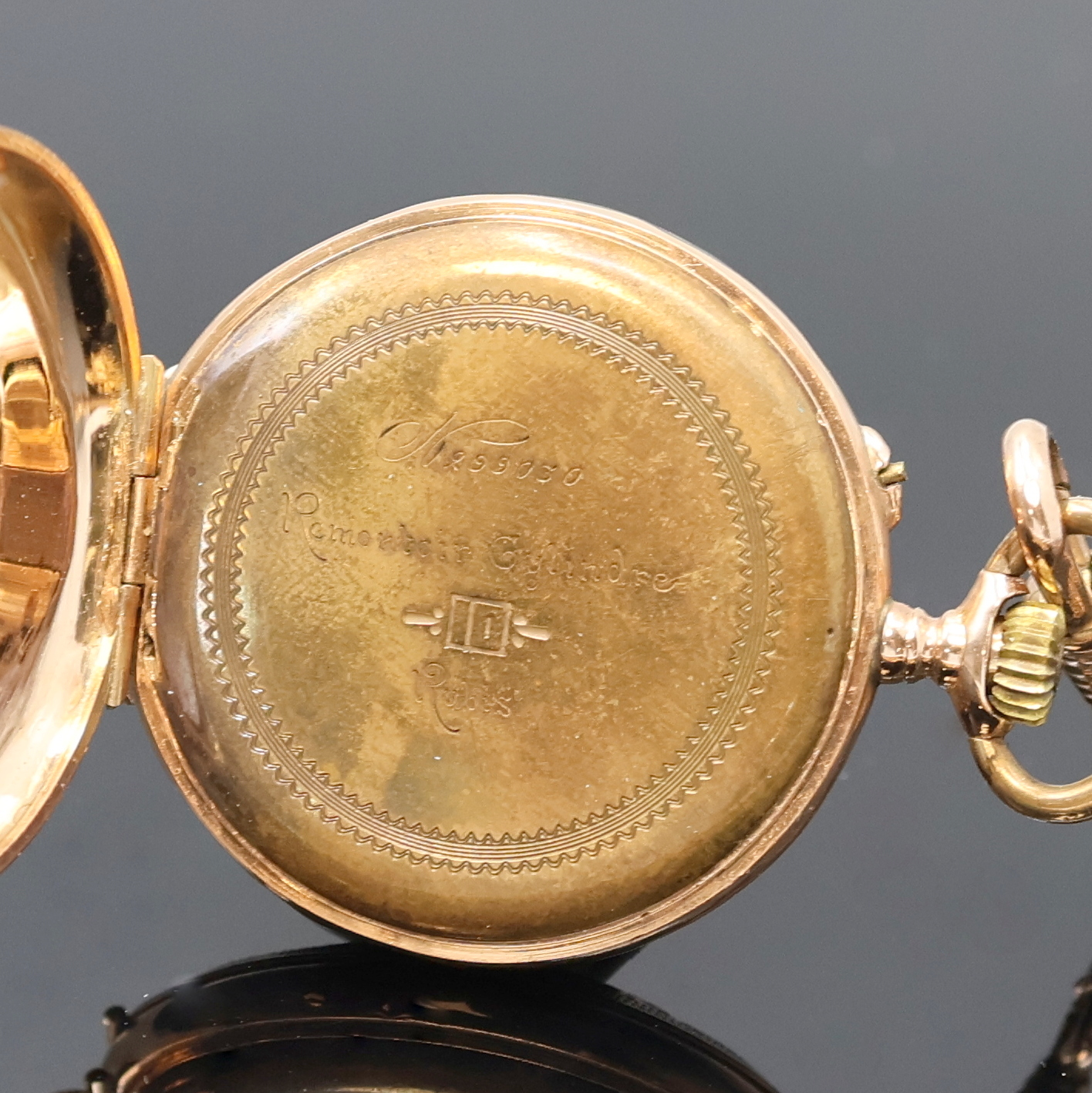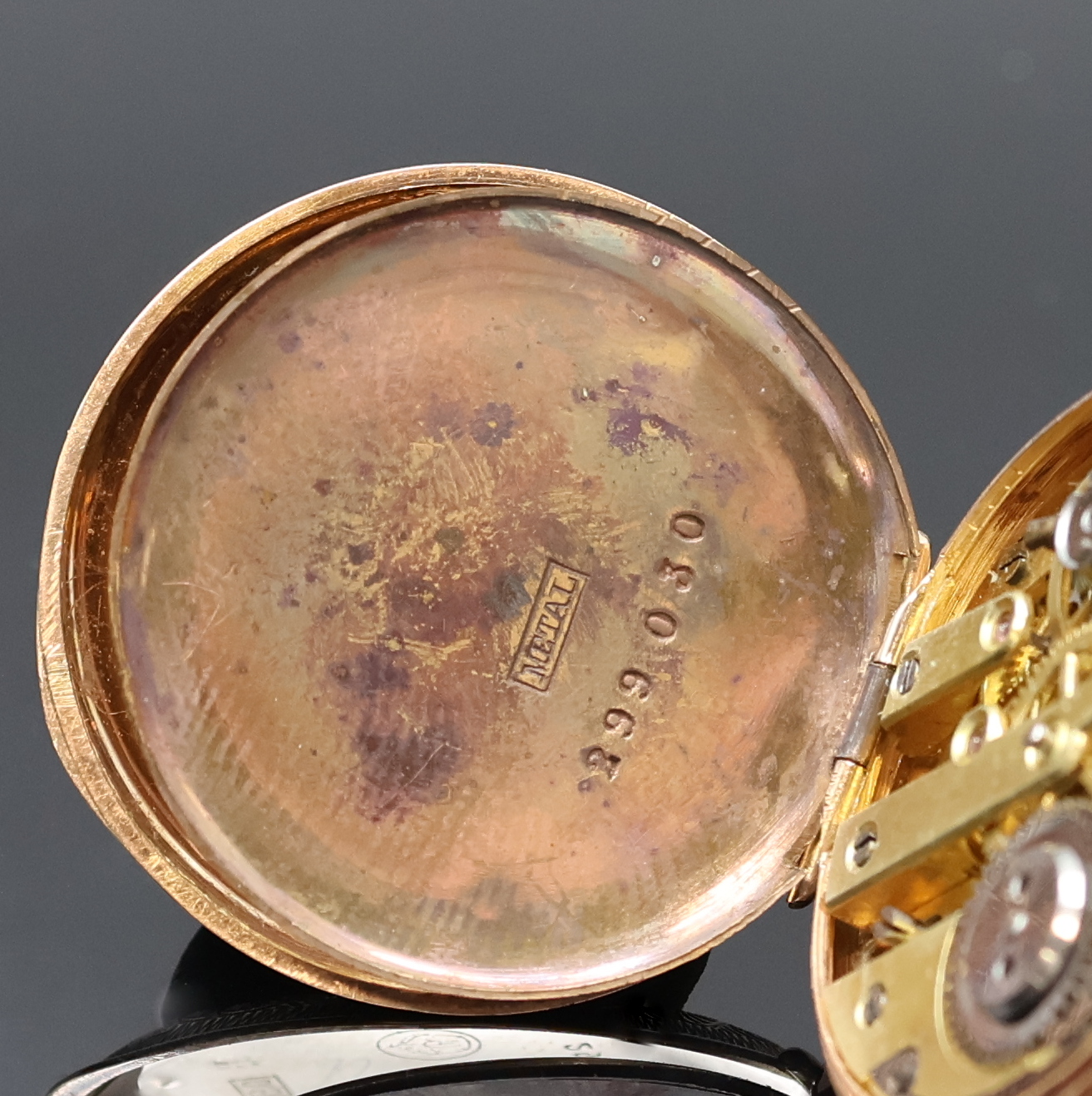 Offene Damentaschenuhr in RoseG 585/000 mit vergoldeter Kette, Schweiz um 1900, grav.