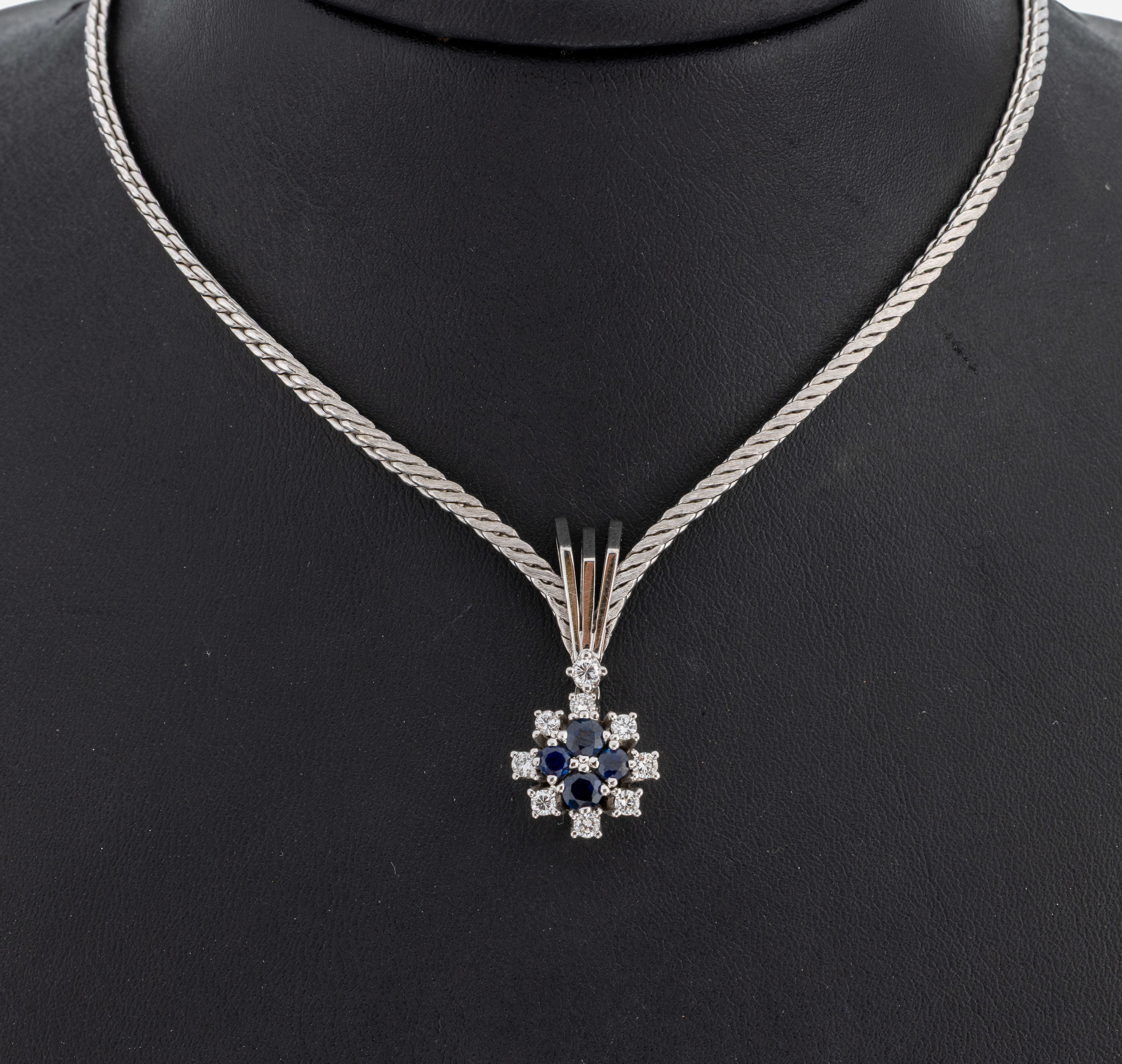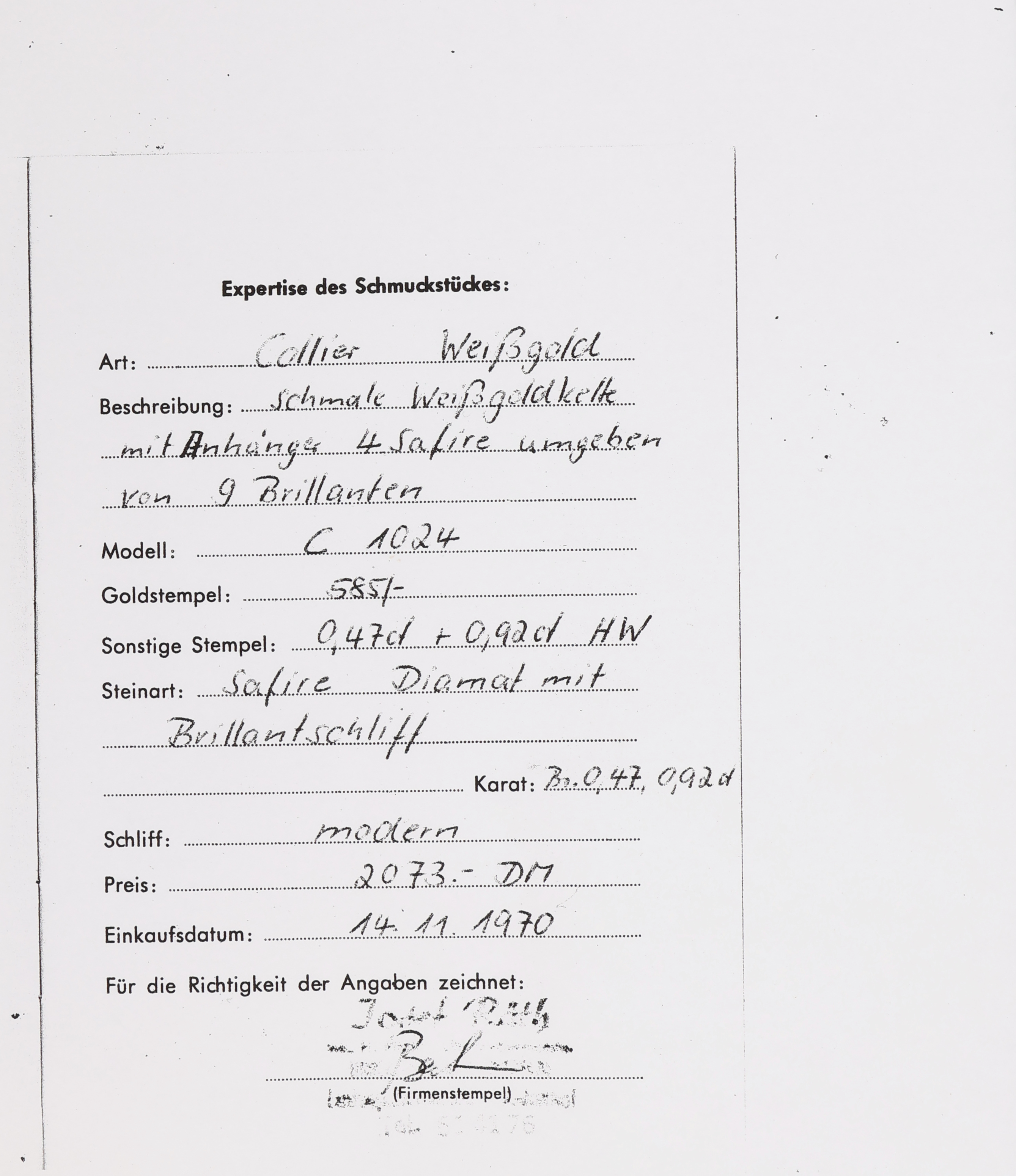 14 kt Gold Saphir-Brillant-Collier, WG 585/000, 4 rundfacett. Saphire zus. ca. 0.92