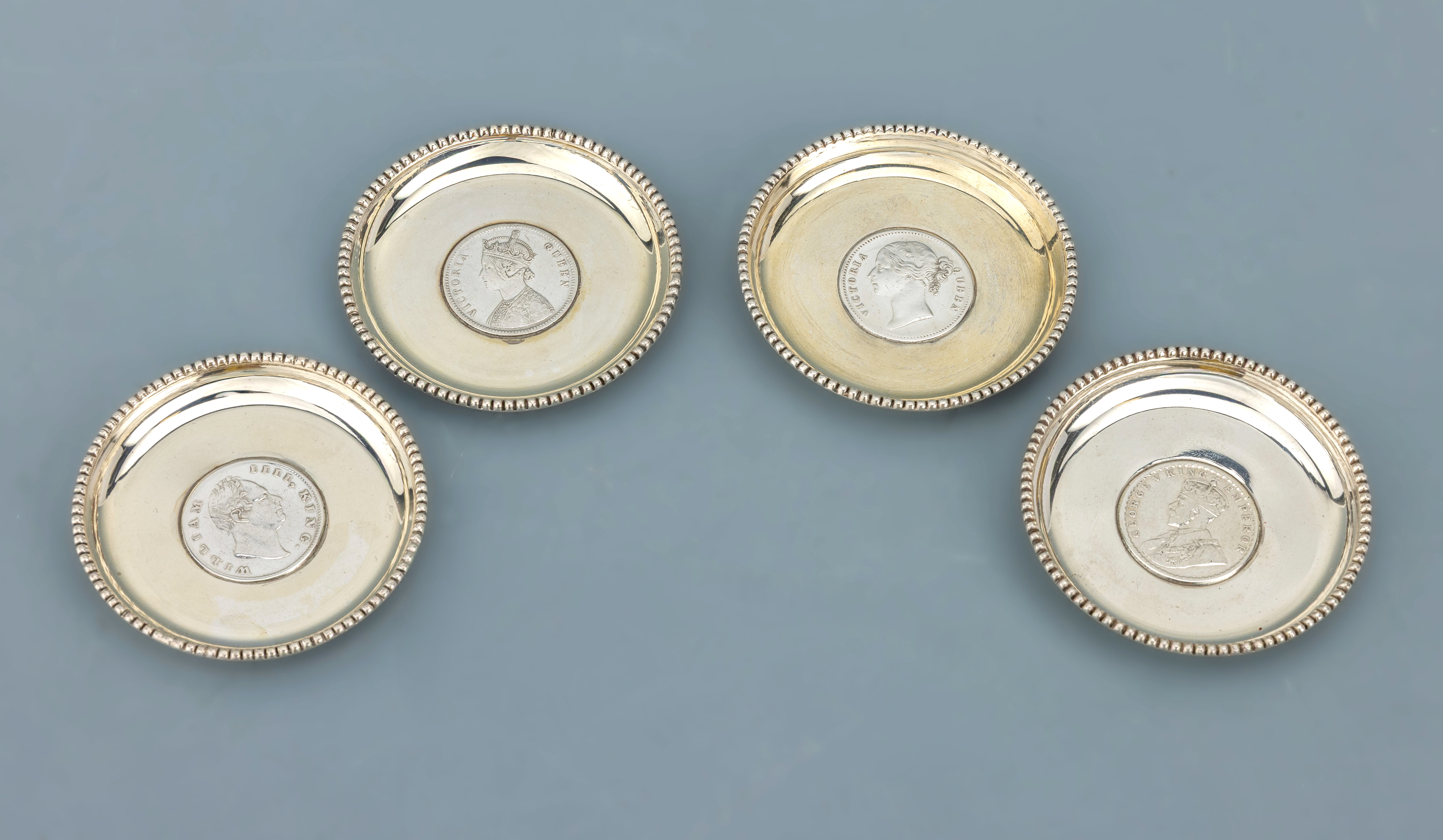 4 Münzteller, Silber, jew. mit eingelassener indischer Rupie, 1862 und 1840 Viktoria,