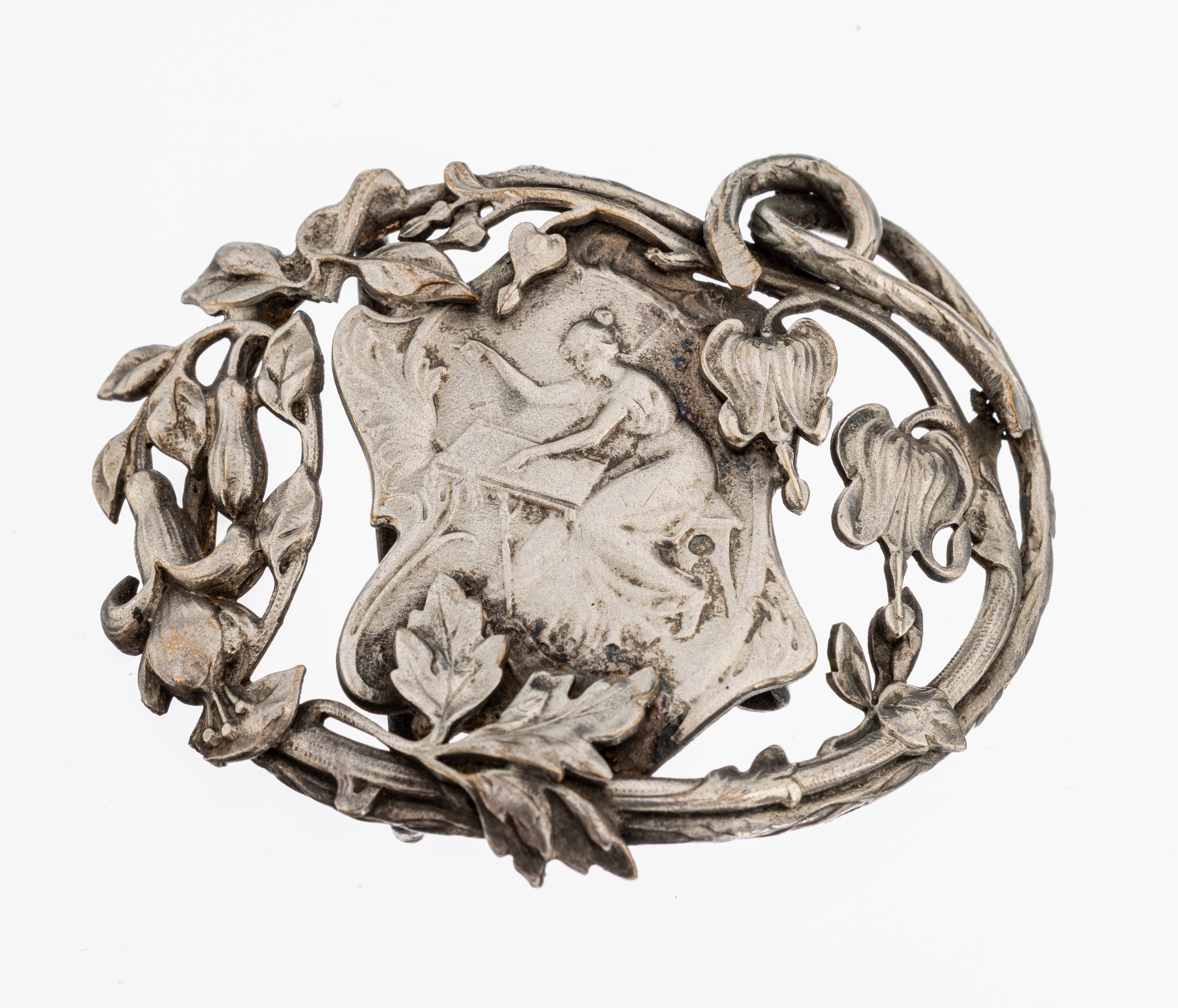 Jugendstil Gürtelschließe, Frankreich um 1900, Metall versilbert, Präsentation