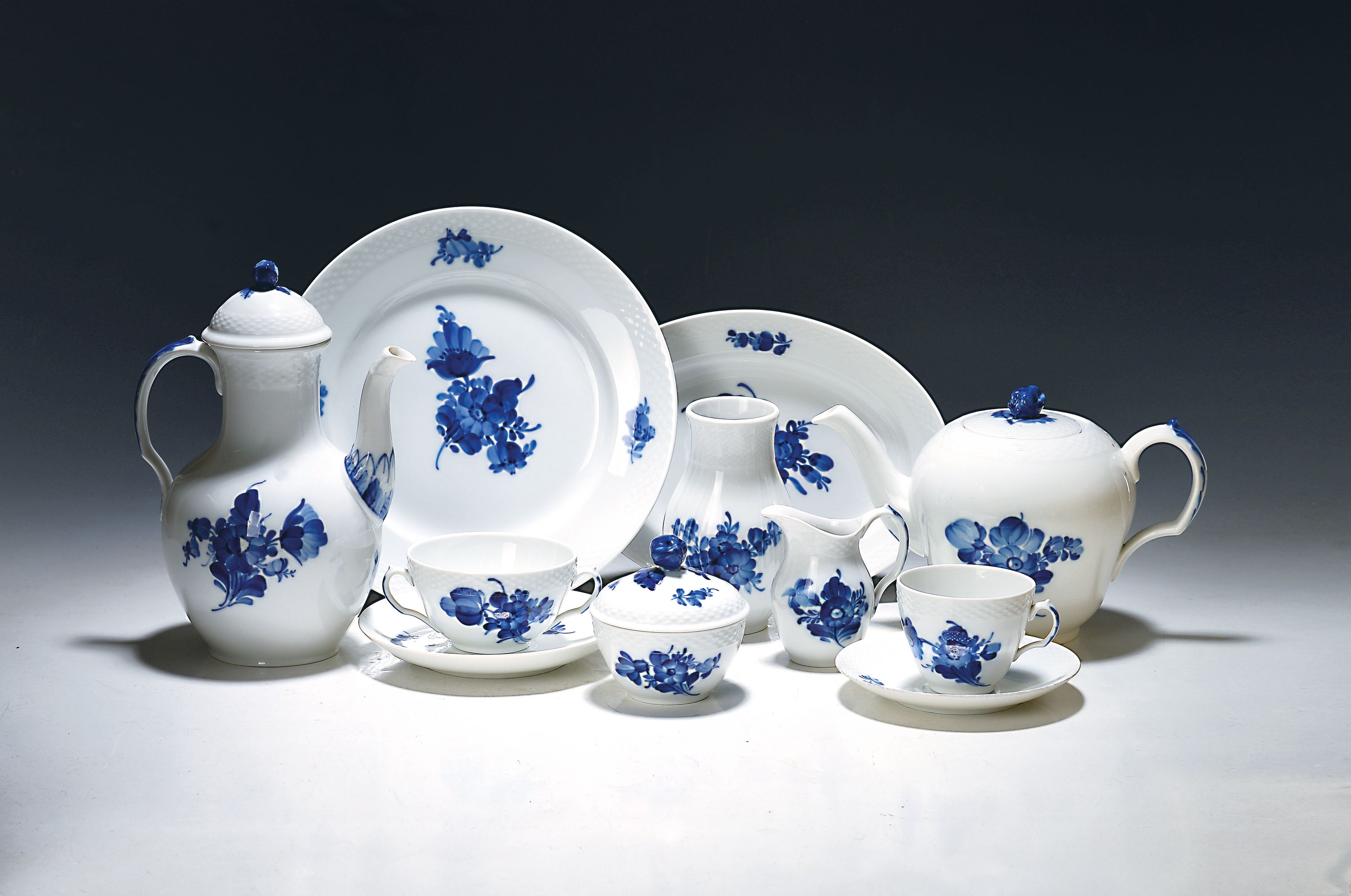 Tafelservice, Blaue Blume, Royal Copenhagen, Porzellan, 6 Kaffee- und 6 Teetassen