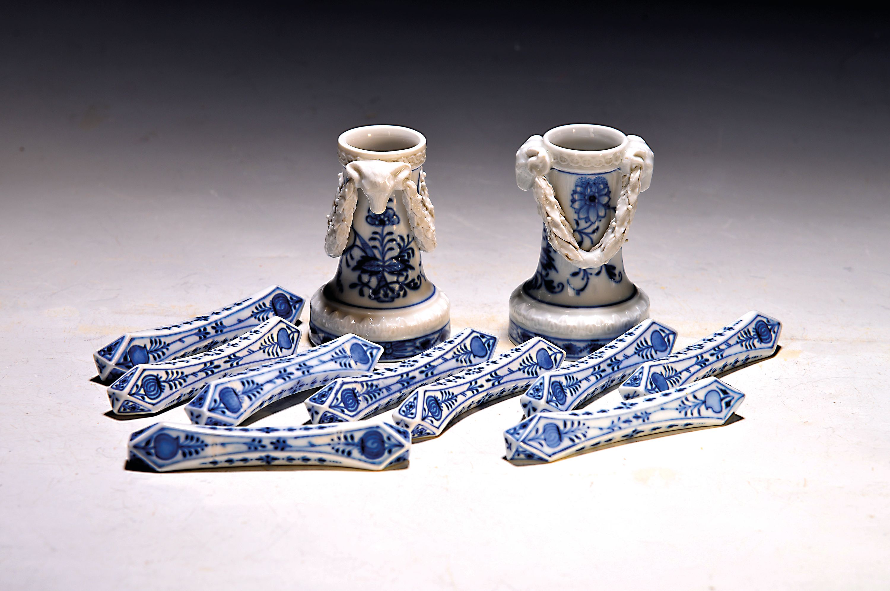 9 Messerbänkchen und ein Paar Leuchter, Meissen, 1. Hälfte 20.Jh., Zwiebelmuster,