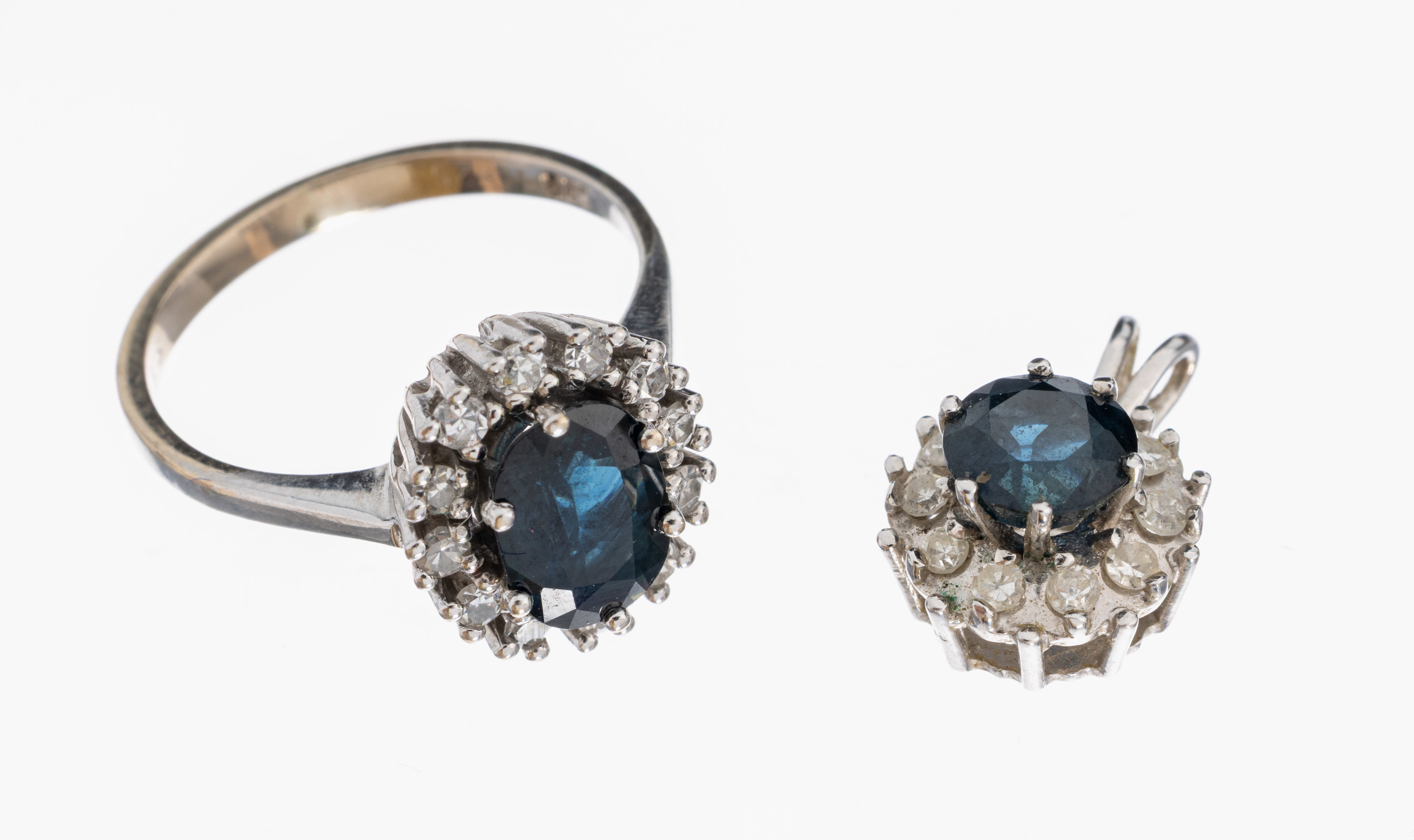 14 kt Gold Saphir-Diamant-Konvolut, WG 585/000, best. aus: 1 Ring, RW 49, und 1 Anhänger,