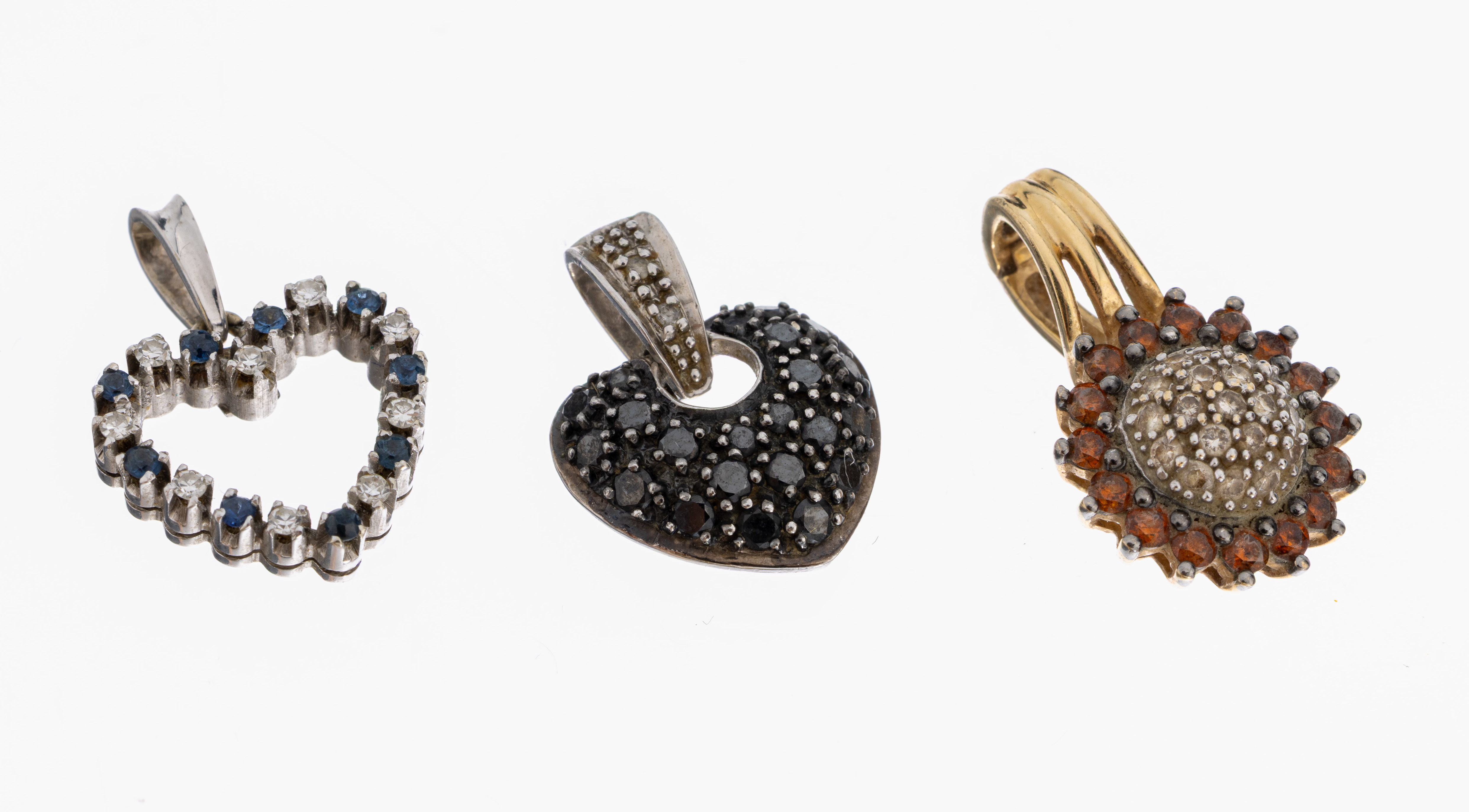 Konvolut 3 Farbstein-Diamant-Anhänger, 1 x WG 750/000, Herz, 9 rundfacett. Saphire