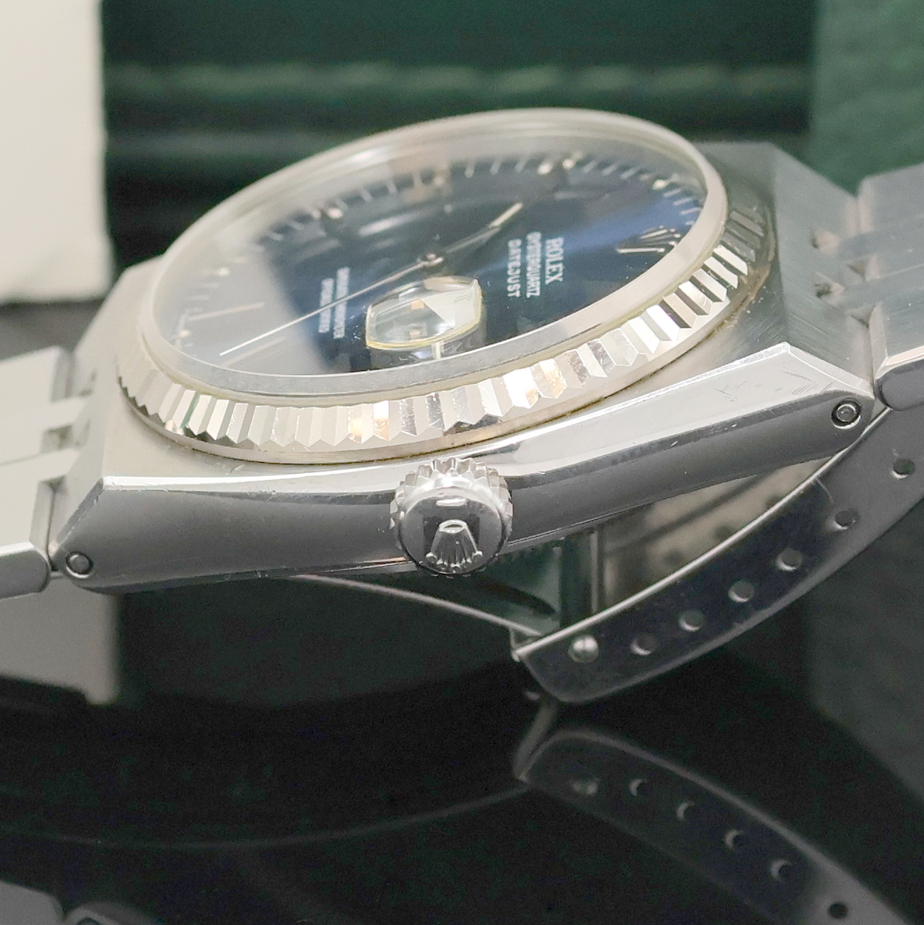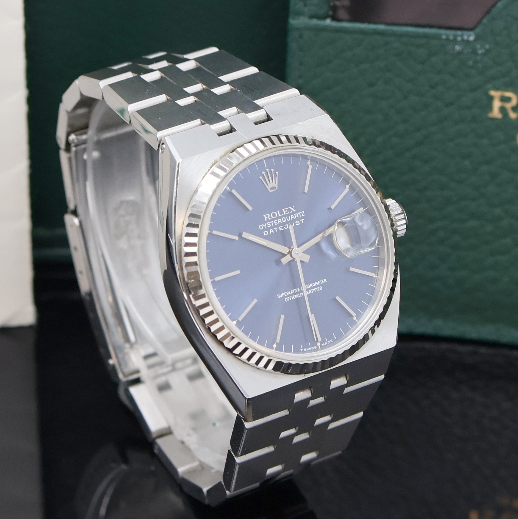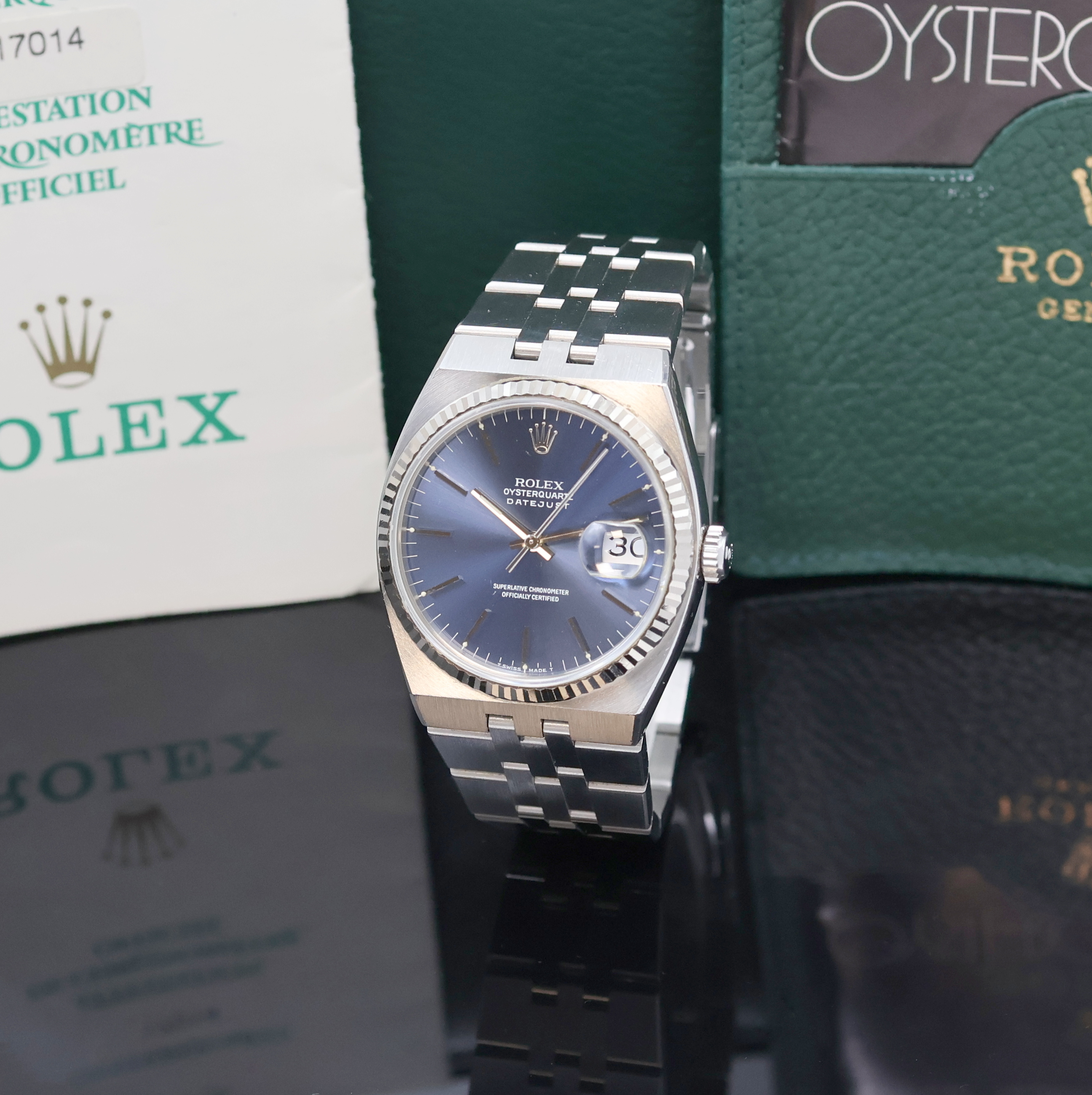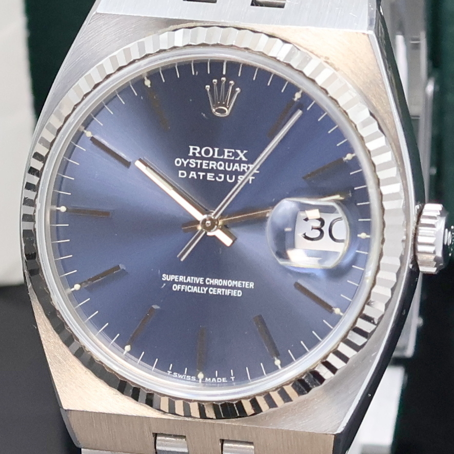 ROLEX Oysterquartz Datejust Herrenarmbanduhr Referenz 17014, Schweiz verk. lt. beil. Zertifikat 02/1998, Chronometer der Superlative in Edelstahl inkl. orig. Integral-Band m. Faltschl., Boden u. Krone verschr., blaues Zifferbl. m. silb. Std.- Ind., silb. Tritium-Leuchtzeiger, Datum unter Lupenglas, Kaliber 5035, D. ca. 36 mm, L. ca. 19 cm, Rolex Box u. Zertifikat anbei, EZ 2