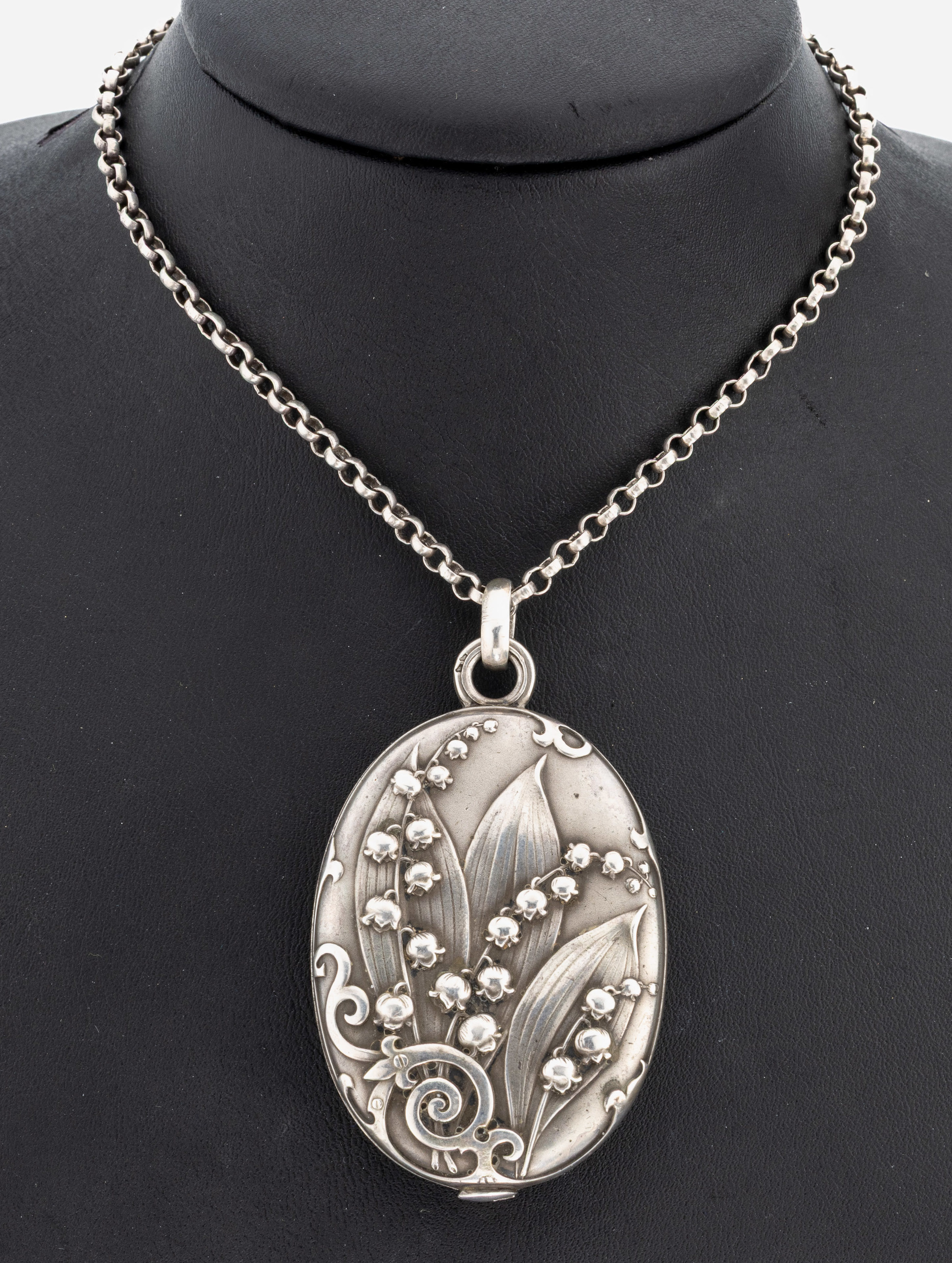Jugendstil Medaillon-Anhänger, um 1900, Silber gepr., wohl Frankreich, oval, Maiglöckchen-Dekor,