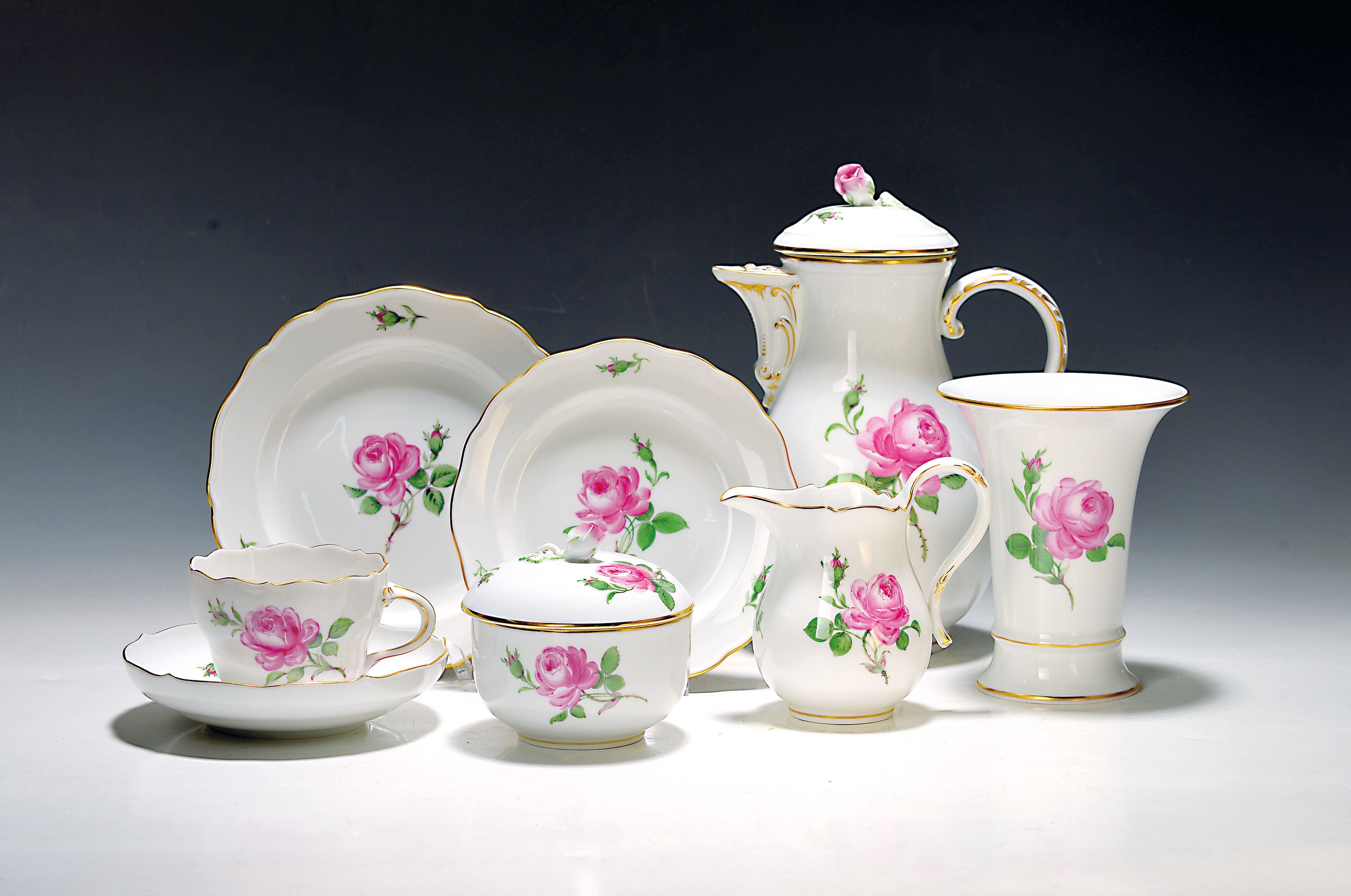 Kaffeeservice für 6 Personen, Meissen, 20. Jh., 1. Wahl, Dekor rote Rose mit Goldrändern,