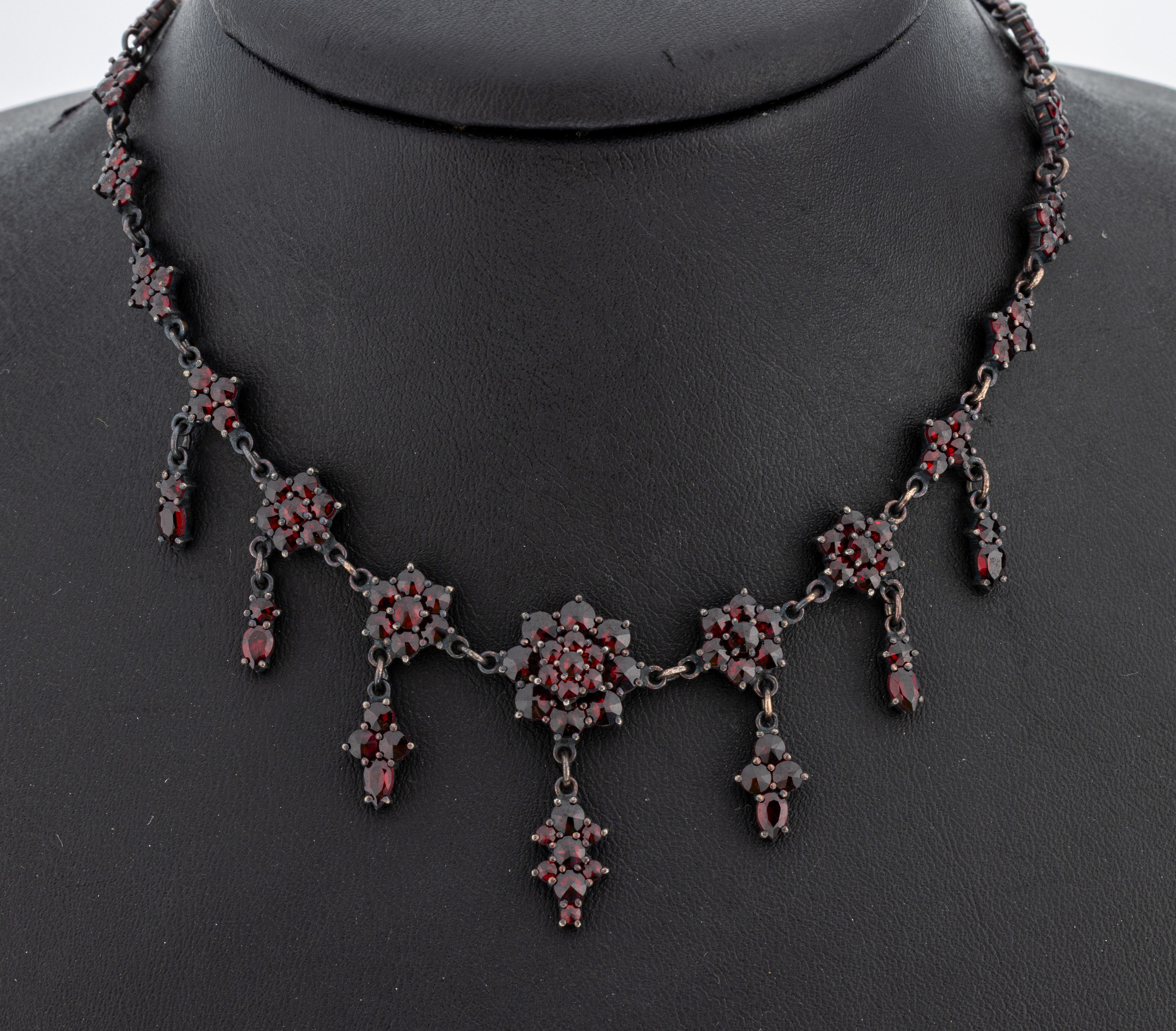 Granat-Collier, um 1890, Metall verg., facett. Granate, Mittelteil mit bewegl. Abhängungen,