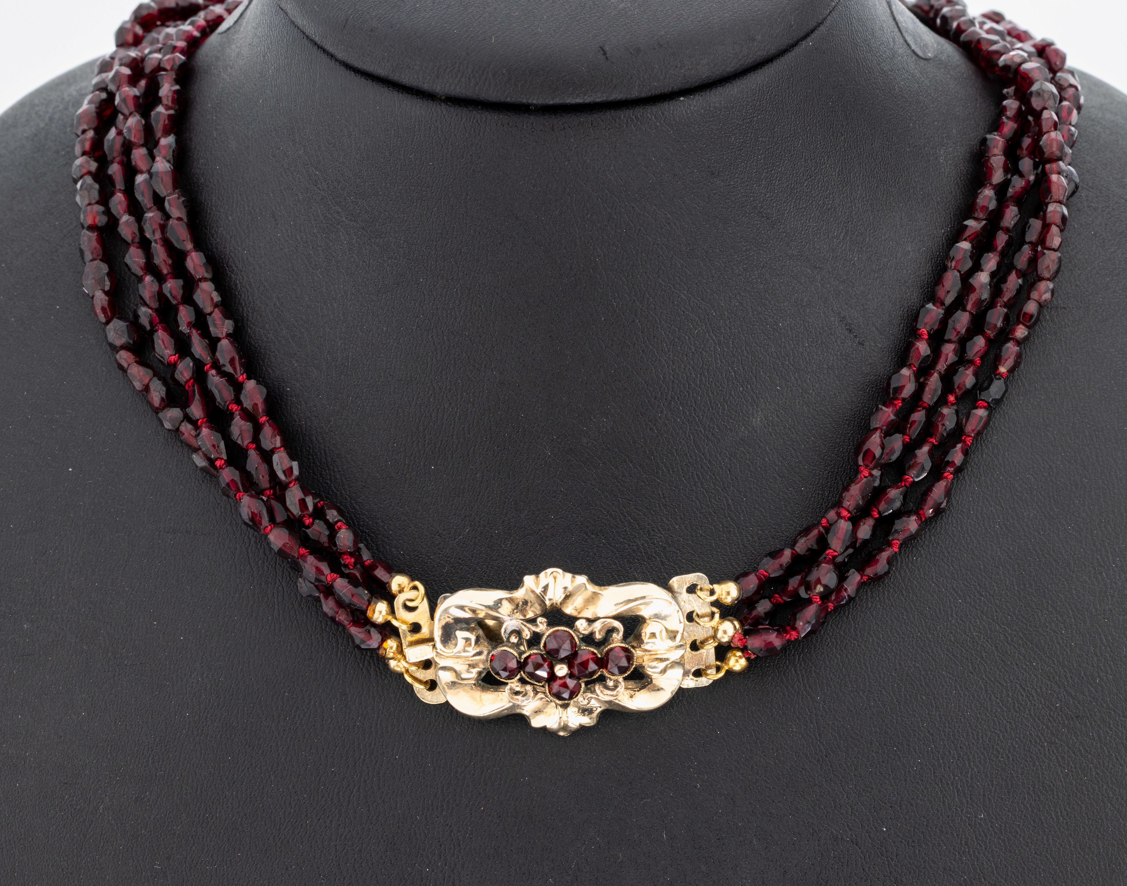 Granat-Collier, um 1870-80, 4-rhg. facett. Granate, schöne Farbe, Kastenschloss