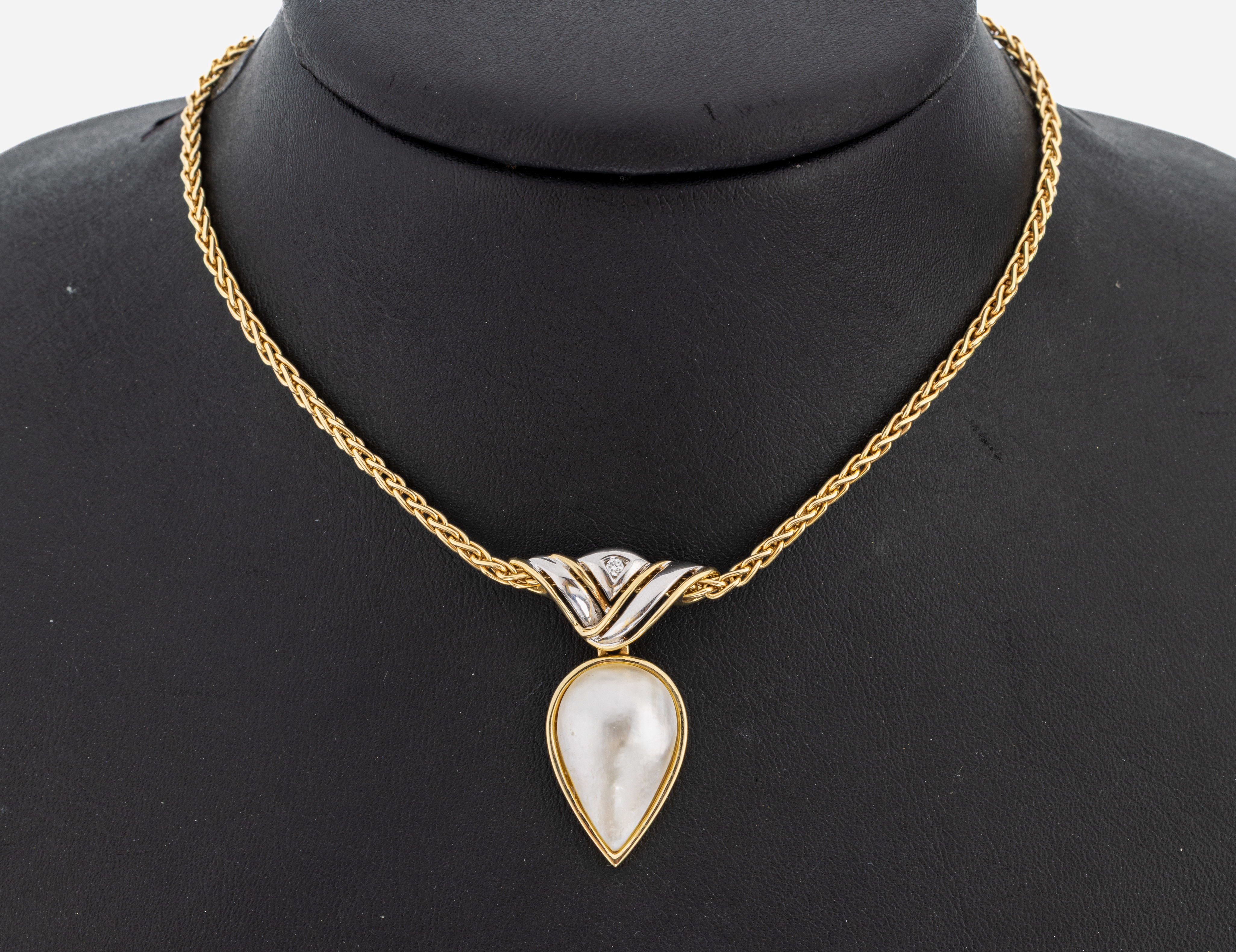 tropfenf. Mabeperle, 1 Brillant 0.03 ct (grav.) Weiß/si, an Kette, GG 585/000, L.
