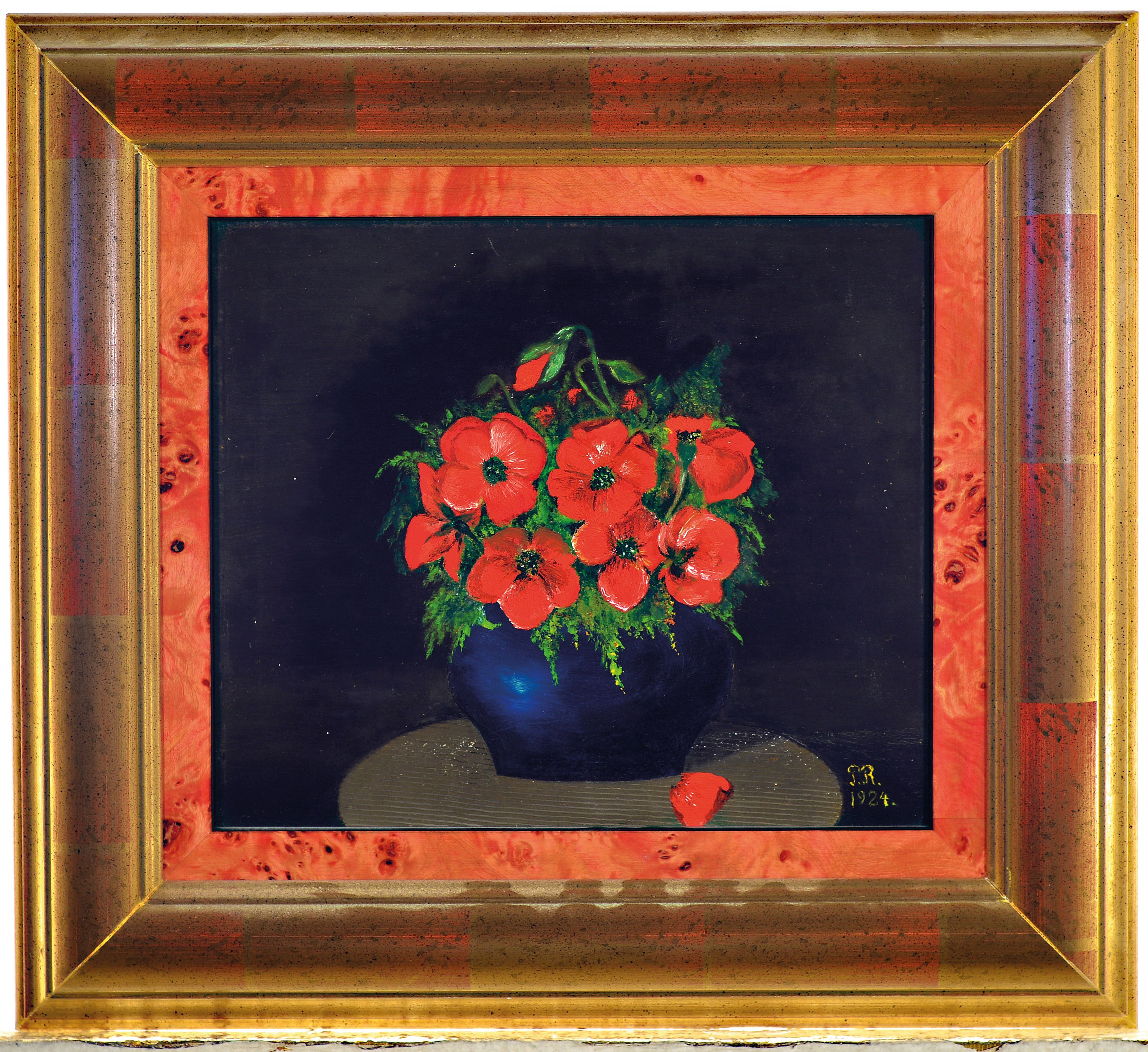 Monogrammist P.R., datiert 1924, Stillleben mit Mohnblumen in blauer Vase, Öl/Malkarton,