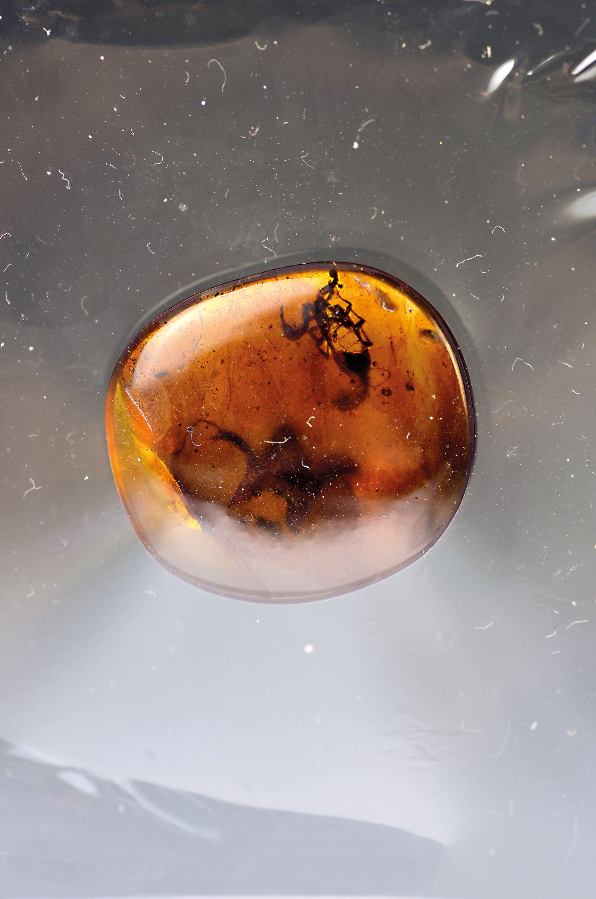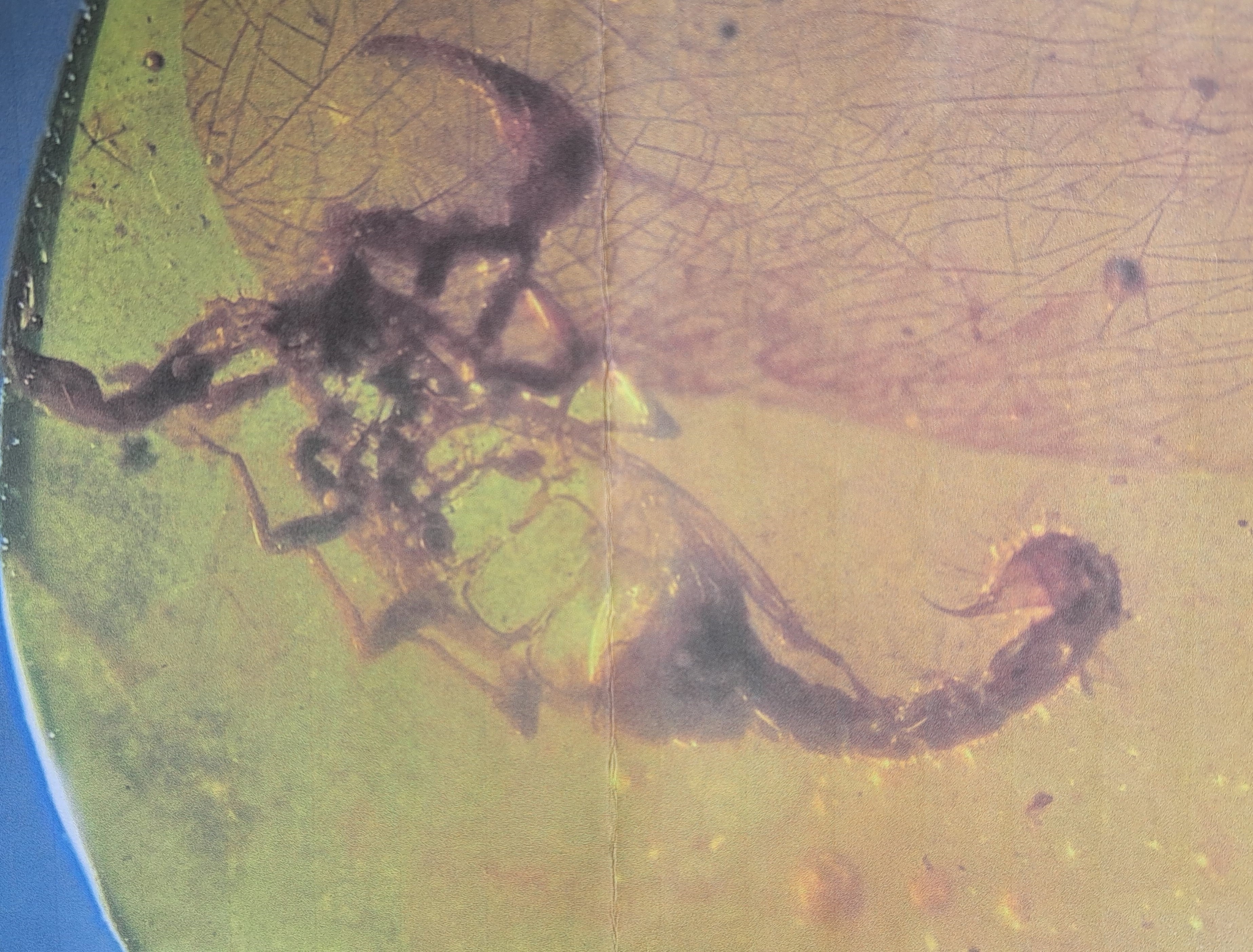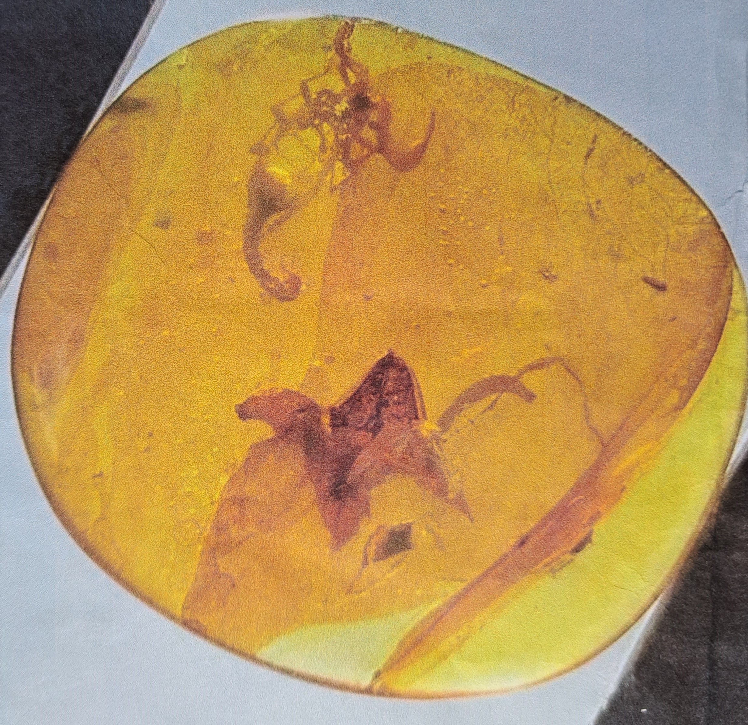 Honigfarbener Bernstein-Cabochon(2,1 x 2 cm) mit Skorpion und großer Blütenknospe, Burma, 100 Mio Jahre alt, sehr gut erhaltener Skorpion mit großen Pedipalpen, sowie schönem Stachelschwanz; von Prof Dr. Lourenco Paris wissenschaftlich auf den Namen "Betaburmesebuthus" determiniert, 0,8 x 0,3 cm, rare Knospe 0,7 x 0,8 cm, Unikat-Mischung, sammelwürdig., museal, aufgrund der Form für Schmuck-/Ring-Anfertigung geeignet