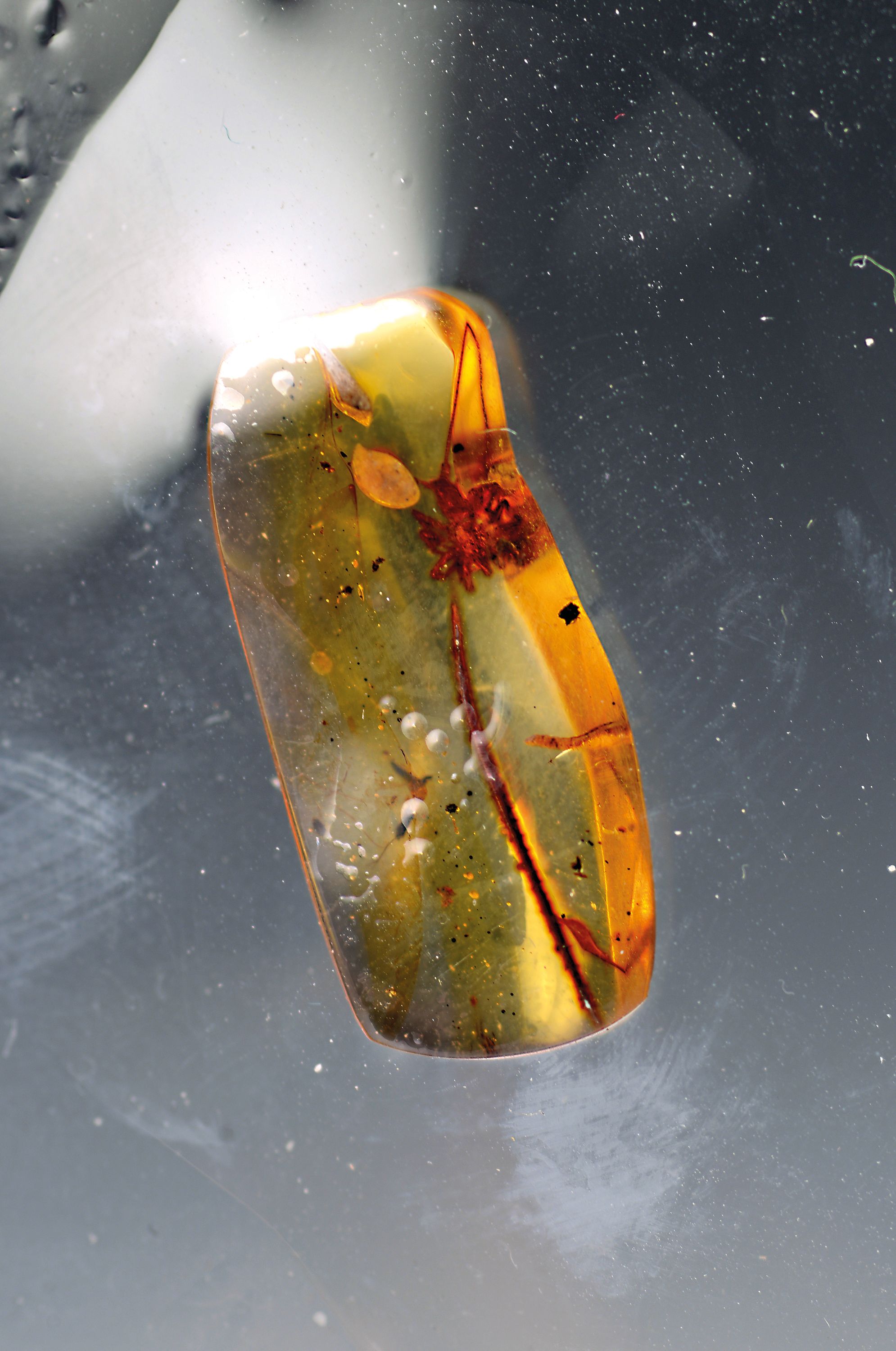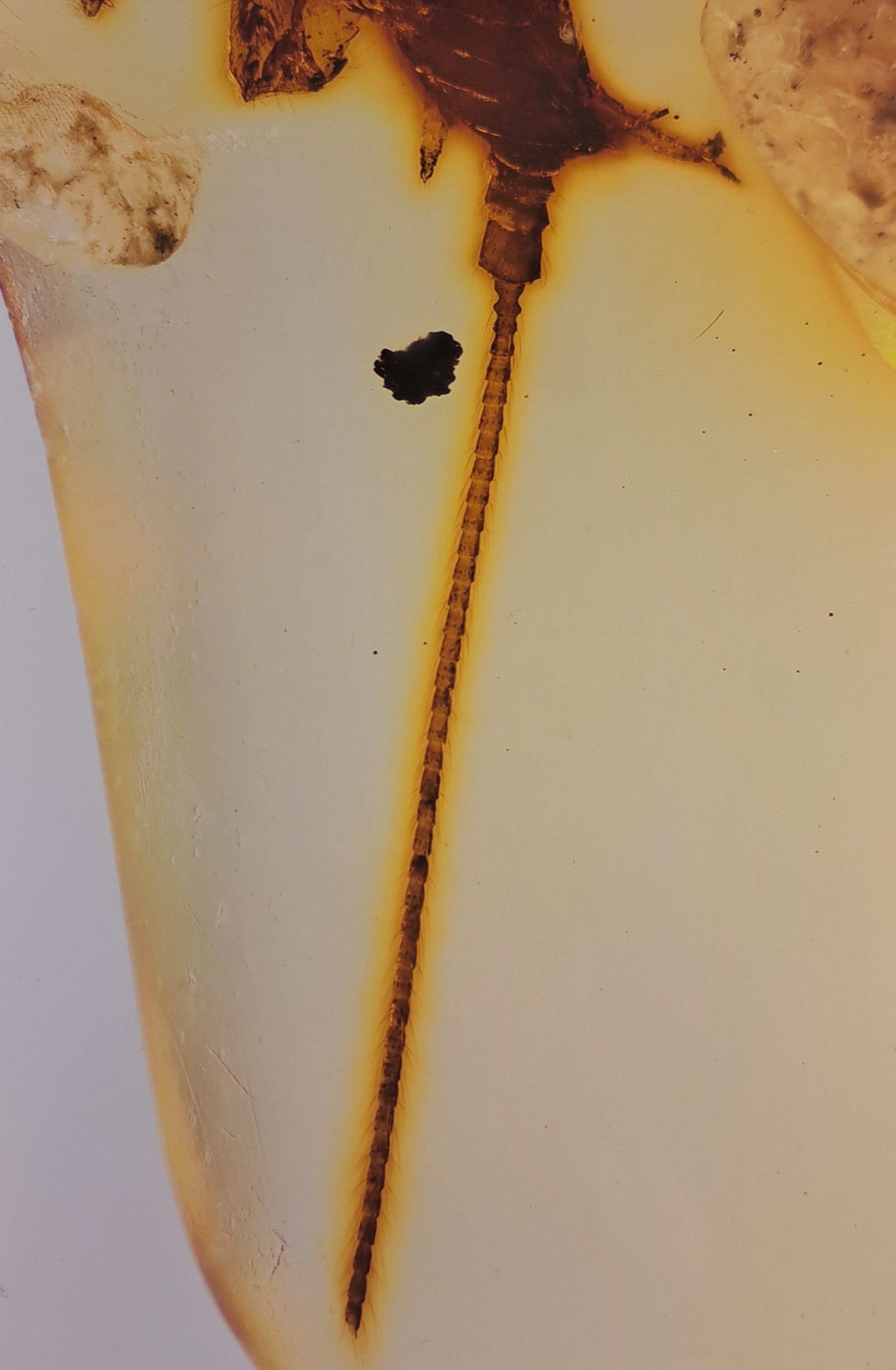 sind noch in dem klaren ovalen Bernstein (2.2x1.3 cm) enthalten; besondere Rarität