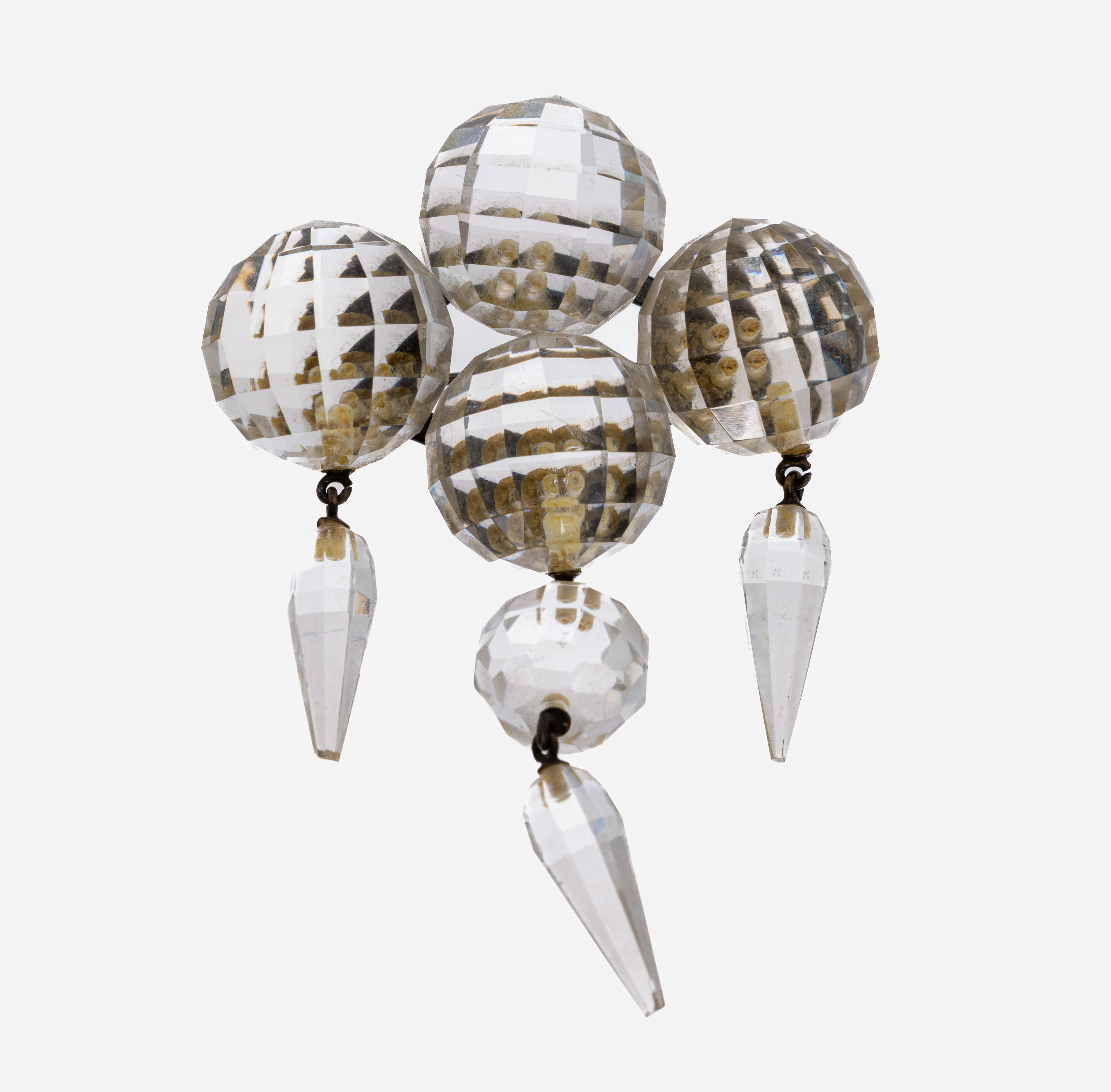 Bergkristall-Brosche, Idar-Oberstein um 1880- 1900, 4 gr. facett. Bergkristall-Kugeln,