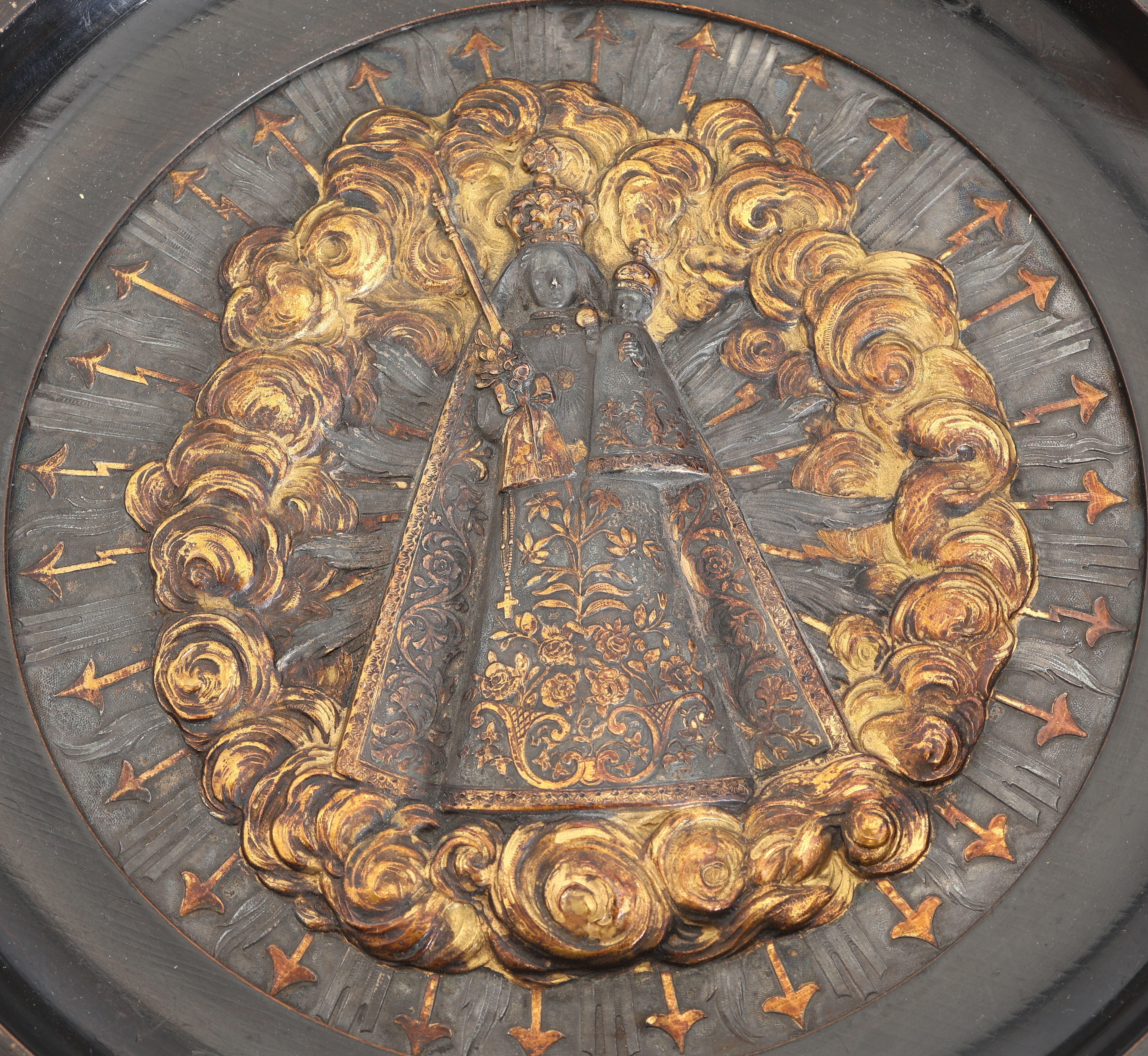 Jesuskind, umgeben von Kranz aus Wolken und Strahlen, Holzrahmen, D. ca. 25 cm