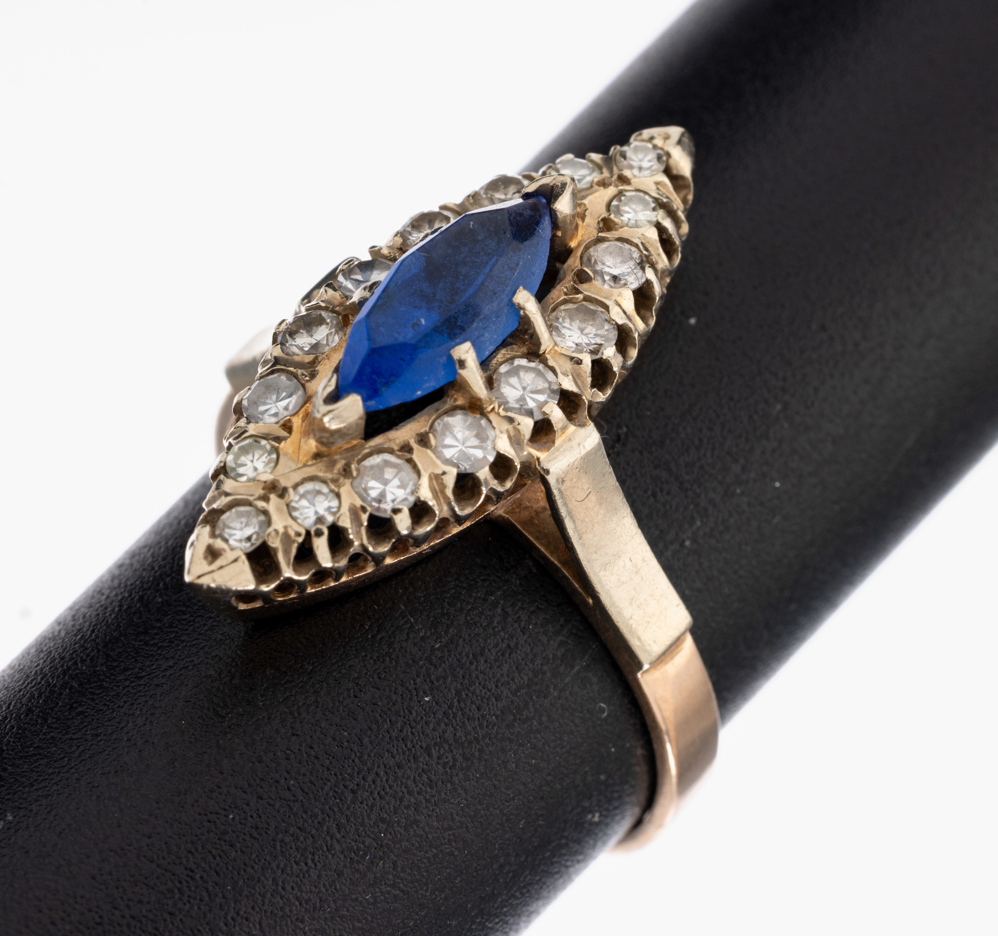 14 kt Gold Farbstein-Diamant-Ring, Russland 1960er Jahre, GG 583/000, navettef. Ringkopf,