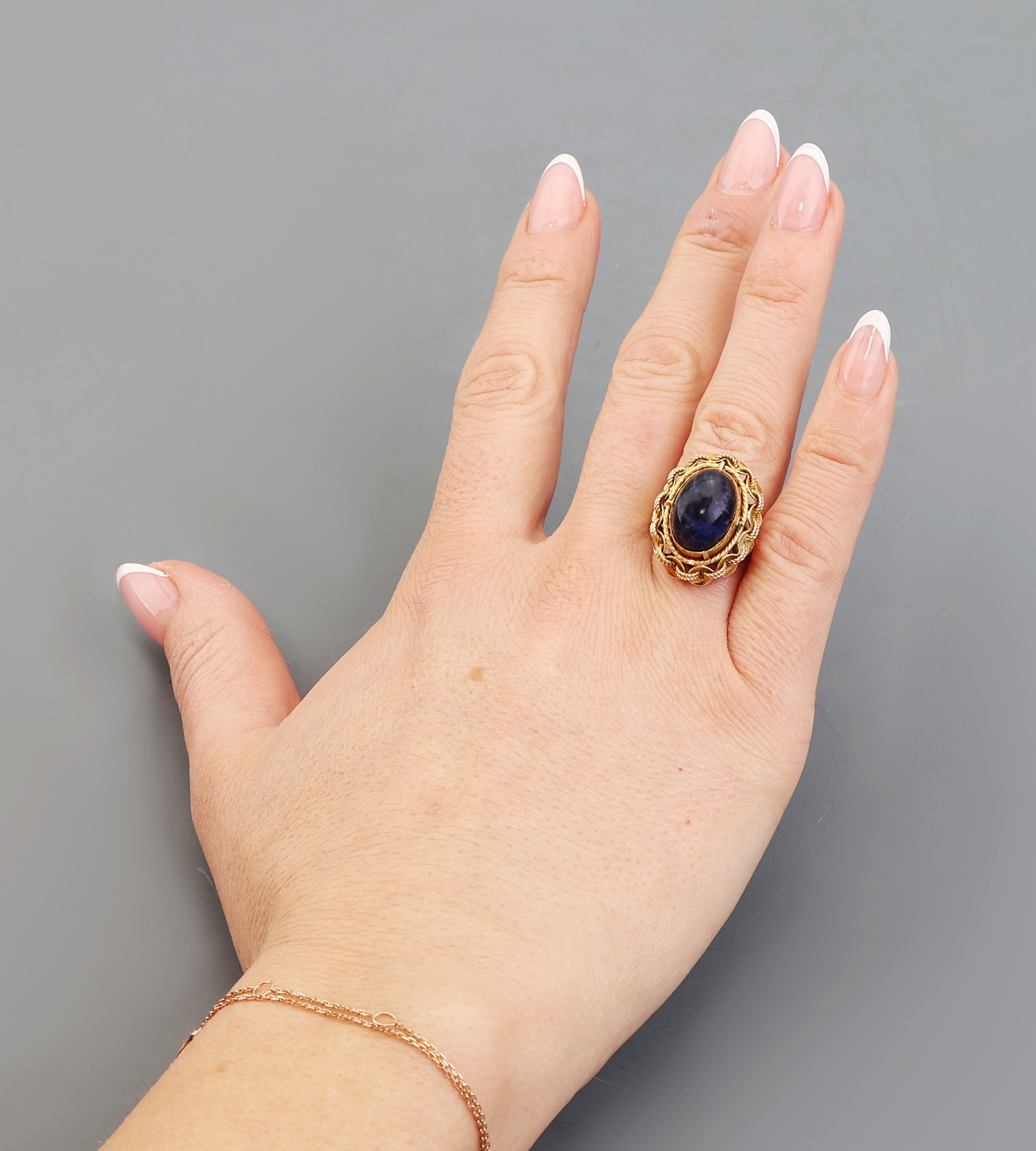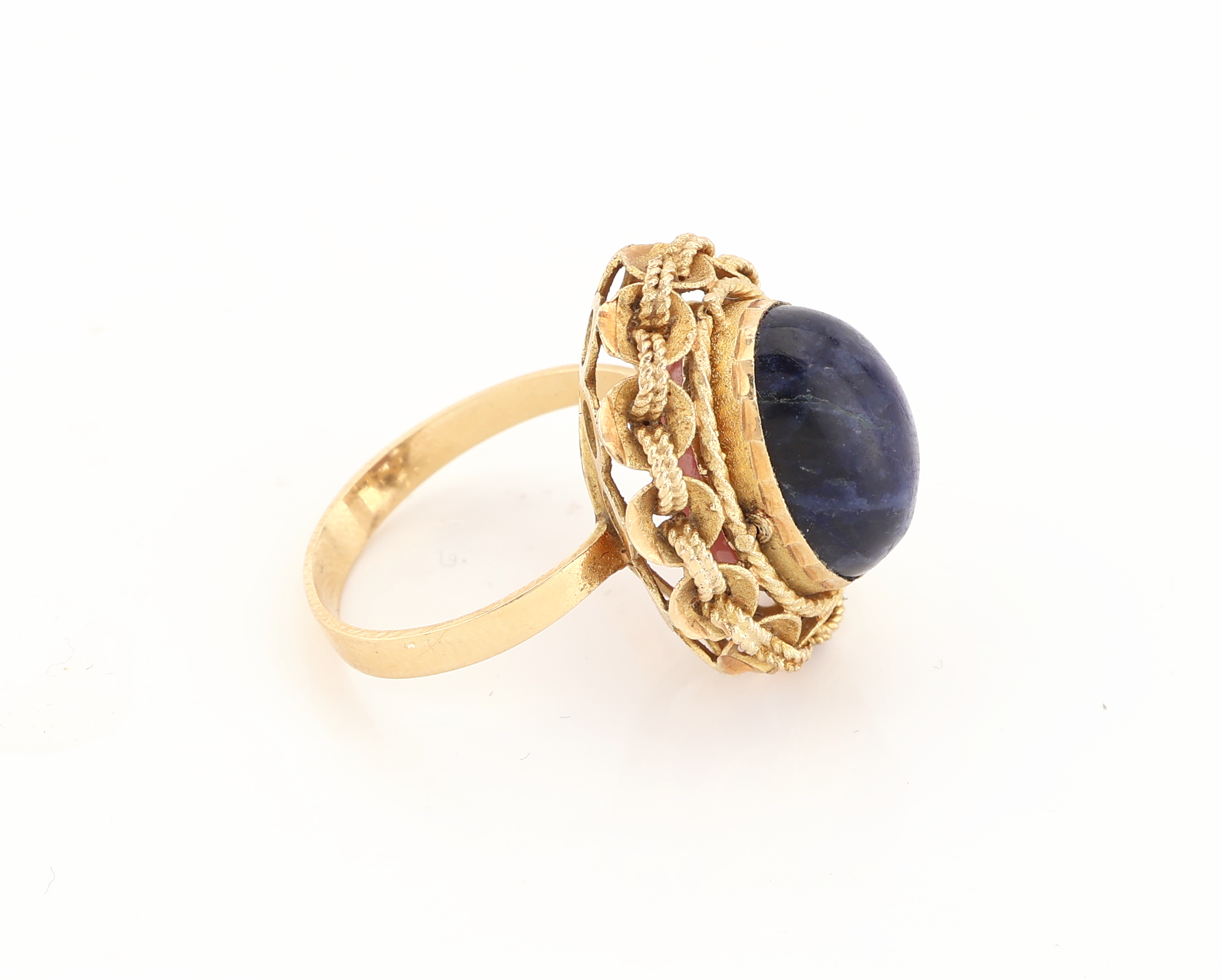 14 kt Gold Farbstein-Ring, GG 585/000 gepr., drehbarer Ringkopf, 1 Seite Rhodochrosit-Cabochon, 1 Seite Sodalith- Cabochon, RW 55, ca. 6.9 g
