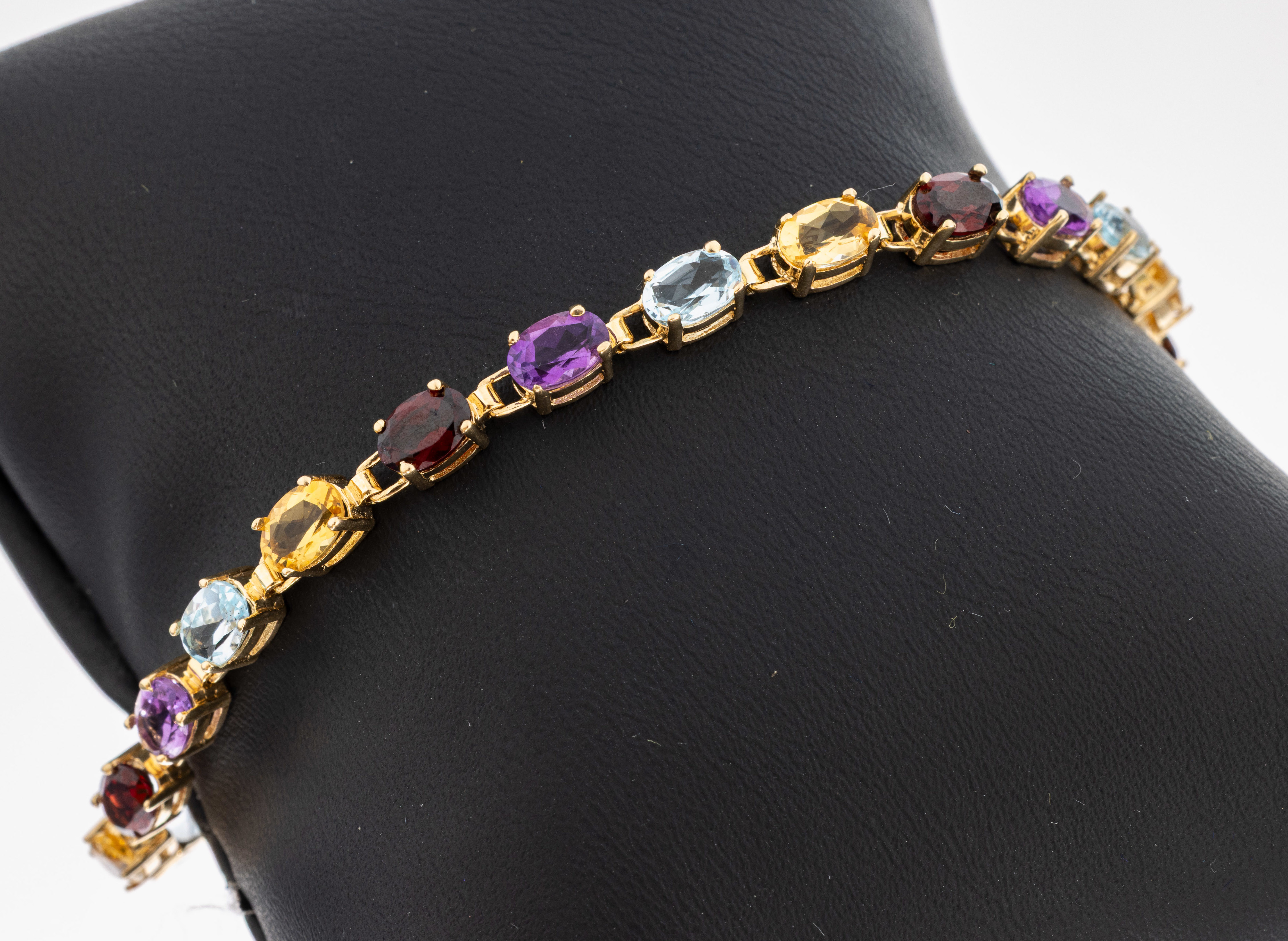 14 kt Gold Farbstein-Armband, GG 585/000, 22 ovalfacett. Farbsteine, Amethyst, Granat,