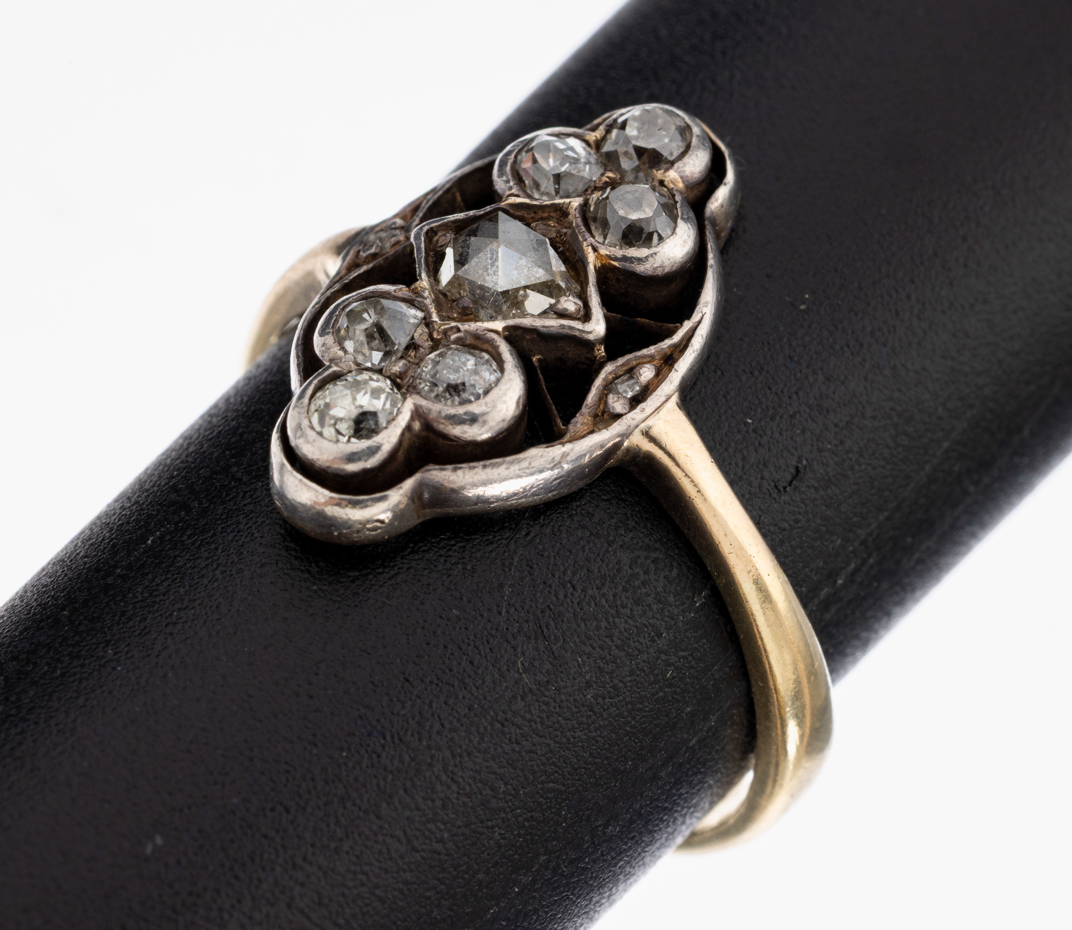 um 1890, 6 Altschliffdiamanten und 1 Diamantrose zus. ca. 0.40 ct Weiß-get.Weiß/p,