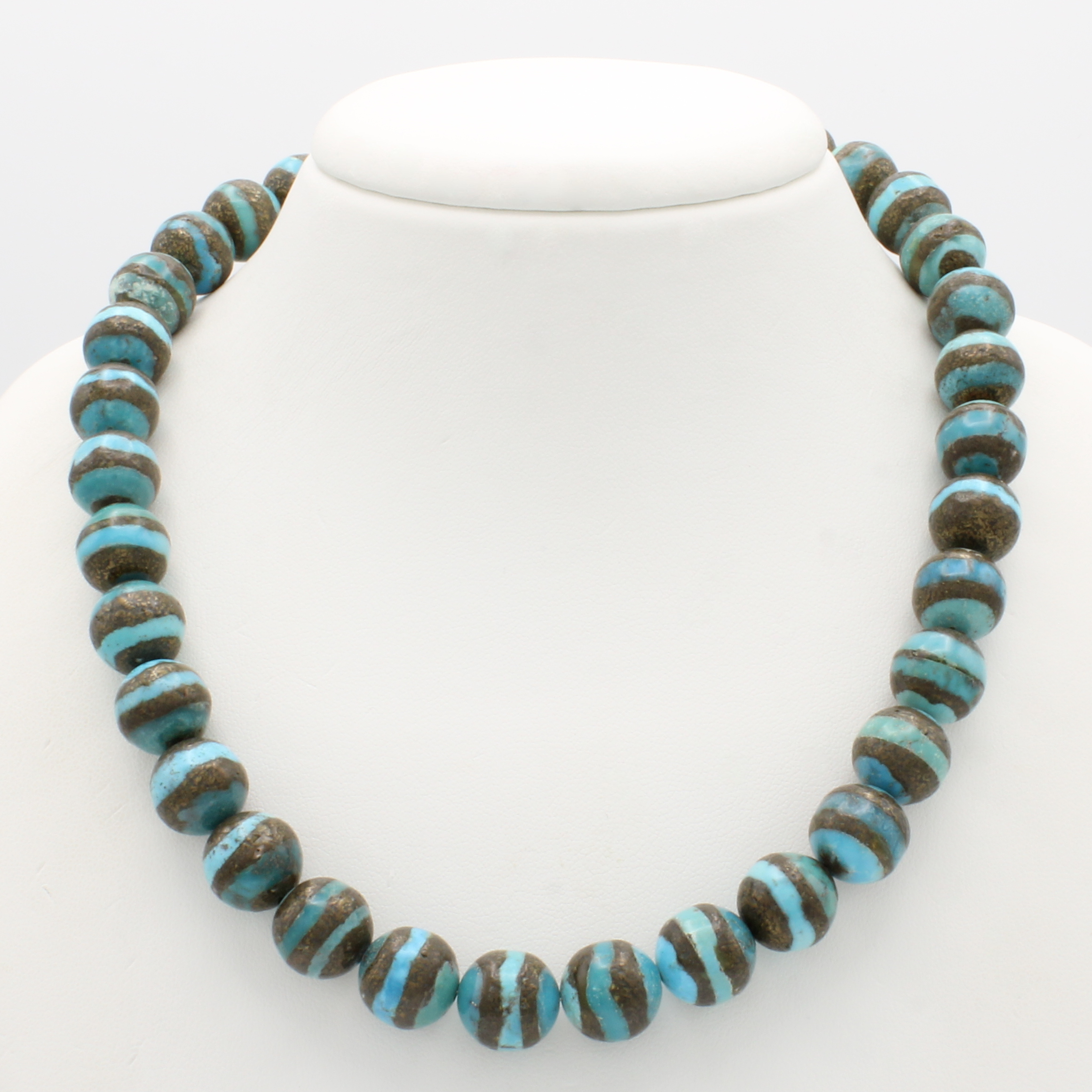 Türkiskugelkette, mit Kupfereinlagen, ver- gold. Karabinerverschl., D. ca. 12 mm, L. ca. 44 cm Schätzpreis: 380, - EUR