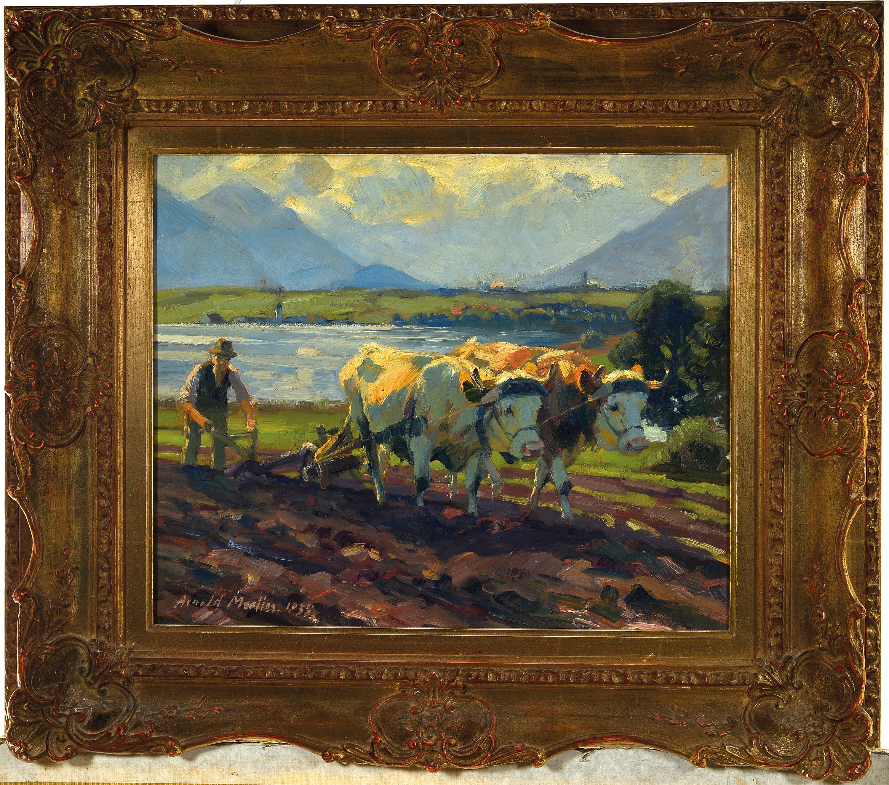 Arnold Möller,1886 Bückeburg-1963 Bruckmühl, "Am Riegsee", pflügender Bauer mit