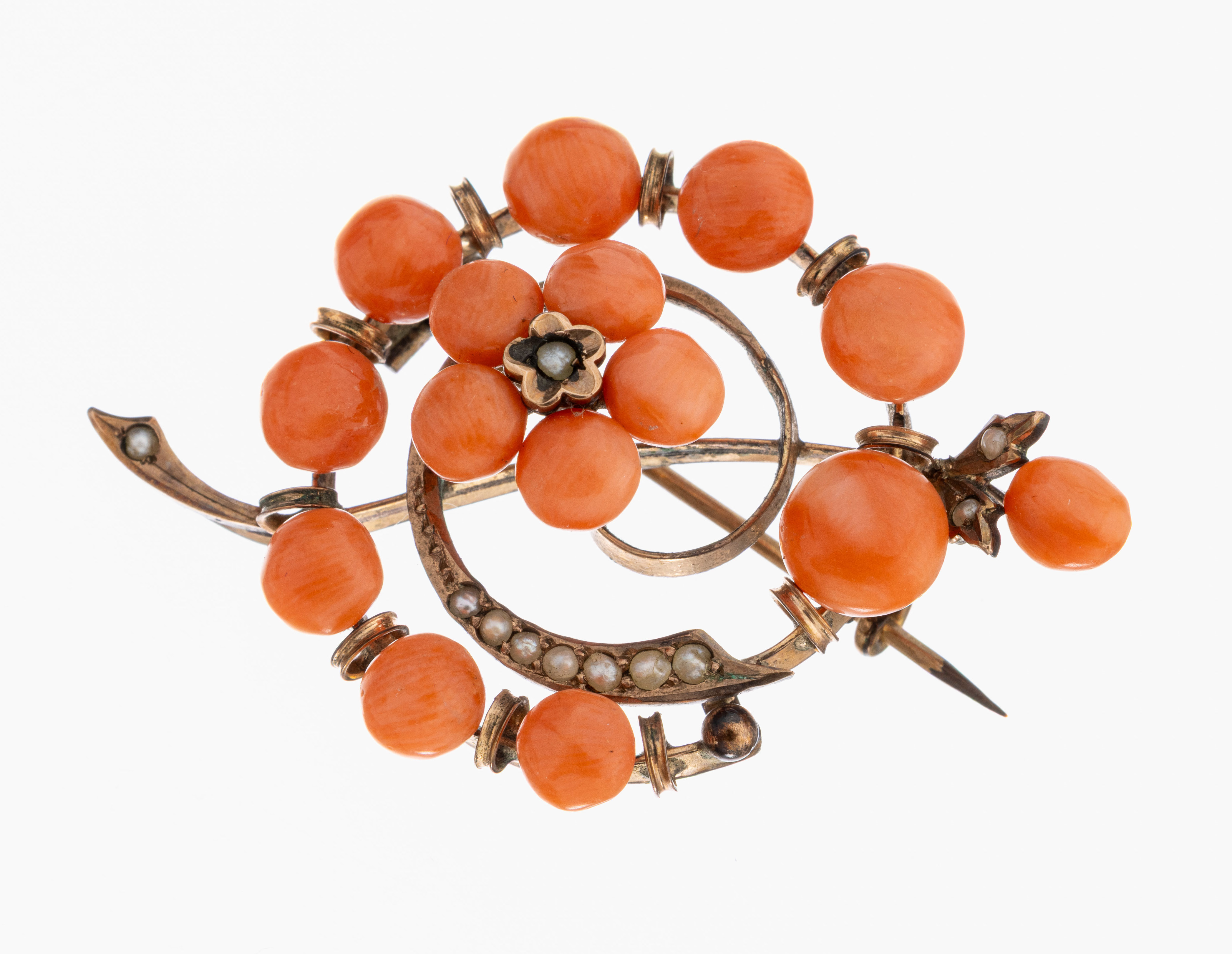 Korallen-Perl-Brosche, um 1900, Metall verg., geschwungene Gestaltung, 13 Korallen-