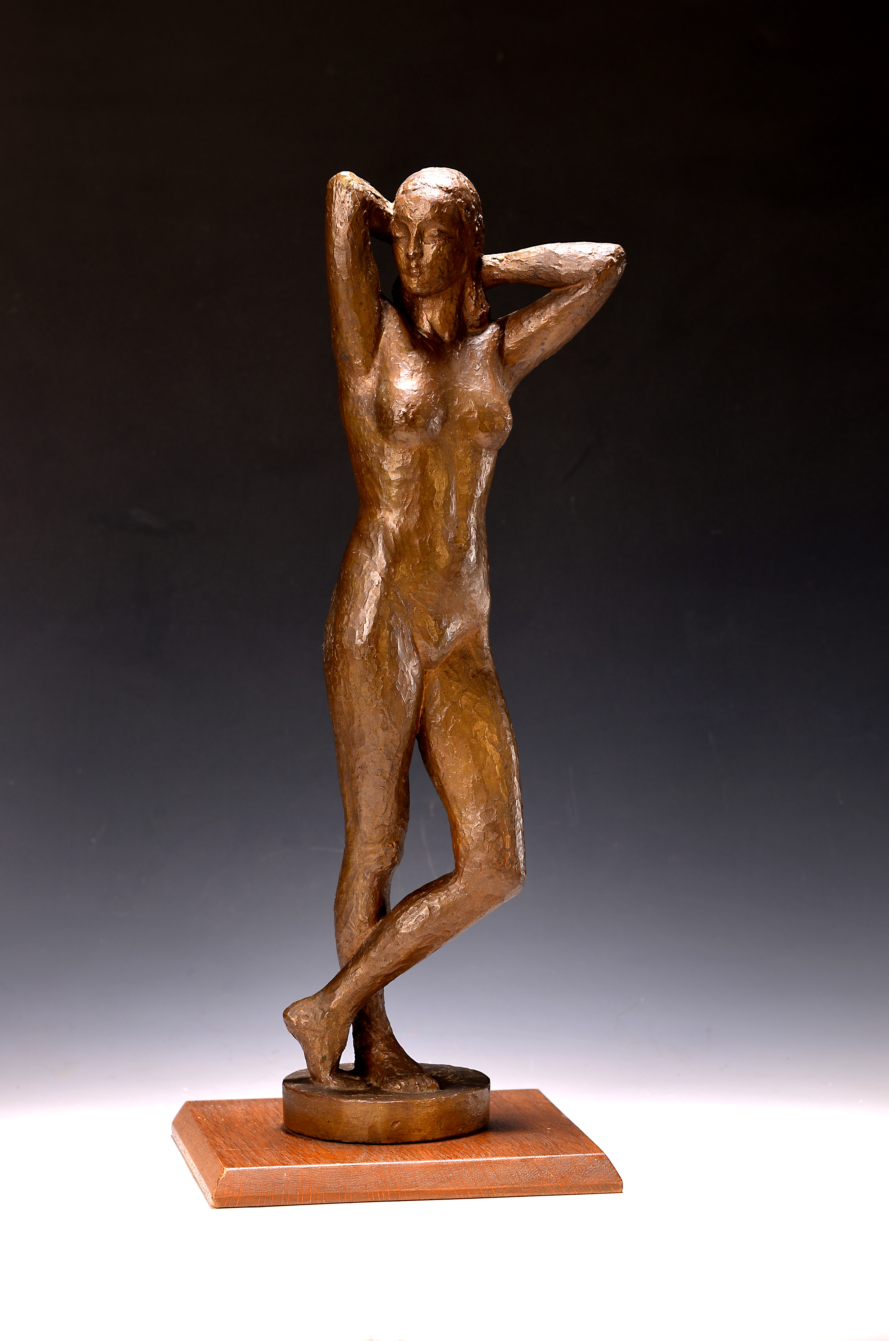 stehender Akt mit hinter dem Kopf verschränkten Armen, Bronze patiniert, am Sockel
