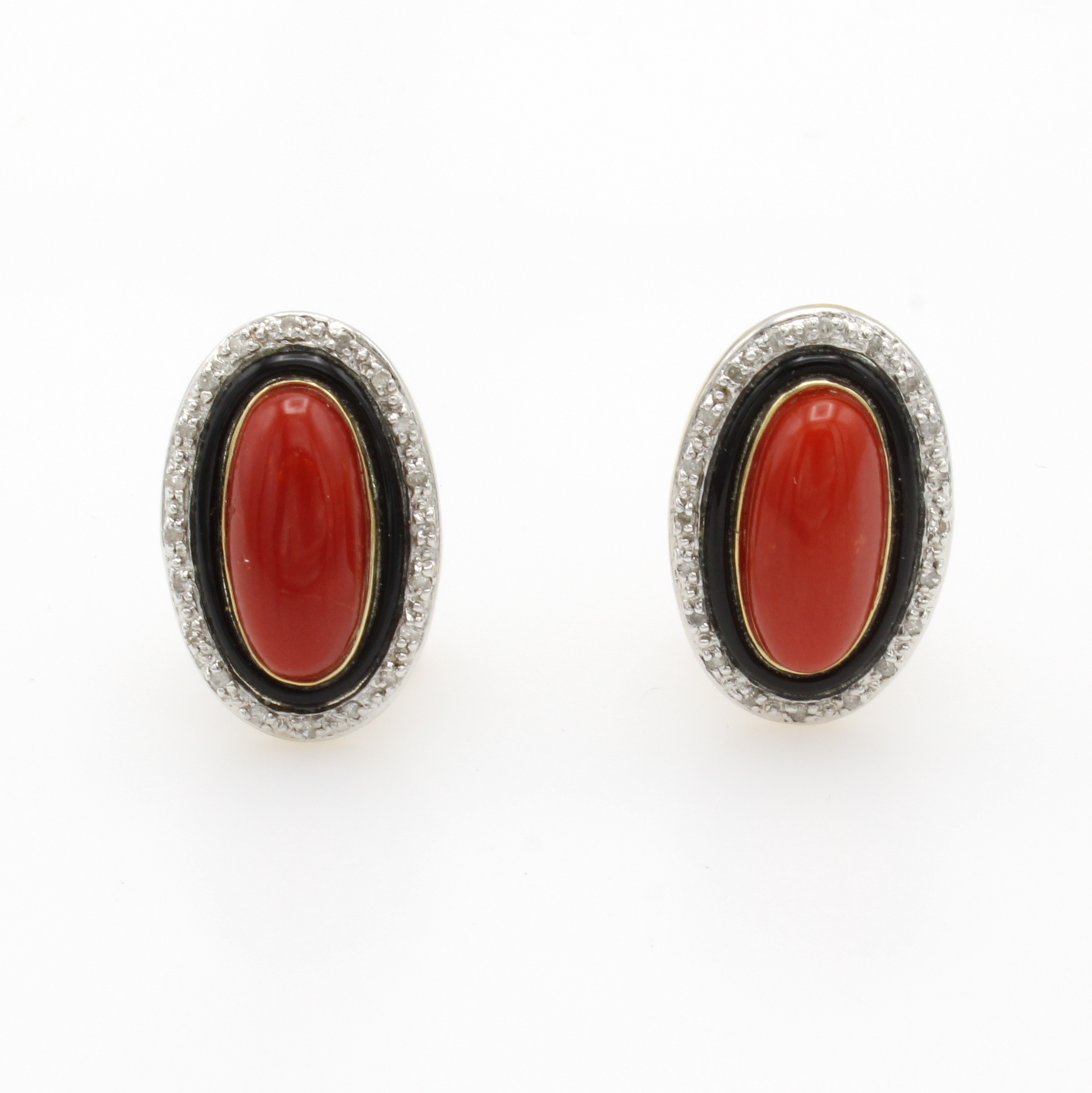 Paar Ohrstecker mit Korallen und Diamanten, GG 585/000, ovale Korallcabochons, Onyxum- randung, 40 Diam. zus. ca. 0.20 ct Weiß/p, Versand nur innerhalb der EU Schätzpreis: 4600, - EUR