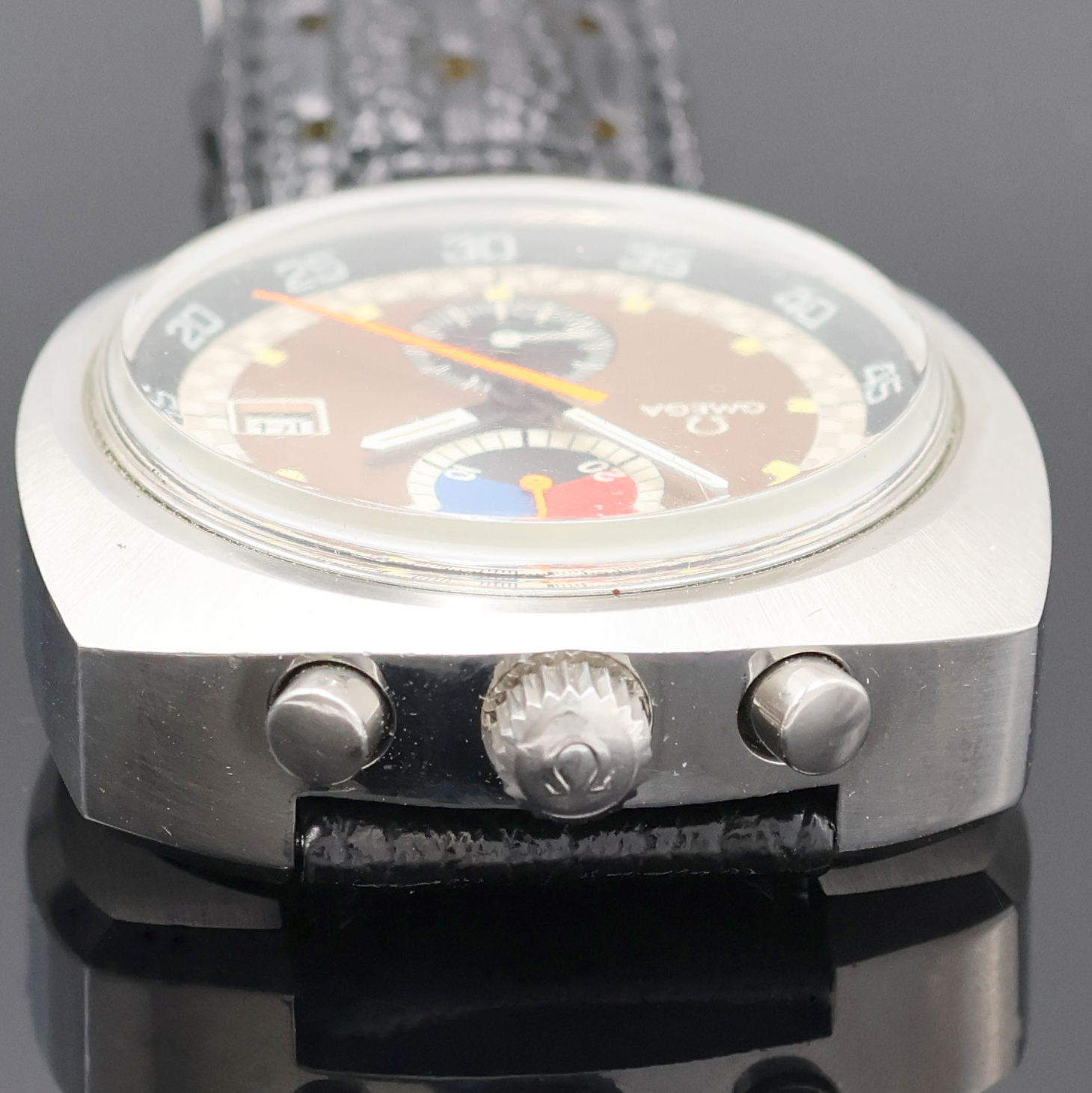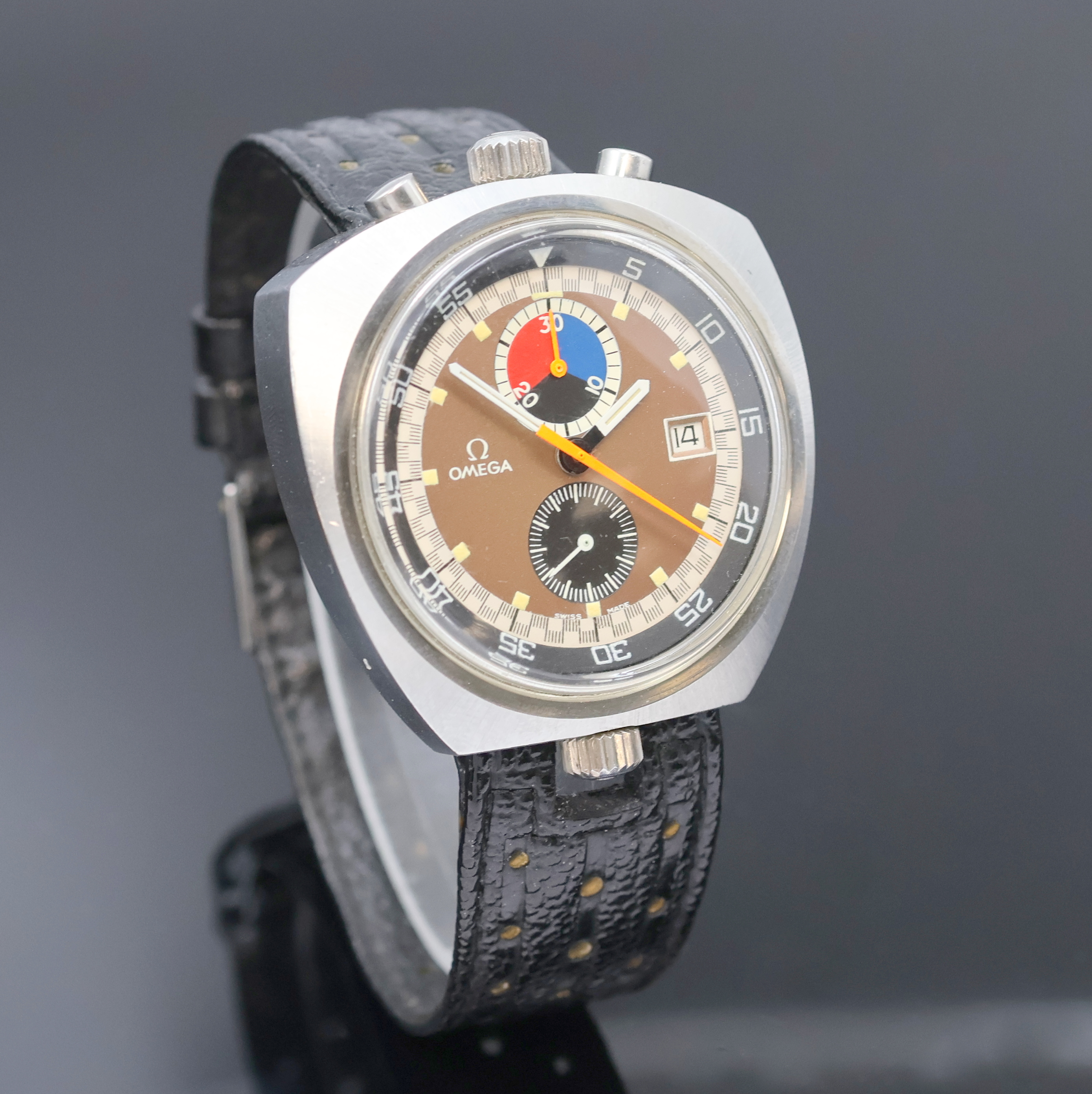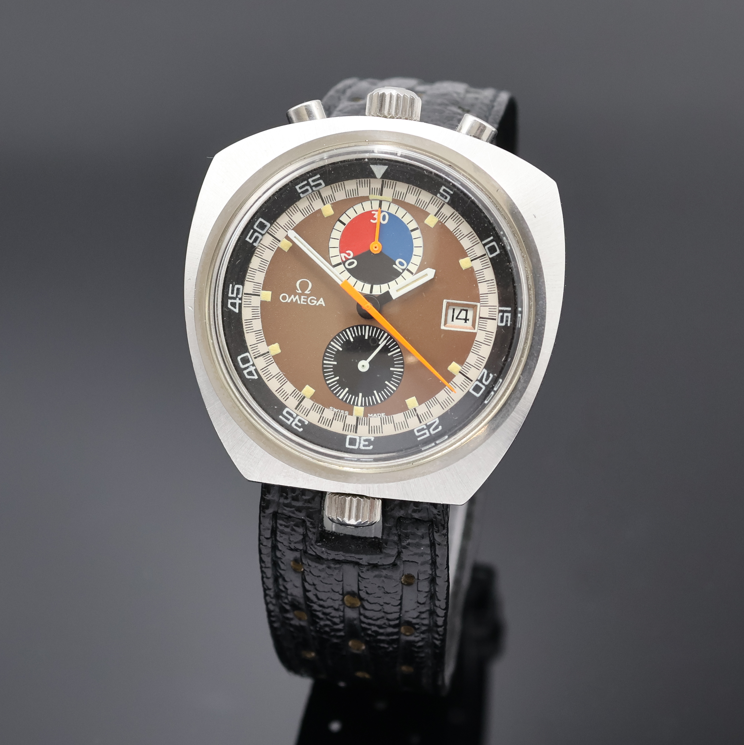 OMEGA seltener Rallye-Armbandchronograph Seamaster "Bullhead"" Referenz 146.011-69, Handaufzug, Schweiz um 1969, trapezförmiges Edelstahlgeh. inkl. Lederband m. orig. Dornschl., verschr. Boden m. Seepferdchen- Darstellung, braun/beiges Zifferblatt m. Tritium-Blockindizes, 3-farbiger Minutenzähler bei 12, kl. Sek. bei 6, Innenlünette mit 60er Teilung beids. drehb. durch Krone bei 6, Werk rotverg., 17 St., Kal. 930, D. ca. 25 bis 43,5 mm, orig. Glas und Kronen, Überh. empf., EZ 2