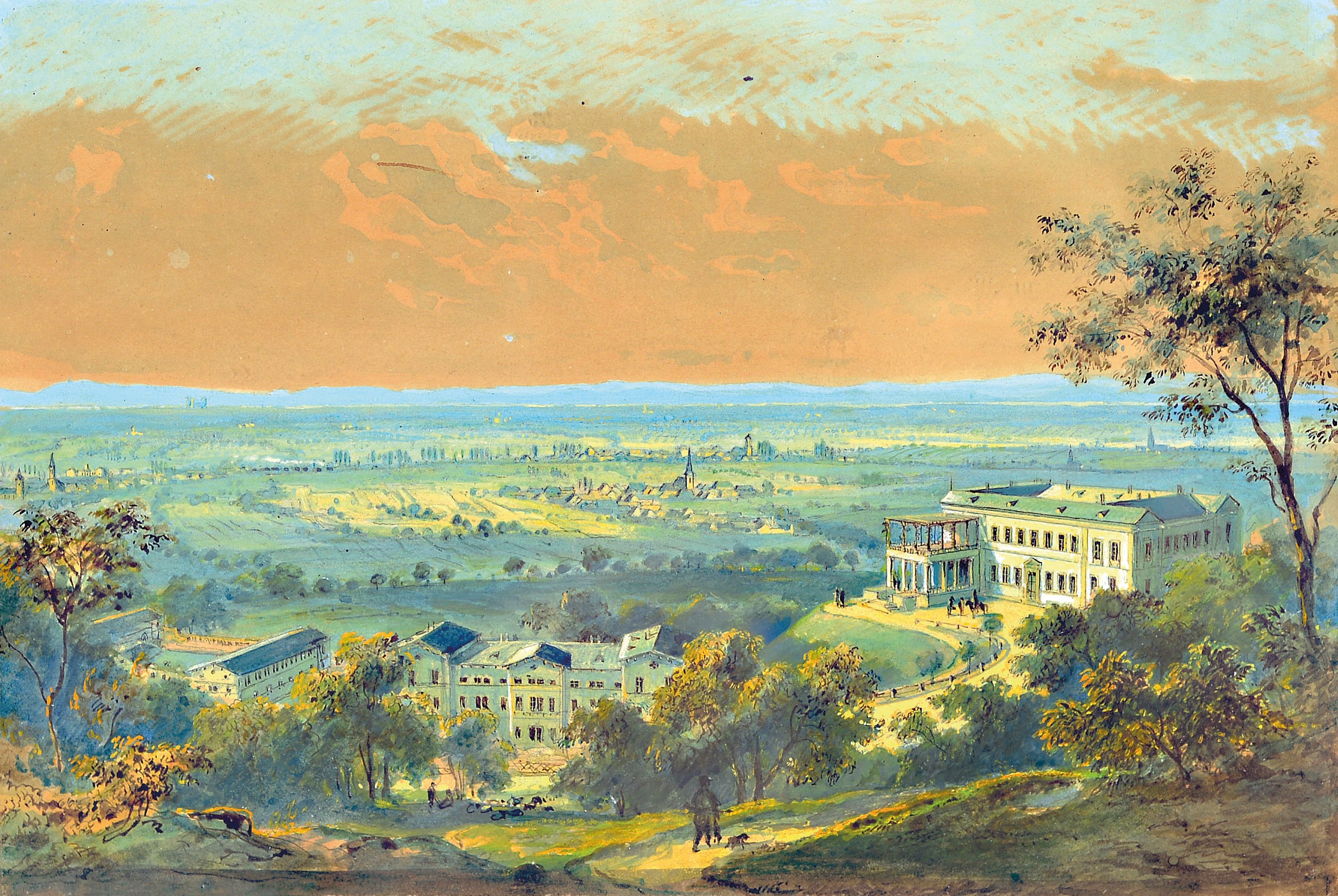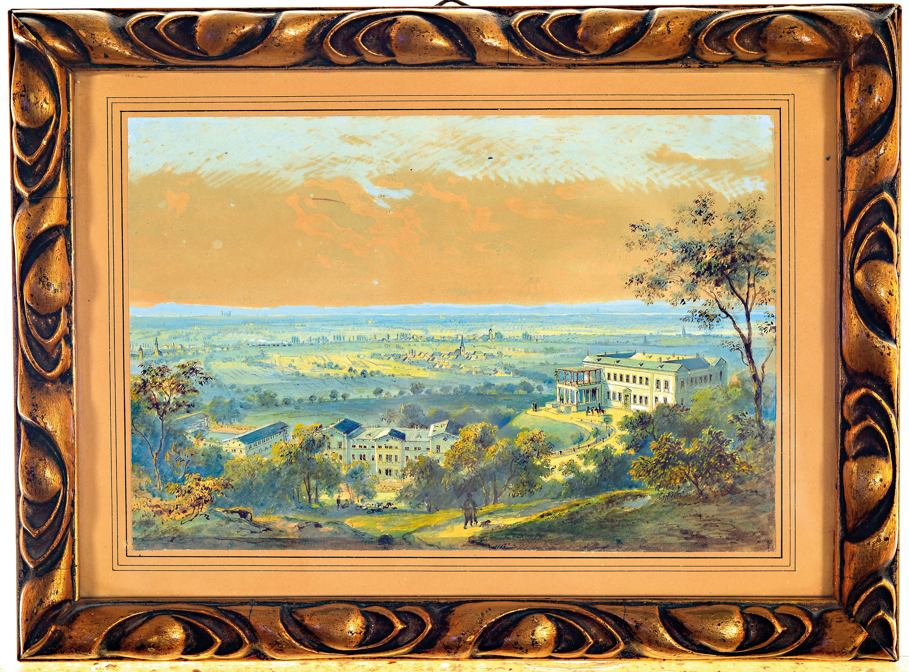 Zuschreibung Heinrich Jakob Fried, 1802 Queichheim-1870 München, Villa Ludwigshöhe bei Edenkoben, 1852-1870, Darstellung vor der Aufforstung ab 1870, feine Gouache, im Vordergrund Villa Ludwigshöhe, im Hintergrund weiter Blick in die Rheinebene, auf Papier, feine Miniaturmalerei, unsigniert, l. Altersspuren, unter Glas, Rahmen ca. 13.5 x 19.5cm, unter Glas, Rahmen, ca. 19.5 x 25.5 cm, Fried lernte bei dem Landauer Johann Gerhardt,in der Zeichenschule Johann Lorenz Rugendas und an der Akademie München