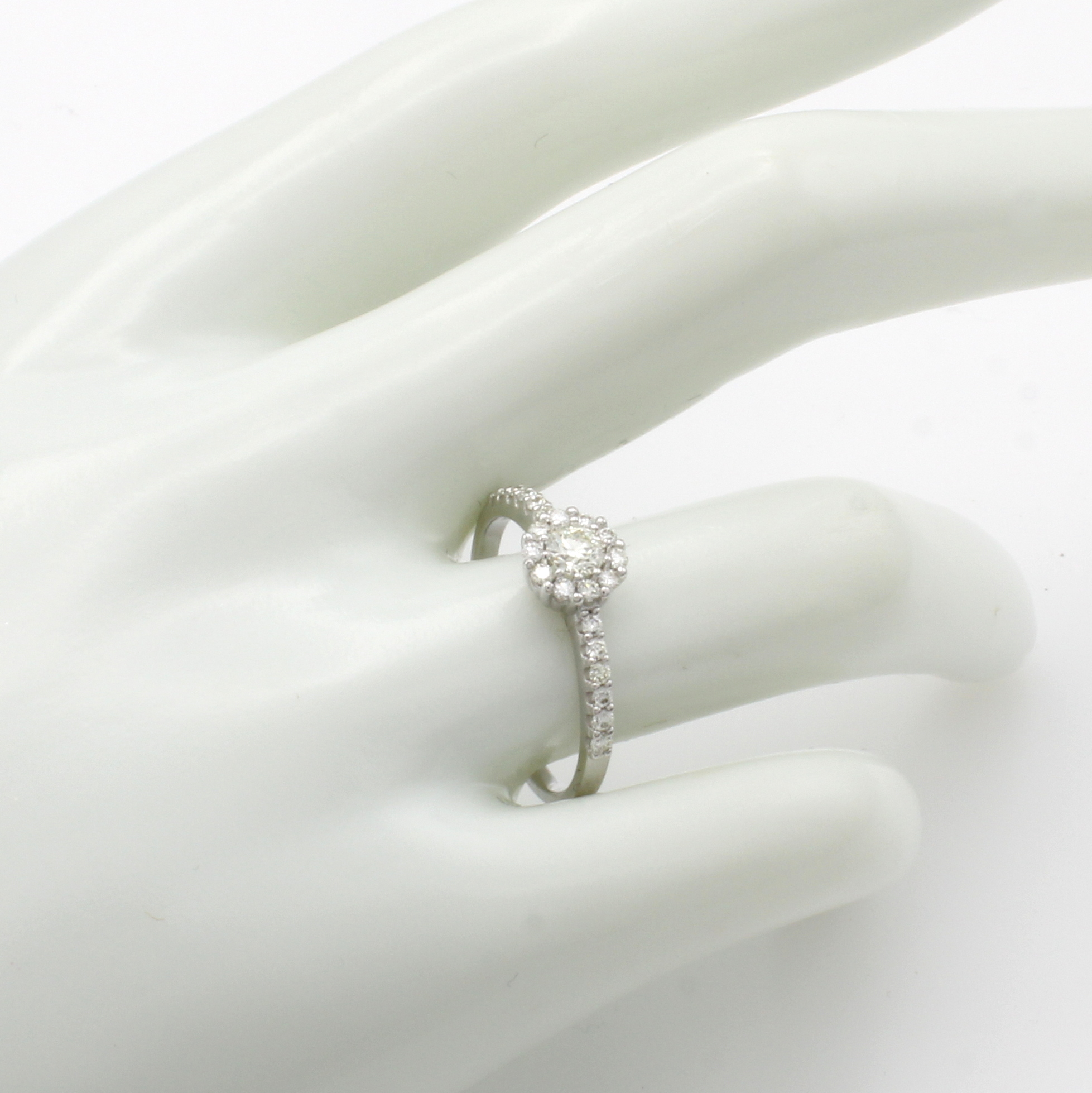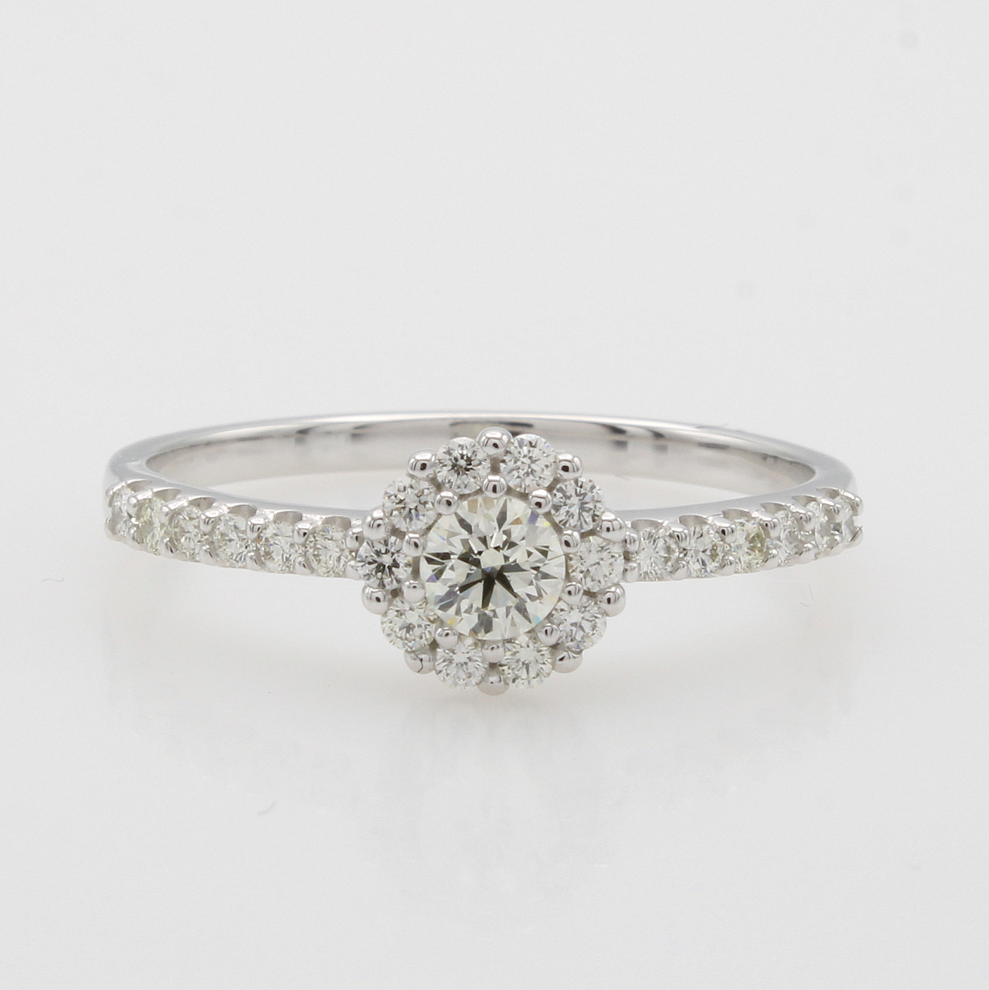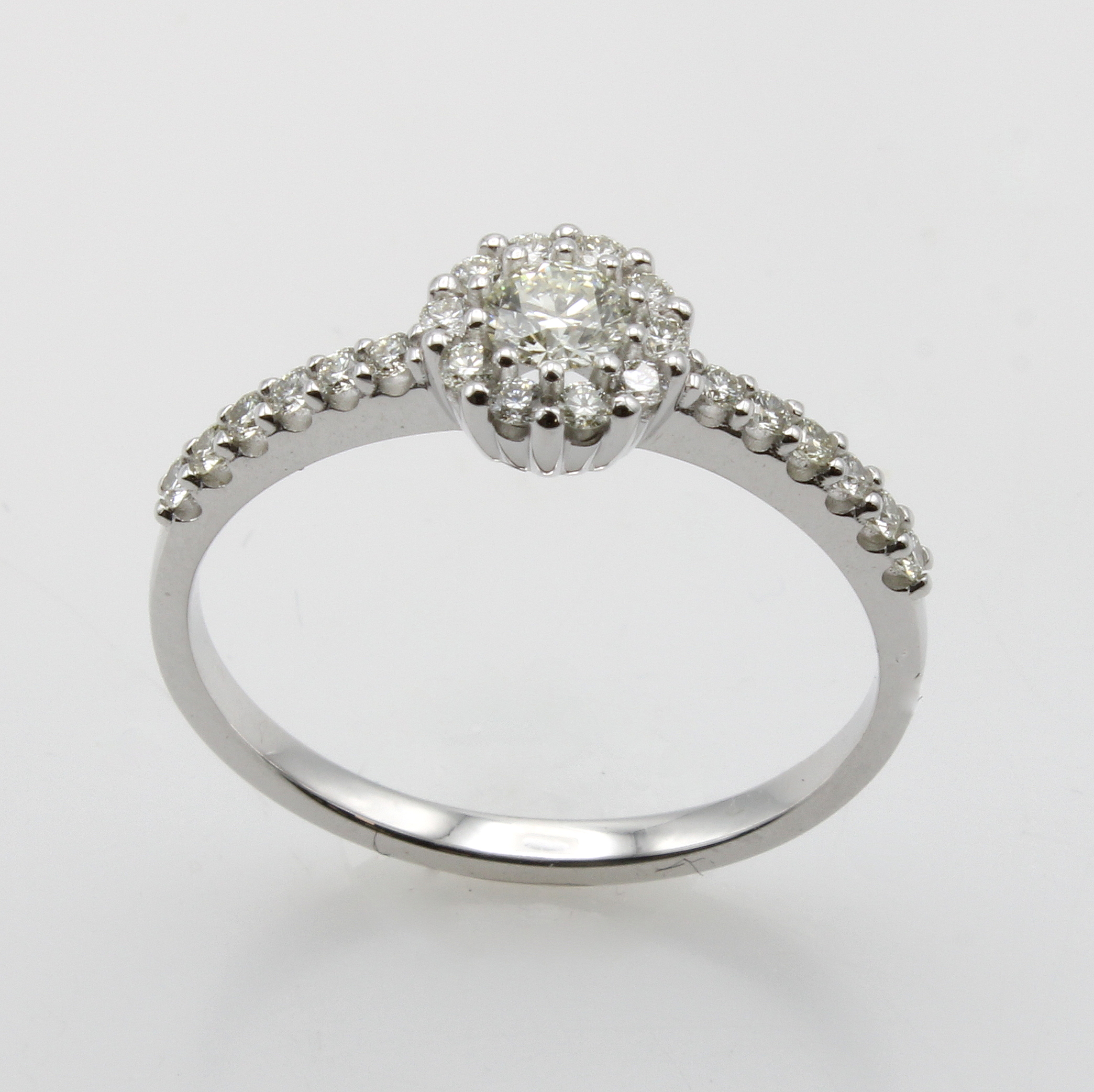 Ring mit Brillanten, WG 585/000, runder Ringkopf u. Ringschultern bes. m. Brill. zus. ca. 0.50 ct get.Weiß/lupenr., RW ca. 58 Schätzpreis: 1690, - EUR