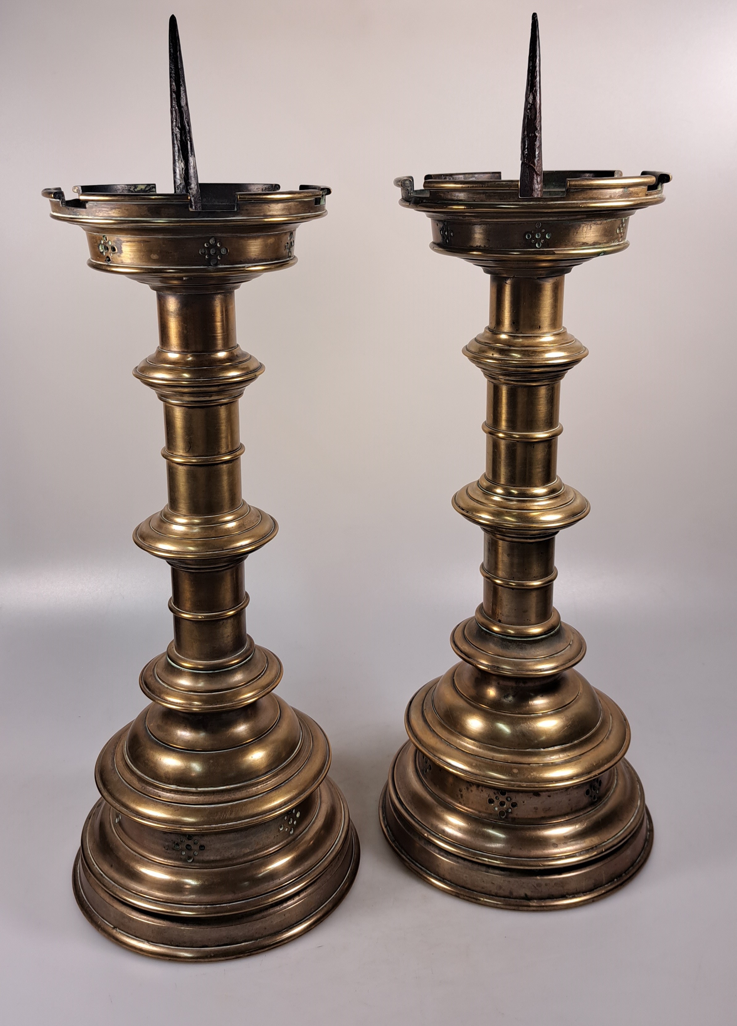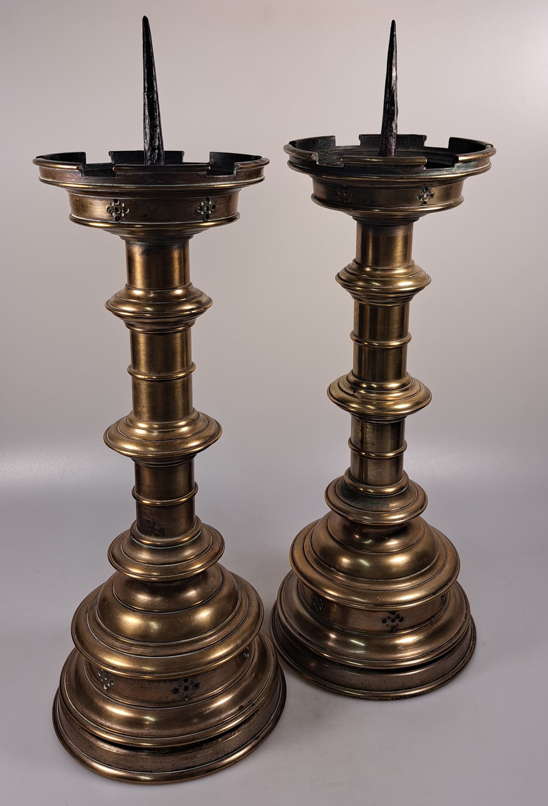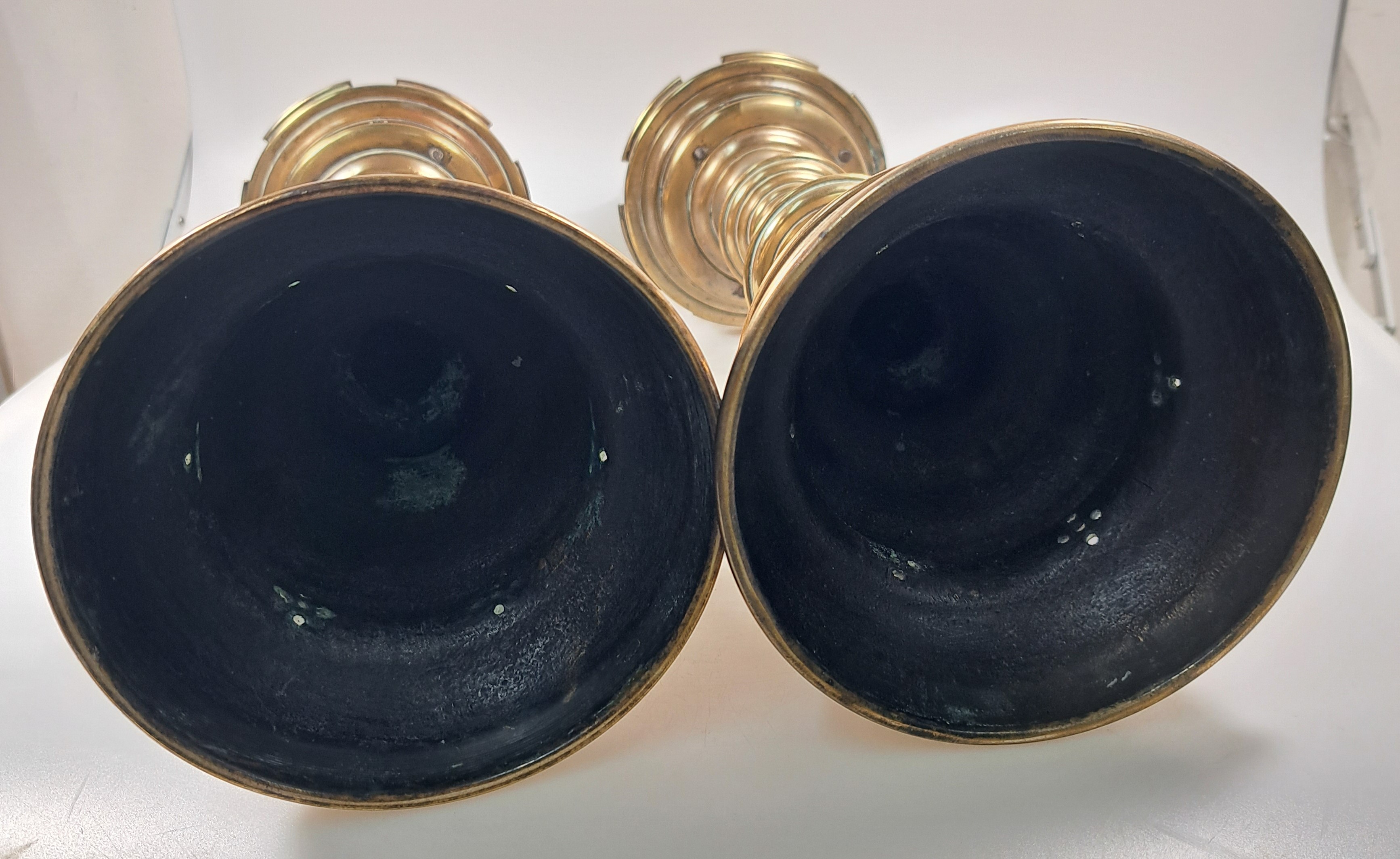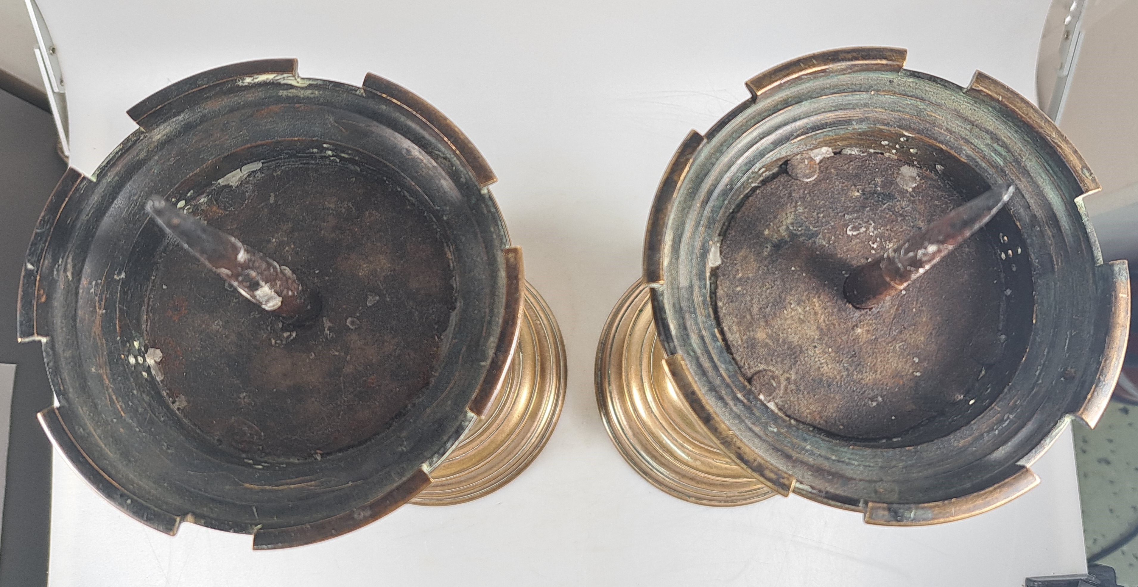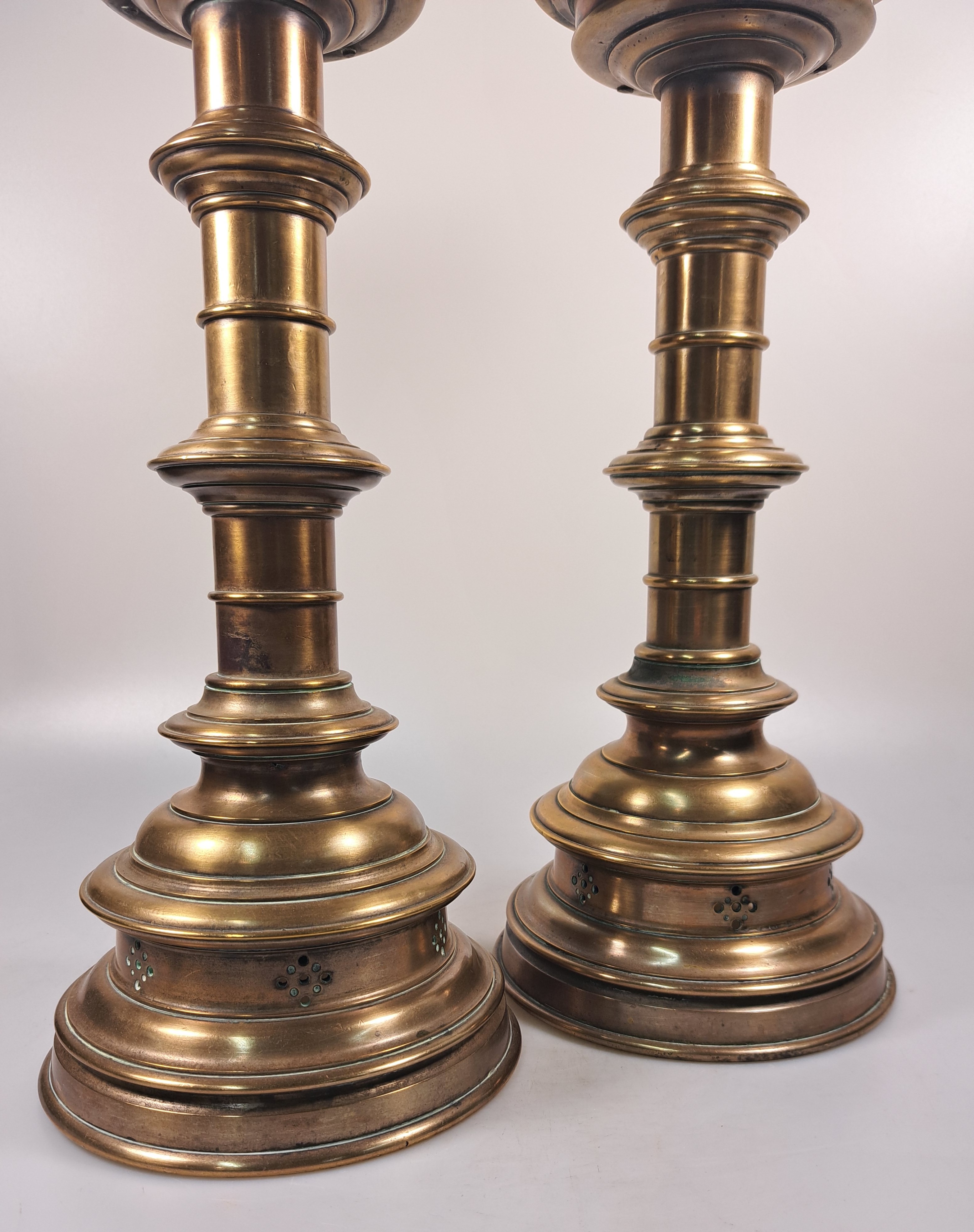 Paar große Scheibenleucher, Barock, 18. Jh., Bronze, stufiger Rundfuß mit gewulstetem