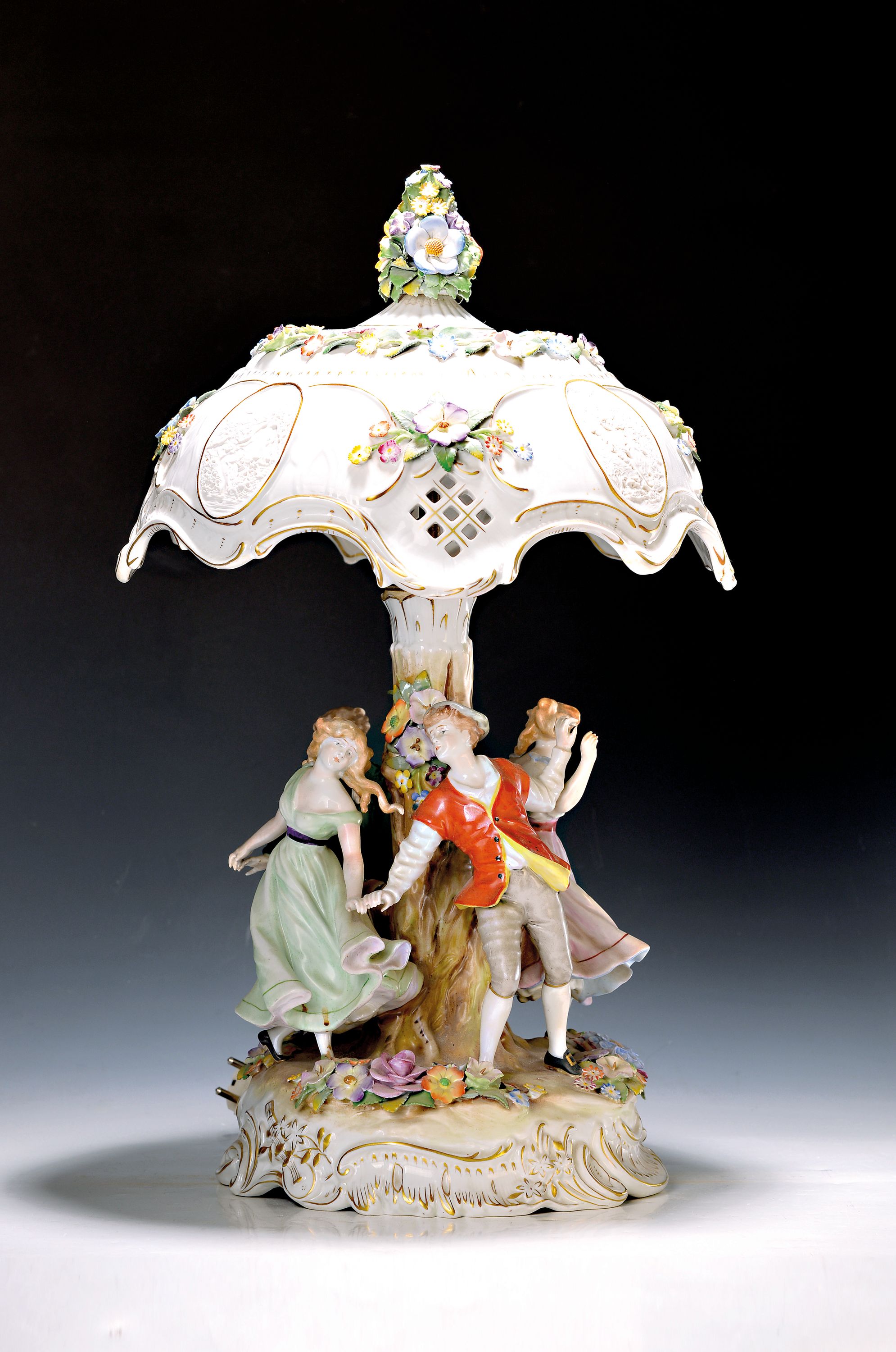 Lithophanielampe, Rudolstadt, 20. Jh., Porzellan, zwei tanzende Paare um Baumstamm,